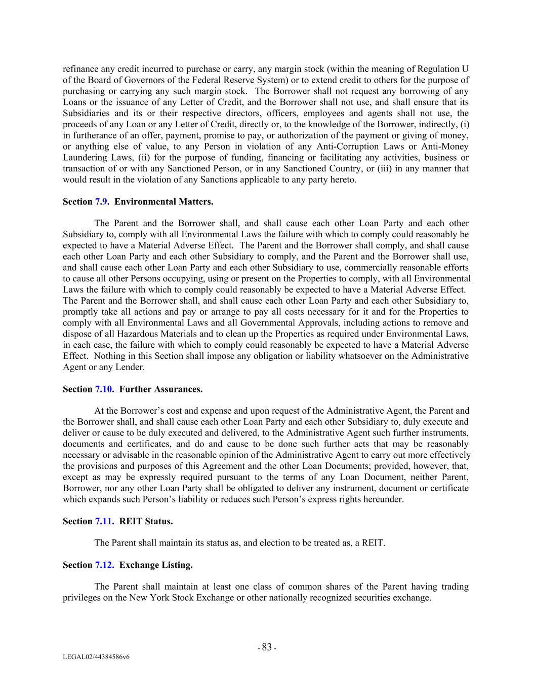refinance any credit incurred to purchase or carry, any margin stock (within the meaning of Regulation U of the Board of Governors of the Federal Reserve System) or to extend credit to others for the purpose of purchasing or carrying any such margin stock. The Borrower shall not request any borrowing of any Loans or the issuance of any Letter of Credit, and the Borrower shall not use, and shall ensure that its Subsidiaries and its or their respective directors, officers, employees and agents shall not use, the proceeds of any Loan or any Letter of Credit, directly or, to the knowledge of the Borrower, indirectly, (i) in furtherance of an offer, payment, promise to pay, or authorization of the payment or giving of money, or anything else of value, to any Person in violation of any Anti-Corruption Laws or Anti-Money Laundering Laws, (ii) for the purpose of funding, financing or facilitating any activities, business or transaction of or with any Sanctioned Person, or in any Sanctioned Country, or (iii) in any manner that would result in the violation of any Sanctions applicable to any party hereto. Section 7.9. Environmental Matters. The Parent and the Borrower shall, and shall cause each other Loan Party and each other Subsidiary to, comply with all Environmental Laws the failure with which to comply could reasonably be expected to have a Material Adverse Effect. The Parent and the Borrower shall comply, and shall cause each other Loan Party and each other Subsidiary to comply, and the Parent and the Borrower shall use, and shall cause each other Loan Party and each other Subsidiary to use, commercially reasonable efforts to cause all other Persons occupying, using or present on the Properties to comply, with all Environmental Laws the failure with which to comply could reasonably be expected to have a Material Adverse Effect. The Parent and the Borrower shall, and shall cause each other Loan Party and each other Subsidiary to, promptly take all actions and pay or arrange to pay all costs necessary for it and for the Properties to comply with all Environmental Laws and all Governmental Approvals, including actions to remove and dispose of all Hazardous Materials and to clean up the Properties as required under Environmental Laws, in each case, the failure with which to comply could reasonably be expected to have a Material Adverse Effect. Nothing in this Section shall impose any obligation or liability whatsoever on the Administrative Agent or any Lender. Section 7.10. Further Assurances. At the Borrower’s cost and expense and upon request of the Administrative Agent, the Parent and the Borrower shall, and shall cause each other Loan Party and each other Subsidiary to, duly execute and deliver or cause to be duly executed and delivered, to the Administrative Agent such further instruments, documents and certificates, and do and cause to be done such further acts that may be reasonably necessary or advisable in the reasonable opinion of the Administrative Agent to carry out more effectively the provisions and purposes of this Agreement and the other Loan Documents; provided, however, that, except as may be expressly required pursuant to the terms of any Loan Document, neither Parent, Borrower, nor any other Loan Party shall be obligated to deliver any instrument, document or certificate which expands such Person’s liability or reduces such Person’s express rights hereunder. Section 7.11. REIT Status. The Parent shall maintain its status as, and election to be treated as, a REIT. Section 7.12. Exchange Listing. The Parent shall maintain at least one class of common shares of the Parent having trading privileges on the New York Stock Exchange or other nationally recognized securities exchange. - 83 - LEGAL02/44384586v6