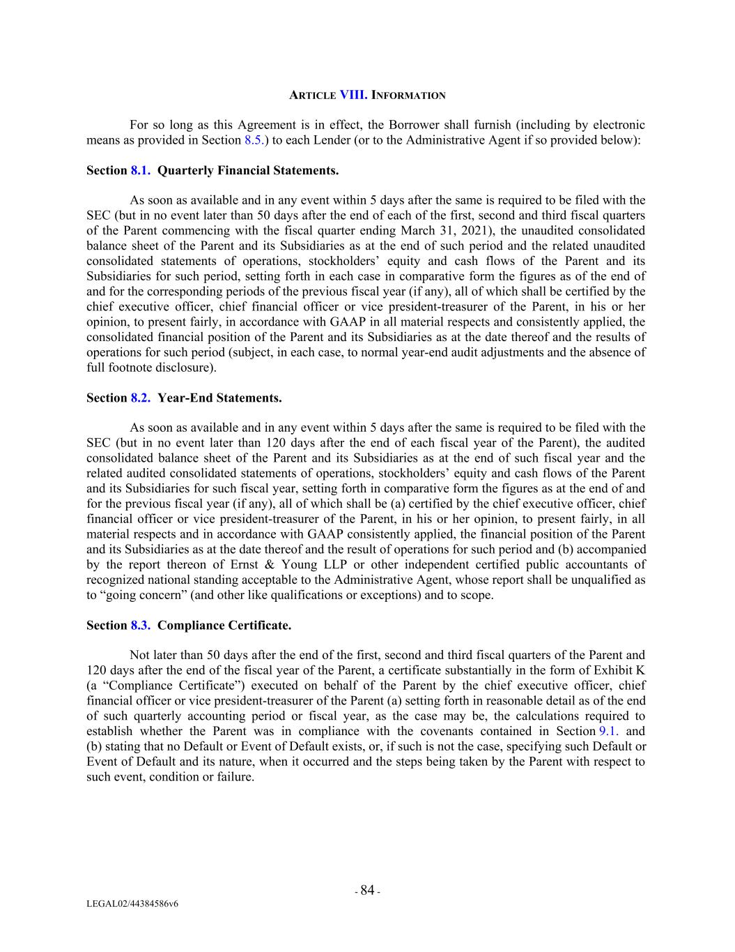 ARTICLE VIII. INFORMATION For so long as this Agreement is in effect, the Borrower shall furnish (including by electronic means as provided in Section 8.5.) to each Lender (or to the Administrative Agent if so provided below): Section 8.1. Quarterly Financial Statements. As soon as available and in any event within 5 days after the same is required to be filed with the SEC (but in no event later than 50 days after the end of each of the first, second and third fiscal quarters of the Parent commencing with the fiscal quarter ending March 31, 2021), the unaudited consolidated balance sheet of the Parent and its Subsidiaries as at the end of such period and the related unaudited consolidated statements of operations, stockholders’ equity and cash flows of the Parent and its Subsidiaries for such period, setting forth in each case in comparative form the figures as of the end of and for the corresponding periods of the previous fiscal year (if any), all of which shall be certified by the chief executive officer, chief financial officer or vice president-treasurer of the Parent, in his or her opinion, to present fairly, in accordance with GAAP in all material respects and consistently applied, the consolidated financial position of the Parent and its Subsidiaries as at the date thereof and the results of operations for such period (subject, in each case, to normal year-end audit adjustments and the absence of full footnote disclosure). Section 8.2. Year-End Statements. As soon as available and in any event within 5 days after the same is required to be filed with the SEC (but in no event later than 120 days after the end of each fiscal year of the Parent), the audited consolidated balance sheet of the Parent and its Subsidiaries as at the end of such fiscal year and the related audited consolidated statements of operations, stockholders’ equity and cash flows of the Parent and its Subsidiaries for such fiscal year, setting forth in comparative form the figures as at the end of and for the previous fiscal year (if any), all of which shall be (a) certified by the chief executive officer, chief financial officer or vice president-treasurer of the Parent, in his or her opinion, to present fairly, in all material respects and in accordance with GAAP consistently applied, the financial position of the Parent and its Subsidiaries as at the date thereof and the result of operations for such period and (b) accompanied by the report thereon of Ernst & Young LLP or other independent certified public accountants of recognized national standing acceptable to the Administrative Agent, whose report shall be unqualified as to “going concern” (and other like qualifications or exceptions) and to scope. Section 8.3. Compliance Certificate. Not later than 50 days after the end of the first, second and third fiscal quarters of the Parent and 120 days after the end of the fiscal year of the Parent, a certificate substantially in the form of Exhibit K (a “Compliance Certificate”) executed on behalf of the Parent by the chief executive officer, chief financial officer or vice president-treasurer of the Parent (a) setting forth in reasonable detail as of the end of such quarterly accounting period or fiscal year, as the case may be, the calculations required to establish whether the Parent was in compliance with the covenants contained in Section 9.1. and (b) stating that no Default or Event of Default exists, or, if such is not the case, specifying such Default or Event of Default and its nature, when it occurred and the steps being taken by the Parent with respect to such event, condition or failure. - 84 - LEGAL02/44384586v6
