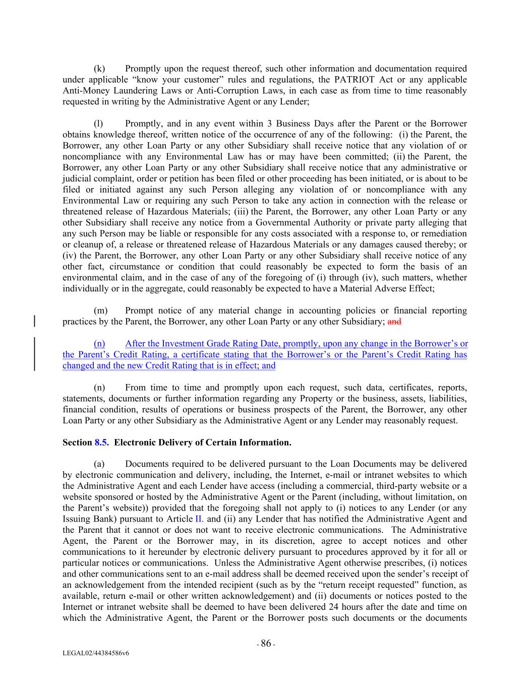(k) Promptly upon the request thereof, such other information and documentation required under applicable “know your customer” rules and regulations, the PATRIOT Act or any applicable Anti-Money Laundering Laws or Anti-Corruption Laws, in each case as from time to time reasonably requested in writing by the Administrative Agent or any Lender; (l) Promptly, and in any event within 3 Business Days after the Parent or the Borrower obtains knowledge thereof, written notice of the occurrence of any of the following: (i) the Parent, the Borrower, any other Loan Party or any other Subsidiary shall receive notice that any violation of or noncompliance with any Environmental Law has or may have been committed; (ii) the Parent, the Borrower, any other Loan Party or any other Subsidiary shall receive notice that any administrative or judicial complaint, order or petition has been filed or other proceeding has been initiated, or is about to be filed or initiated against any such Person alleging any violation of or noncompliance with any Environmental Law or requiring any such Person to take any action in connection with the release or threatened release of Hazardous Materials; (iii) the Parent, the Borrower, any other Loan Party or any other Subsidiary shall receive any notice from a Governmental Authority or private party alleging that any such Person may be liable or responsible for any costs associated with a response to, or remediation or cleanup of, a release or threatened release of Hazardous Materials or any damages caused thereby; or (iv) the Parent, the Borrower, any other Loan Party or any other Subsidiary shall receive notice of any other fact, circumstance or condition that could reasonably be expected to form the basis of an environmental claim, and in the case of any of the foregoing of (i) through (iv), such matters, whether individually or in the aggregate, could reasonably be expected to have a Material Adverse Effect; (m) Prompt notice of any material change in accounting policies or financial reporting practices by the Parent, the Borrower, any other Loan Party or any other Subsidiary; and (n) After the Investment Grade Rating Date, promptly, upon any change in the Borrower’s or the Parent’s Credit Rating, a certificate stating that the Borrower’s or the Parent’s Credit Rating has changed and the new Credit Rating that is in effect; and (n) From time to time and promptly upon each request, such data, certificates, reports, statements, documents or further information regarding any Property or the business, assets, liabilities, financial condition, results of operations or business prospects of the Parent, the Borrower, any other Loan Party or any other Subsidiary as the Administrative Agent or any Lender may reasonably request. Section 8.5. Electronic Delivery of Certain Information. (a) Documents required to be delivered pursuant to the Loan Documents may be delivered by electronic communication and delivery, including, the Internet, e-mail or intranet websites to which the Administrative Agent and each Lender have access (including a commercial, third-party website or a website sponsored or hosted by the Administrative Agent or the Parent (including, without limitation, on the Parent’s website)) provided that the foregoing shall not apply to (i) notices to any Lender (or any Issuing Bank) pursuant to Article II. and (ii) any Lender that has notified the Administrative Agent and the Parent that it cannot or does not want to receive electronic communications. The Administrative Agent, the Parent or the Borrower may, in its discretion, agree to accept notices and other communications to it hereunder by electronic delivery pursuant to procedures approved by it for all or particular notices or communications. Unless the Administrative Agent otherwise prescribes, (i) notices and other communications sent to an e-mail address shall be deemed received upon the sender’s receipt of an acknowledgement from the intended recipient (such as by the “return receipt requested” function, as available, return e-mail or other written acknowledgement) and (ii) documents or notices posted to the Internet or intranet website shall be deemed to have been delivered 24 hours after the date and time on which the Administrative Agent, the Parent or the Borrower posts such documents or the documents - 86 - LEGAL02/44384586v6