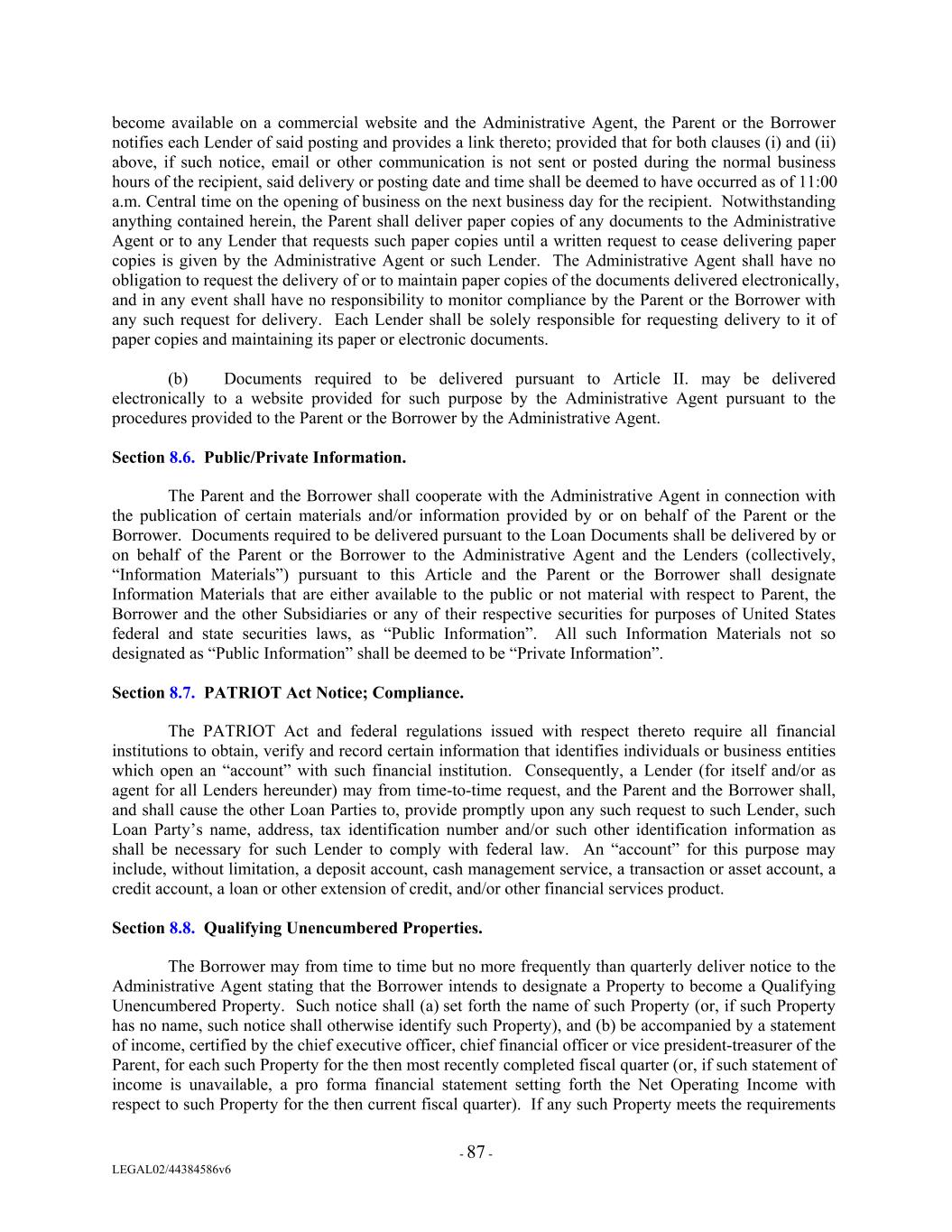 become available on a commercial website and the Administrative Agent, the Parent or the Borrower notifies each Lender of said posting and provides a link thereto; provided that for both clauses (i) and (ii) above, if such notice, email or other communication is not sent or posted during the normal business hours of the recipient, said delivery or posting date and time shall be deemed to have occurred as of 11:00 a.m. Central time on the opening of business on the next business day for the recipient. Notwithstanding anything contained herein, the Parent shall deliver paper copies of any documents to the Administrative Agent or to any Lender that requests such paper copies until a written request to cease delivering paper copies is given by the Administrative Agent or such Lender. The Administrative Agent shall have no obligation to request the delivery of or to maintain paper copies of the documents delivered electronically, and in any event shall have no responsibility to monitor compliance by the Parent or the Borrower with any such request for delivery. Each Lender shall be solely responsible for requesting delivery to it of paper copies and maintaining its paper or electronic documents. (b) Documents required to be delivered pursuant to Article II. may be delivered electronically to a website provided for such purpose by the Administrative Agent pursuant to the procedures provided to the Parent or the Borrower by the Administrative Agent. Section 8.6. Public/Private Information. The Parent and the Borrower shall cooperate with the Administrative Agent in connection with the publication of certain materials and/or information provided by or on behalf of the Parent or the Borrower. Documents required to be delivered pursuant to the Loan Documents shall be delivered by or on behalf of the Parent or the Borrower to the Administrative Agent and the Lenders (collectively, “Information Materials”) pursuant to this Article and the Parent or the Borrower shall designate Information Materials that are either available to the public or not material with respect to Parent, the Borrower and the other Subsidiaries or any of their respective securities for purposes of United States federal and state securities laws, as “Public Information”. All such Information Materials not so designated as “Public Information” shall be deemed to be “Private Information”. Section 8.7. PATRIOT Act Notice; Compliance. The PATRIOT Act and federal regulations issued with respect thereto require all financial institutions to obtain, verify and record certain information that identifies individuals or business entities which open an “account” with such financial institution. Consequently, a Lender (for itself and/or as agent for all Lenders hereunder) may from time-to-time request, and the Parent and the Borrower shall, and shall cause the other Loan Parties to, provide promptly upon any such request to such Lender, such Loan Party’s name, address, tax identification number and/or such other identification information as shall be necessary for such Lender to comply with federal law. An “account” for this purpose may include, without limitation, a deposit account, cash management service, a transaction or asset account, a credit account, a loan or other extension of credit, and/or other financial services product. Section 8.8. Qualifying Unencumbered Properties. The Borrower may from time to time but no more frequently than quarterly deliver notice to the Administrative Agent stating that the Borrower intends to designate a Property to become a Qualifying Unencumbered Property. Such notice shall (a) set forth the name of such Property (or, if such Property has no name, such notice shall otherwise identify such Property), and (b) be accompanied by a statement of income, certified by the chief executive officer, chief financial officer or vice president-treasurer of the Parent, for each such Property for the then most recently completed fiscal quarter (or, if such statement of income is unavailable, a pro forma financial statement setting forth the Net Operating Income with respect to such Property for the then current fiscal quarter). If any such Property meets the requirements - 87 - LEGAL02/44384586v6