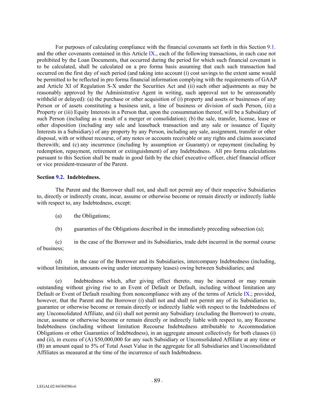 For purposes of calculating compliance with the financial covenants set forth in this Section 9.1. and the other covenants contained in this Article IX., each of the following transactions, in each case not prohibited by the Loan Documents, that occurred during the period for which such financial covenant is to be calculated, shall be calculated on a pro forma basis assuming that each such transaction had occurred on the first day of such period (and taking into account (i) cost savings to the extent same would be permitted to be reflected in pro forma financial information complying with the requirements of GAAP and Article XI of Regulation S-X under the Securities Act and (ii) such other adjustments as may be reasonably approved by the Administrative Agent in writing, such approval not to be unreasonably withheld or delayed): (a) the purchase or other acquisition of (i) property and assets or businesses of any Person or of assets constituting a business unit, a line of business or division of such Person, (ii) a Property or (iii) Equity Interests in a Person that, upon the consummation thereof, will be a Subsidiary of such Person (including as a result of a merger or consolidation); (b) the sale, transfer, license, lease or other disposition (including any sale and leaseback transaction and any sale or issuance of Equity Interests in a Subsidiary) of any property by any Person, including any sale, assignment, transfer or other disposal, with or without recourse, of any notes or accounts receivable or any rights and claims associated therewith; and (c) any incurrence (including by assumption or Guaranty) or repayment (including by redemption, repayment, retirement or extinguishment) of any Indebtedness. All pro forma calculations pursuant to this Section shall be made in good faith by the chief executive officer, chief financial officer or vice president-treasurer of the Parent. Section 9.2. Indebtedness. The Parent and the Borrower shall not, and shall not permit any of their respective Subsidiaries to, directly or indirectly create, incur, assume or otherwise become or remain directly or indirectly liable with respect to, any Indebtedness, except: (a) the Obligations; (b) guaranties of the Obligations described in the immediately preceding subsection (a); (c) in the case of the Borrower and its Subsidiaries, trade debt incurred in the normal course of business; (d) in the case of the Borrower and its Subsidiaries, intercompany Indebtedness (including, without limitation, amounts owing under intercompany leases) owing between Subsidiaries; and (e) Indebtedness which, after giving effect thereto, may be incurred or may remain outstanding without giving rise to an Event of Default or Default, including without limitation any Default or Event of Default resulting from noncompliance with any of the terms of Article IX.; provided, however, that the Parent and the Borrower (i) shall not and shall not permit any of its Subsidiaries to, guarantee or otherwise become or remain directly or indirectly liable with respect to the Indebtedness of any Unconsolidated Affiliate, and (ii) shall not permit any Subsidiary (excluding the Borrower) to create, incur, assume or otherwise become or remain directly or indirectly liable with respect to, any Recourse Indebtedness (including without limitation Recourse Indebtedness attributable to Accommodation Obligations or other Guaranties of Indebtedness), in an aggregate amount collectively for both clauses (i) and (ii), in excess of (A) $50,000,000 for any such Subsidiary or Unconsolidated Affiliate at any time or (B) an amount equal to 5% of Total Asset Value in the aggregate for all Subsidiaries and Unconsolidated Affiliates as measured at the time of the incurrence of such Indebtedness. - 89 - LEGAL02/44384586v6