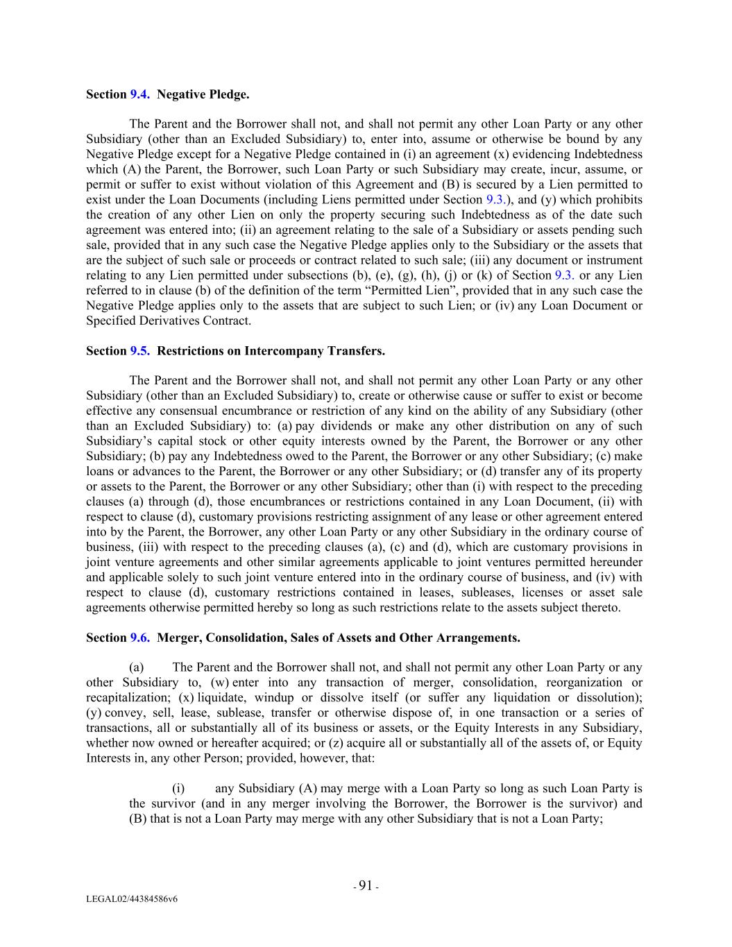 Section 9.4. Negative Pledge. The Parent and the Borrower shall not, and shall not permit any other Loan Party or any other Subsidiary (other than an Excluded Subsidiary) to, enter into, assume or otherwise be bound by any Negative Pledge except for a Negative Pledge contained in (i) an agreement (x) evidencing Indebtedness which (A) the Parent, the Borrower, such Loan Party or such Subsidiary may create, incur, assume, or permit or suffer to exist without violation of this Agreement and (B) is secured by a Lien permitted to exist under the Loan Documents (including Liens permitted under Section 9.3.), and (y) which prohibits the creation of any other Lien on only the property securing such Indebtedness as of the date such agreement was entered into; (ii) an agreement relating to the sale of a Subsidiary or assets pending such sale, provided that in any such case the Negative Pledge applies only to the Subsidiary or the assets that are the subject of such sale or proceeds or contract related to such sale; (iii) any document or instrument relating to any Lien permitted under subsections (b), (e), (g), (h), (j) or (k) of Section 9.3. or any Lien referred to in clause (b) of the definition of the term “Permitted Lien”, provided that in any such case the Negative Pledge applies only to the assets that are subject to such Lien; or (iv) any Loan Document or Specified Derivatives Contract. Section 9.5. Restrictions on Intercompany Transfers. The Parent and the Borrower shall not, and shall not permit any other Loan Party or any other Subsidiary (other than an Excluded Subsidiary) to, create or otherwise cause or suffer to exist or become effective any consensual encumbrance or restriction of any kind on the ability of any Subsidiary (other than an Excluded Subsidiary) to: (a) pay dividends or make any other distribution on any of such Subsidiary’s capital stock or other equity interests owned by the Parent, the Borrower or any other Subsidiary; (b) pay any Indebtedness owed to the Parent, the Borrower or any other Subsidiary; (c) make loans or advances to the Parent, the Borrower or any other Subsidiary; or (d) transfer any of its property or assets to the Parent, the Borrower or any other Subsidiary; other than (i) with respect to the preceding clauses (a) through (d), those encumbrances or restrictions contained in any Loan Document, (ii) with respect to clause (d), customary provisions restricting assignment of any lease or other agreement entered into by the Parent, the Borrower, any other Loan Party or any other Subsidiary in the ordinary course of business, (iii) with respect to the preceding clauses (a), (c) and (d), which are customary provisions in joint venture agreements and other similar agreements applicable to joint ventures permitted hereunder and applicable solely to such joint venture entered into in the ordinary course of business, and (iv) with respect to clause (d), customary restrictions contained in leases, subleases, licenses or asset sale agreements otherwise permitted hereby so long as such restrictions relate to the assets subject thereto. Section 9.6. Merger, Consolidation, Sales of Assets and Other Arrangements. (a) The Parent and the Borrower shall not, and shall not permit any other Loan Party or any other Subsidiary to, (w) enter into any transaction of merger, consolidation, reorganization or recapitalization; (x) liquidate, windup or dissolve itself (or suffer any liquidation or dissolution); (y) convey, sell, lease, sublease, transfer or otherwise dispose of, in one transaction or a series of transactions, all or substantially all of its business or assets, or the Equity Interests in any Subsidiary, whether now owned or hereafter acquired; or (z) acquire all or substantially all of the assets of, or Equity Interests in, any other Person; provided, however, that: (i) any Subsidiary (A) may merge with a Loan Party so long as such Loan Party is the survivor (and in any merger involving the Borrower, the Borrower is the survivor) and (B) that is not a Loan Party may merge with any other Subsidiary that is not a Loan Party; - 91 - LEGAL02/44384586v6