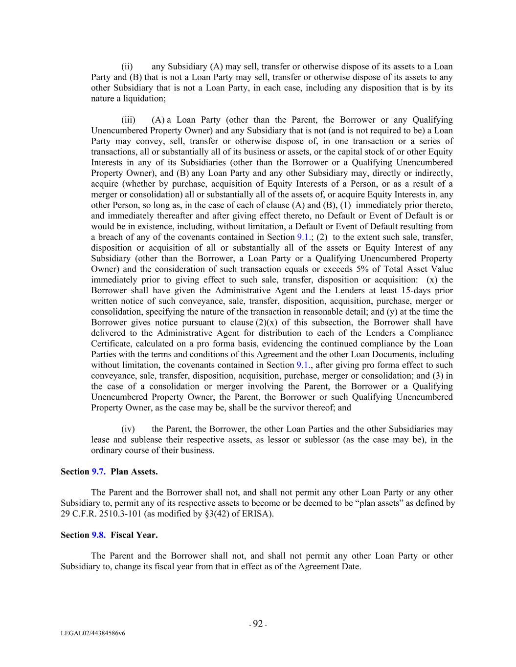 (ii) any Subsidiary (A) may sell, transfer or otherwise dispose of its assets to a Loan Party and (B) that is not a Loan Party may sell, transfer or otherwise dispose of its assets to any other Subsidiary that is not a Loan Party, in each case, including any disposition that is by its nature a liquidation; (iii) (A) a Loan Party (other than the Parent, the Borrower or any Qualifying Unencumbered Property Owner) and any Subsidiary that is not (and is not required to be) a Loan Party may convey, sell, transfer or otherwise dispose of, in one transaction or a series of transactions, all or substantially all of its business or assets, or the capital stock of or other Equity Interests in any of its Subsidiaries (other than the Borrower or a Qualifying Unencumbered Property Owner), and (B) any Loan Party and any other Subsidiary may, directly or indirectly, acquire (whether by purchase, acquisition of Equity Interests of a Person, or as a result of a merger or consolidation) all or substantially all of the assets of, or acquire Equity Interests in, any other Person, so long as, in the case of each of clause (A) and (B), (1) immediately prior thereto, and immediately thereafter and after giving effect thereto, no Default or Event of Default is or would be in existence, including, without limitation, a Default or Event of Default resulting from a breach of any of the covenants contained in Section 9.1.; (2) to the extent such sale, transfer, disposition or acquisition of all or substantially all of the assets or Equity Interest of any Subsidiary (other than the Borrower, a Loan Party or a Qualifying Unencumbered Property Owner) and the consideration of such transaction equals or exceeds 5% of Total Asset Value immediately prior to giving effect to such sale, transfer, disposition or acquisition: (x) the Borrower shall have given the Administrative Agent and the Lenders at least 15-days prior written notice of such conveyance, sale, transfer, disposition, acquisition, purchase, merger or consolidation, specifying the nature of the transaction in reasonable detail; and (y) at the time the Borrower gives notice pursuant to clause (2)(x) of this subsection, the Borrower shall have delivered to the Administrative Agent for distribution to each of the Lenders a Compliance Certificate, calculated on a pro forma basis, evidencing the continued compliance by the Loan Parties with the terms and conditions of this Agreement and the other Loan Documents, including without limitation, the covenants contained in Section 9.1., after giving pro forma effect to such conveyance, sale, transfer, disposition, acquisition, purchase, merger or consolidation; and (3) in the case of a consolidation or merger involving the Parent, the Borrower or a Qualifying Unencumbered Property Owner, the Parent, the Borrower or such Qualifying Unencumbered Property Owner, as the case may be, shall be the survivor thereof; and (iv) the Parent, the Borrower, the other Loan Parties and the other Subsidiaries may lease and sublease their respective assets, as lessor or sublessor (as the case may be), in the ordinary course of their business. Section 9.7. Plan Assets. The Parent and the Borrower shall not, and shall not permit any other Loan Party or any other Subsidiary to, permit any of its respective assets to become or be deemed to be “plan assets” as defined by 29 C.F.R. 2510.3-101 (as modified by §3(42) of ERISA). Section 9.8. Fiscal Year. The Parent and the Borrower shall not, and shall not permit any other Loan Party or other Subsidiary to, change its fiscal year from that in effect as of the Agreement Date. - 92 - LEGAL02/44384586v6