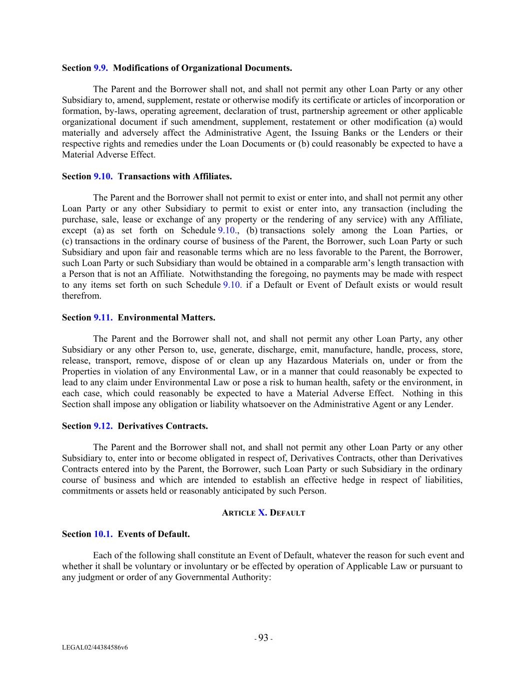 Section 9.9. Modifications of Organizational Documents. The Parent and the Borrower shall not, and shall not permit any other Loan Party or any other Subsidiary to, amend, supplement, restate or otherwise modify its certificate or articles of incorporation or formation, by-laws, operating agreement, declaration of trust, partnership agreement or other applicable organizational document if such amendment, supplement, restatement or other modification (a) would materially and adversely affect the Administrative Agent, the Issuing Banks or the Lenders or their respective rights and remedies under the Loan Documents or (b) could reasonably be expected to have a Material Adverse Effect. Section 9.10. Transactions with Affiliates. The Parent and the Borrower shall not permit to exist or enter into, and shall not permit any other Loan Party or any other Subsidiary to permit to exist or enter into, any transaction (including the purchase, sale, lease or exchange of any property or the rendering of any service) with any Affiliate, except (a) as set forth on Schedule 9.10., (b) transactions solely among the Loan Parties, or (c) transactions in the ordinary course of business of the Parent, the Borrower, such Loan Party or such Subsidiary and upon fair and reasonable terms which are no less favorable to the Parent, the Borrower, such Loan Party or such Subsidiary than would be obtained in a comparable arm’s length transaction with a Person that is not an Affiliate. Notwithstanding the foregoing, no payments may be made with respect to any items set forth on such Schedule 9.10. if a Default or Event of Default exists or would result therefrom. Section 9.11. Environmental Matters. The Parent and the Borrower shall not, and shall not permit any other Loan Party, any other Subsidiary or any other Person to, use, generate, discharge, emit, manufacture, handle, process, store, release, transport, remove, dispose of or clean up any Hazardous Materials on, under or from the Properties in violation of any Environmental Law, or in a manner that could reasonably be expected to lead to any claim under Environmental Law or pose a risk to human health, safety or the environment, in each case, which could reasonably be expected to have a Material Adverse Effect. Nothing in this Section shall impose any obligation or liability whatsoever on the Administrative Agent or any Lender. Section 9.12. Derivatives Contracts. The Parent and the Borrower shall not, and shall not permit any other Loan Party or any other Subsidiary to, enter into or become obligated in respect of, Derivatives Contracts, other than Derivatives Contracts entered into by the Parent, the Borrower, such Loan Party or such Subsidiary in the ordinary course of business and which are intended to establish an effective hedge in respect of liabilities, commitments or assets held or reasonably anticipated by such Person. ARTICLE X. DEFAULT Section 10.1. Events of Default. Each of the following shall constitute an Event of Default, whatever the reason for such event and whether it shall be voluntary or involuntary or be effected by operation of Applicable Law or pursuant to any judgment or order of any Governmental Authority: - 93 - LEGAL02/44384586v6