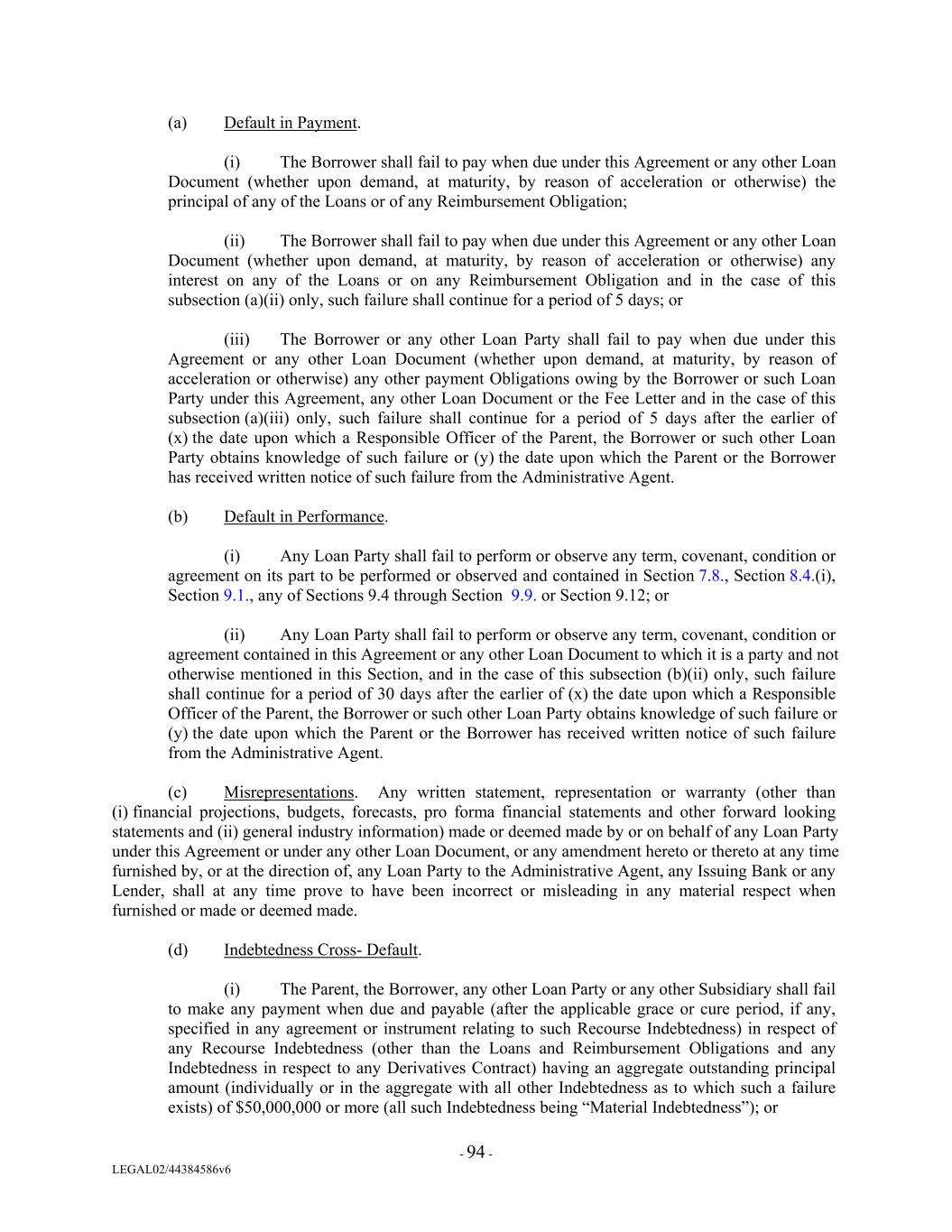 (a) Default in Payment. (i) The Borrower shall fail to pay when due under this Agreement or any other Loan Document (whether upon demand, at maturity, by reason of acceleration or otherwise) the principal of any of the Loans or of any Reimbursement Obligation; (ii) The Borrower shall fail to pay when due under this Agreement or any other Loan Document (whether upon demand, at maturity, by reason of acceleration or otherwise) any interest on any of the Loans or on any Reimbursement Obligation and in the case of this subsection (a)(ii) only, such failure shall continue for a period of 5 days; or (iii) The Borrower or any other Loan Party shall fail to pay when due under this Agreement or any other Loan Document (whether upon demand, at maturity, by reason of acceleration or otherwise) any other payment Obligations owing by the Borrower or such Loan Party under this Agreement, any other Loan Document or the Fee Letter and in the case of this subsection (a)(iii) only, such failure shall continue for a period of 5 days after the earlier of (x) the date upon which a Responsible Officer of the Parent, the Borrower or such other Loan Party obtains knowledge of such failure or (y) the date upon which the Parent or the Borrower has received written notice of such failure from the Administrative Agent. (b) Default in Performance. (i) Any Loan Party shall fail to perform or observe any term, covenant, condition or agreement on its part to be performed or observed and contained in Section 7.8., Section 8.4.(i), Section 9.1., any of Sections 9.4 through Section 9.9. or Section 9.12; or (ii) Any Loan Party shall fail to perform or observe any term, covenant, condition or agreement contained in this Agreement or any other Loan Document to which it is a party and not otherwise mentioned in this Section, and in the case of this subsection (b)(ii) only, such failure shall continue for a period of 30 days after the earlier of (x) the date upon which a Responsible Officer of the Parent, the Borrower or such other Loan Party obtains knowledge of such failure or (y) the date upon which the Parent or the Borrower has received written notice of such failure from the Administrative Agent. (c) Misrepresentations. Any written statement, representation or warranty (other than (i) financial projections, budgets, forecasts, pro forma financial statements and other forward looking statements and (ii) general industry information) made or deemed made by or on behalf of any Loan Party under this Agreement or under any other Loan Document, or any amendment hereto or thereto at any time furnished by, or at the direction of, any Loan Party to the Administrative Agent, any Issuing Bank or any Lender, shall at any time prove to have been incorrect or misleading in any material respect when furnished or made or deemed made. (d) Indebtedness Cross- Default. (i) The Parent, the Borrower, any other Loan Party or any other Subsidiary shall fail to make any payment when due and payable (after the applicable grace or cure period, if any, specified in any agreement or instrument relating to such Recourse Indebtedness) in respect of any Recourse Indebtedness (other than the Loans and Reimbursement Obligations and any Indebtedness in respect to any Derivatives Contract) having an aggregate outstanding principal amount (individually or in the aggregate with all other Indebtedness as to which such a failure exists) of $50,000,000 or more (all such Indebtedness being “Material Indebtedness”); or - 94 - LEGAL02/44384586v6