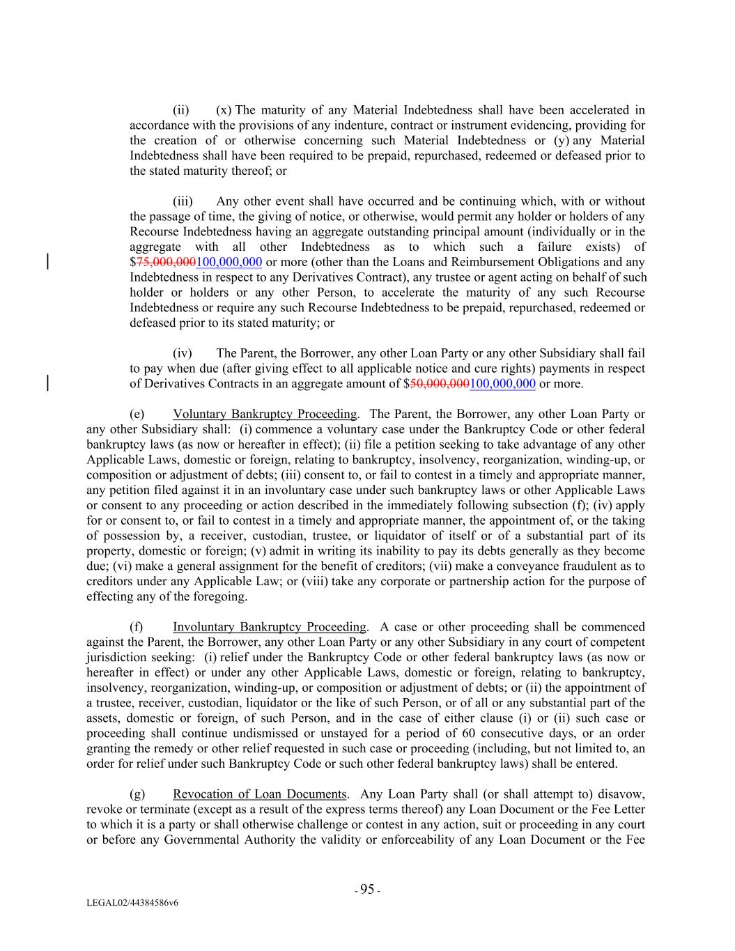 (ii) (x) The maturity of any Material Indebtedness shall have been accelerated in accordance with the provisions of any indenture, contract or instrument evidencing, providing for the creation of or otherwise concerning such Material Indebtedness or (y) any Material Indebtedness shall have been required to be prepaid, repurchased, redeemed or defeased prior to the stated maturity thereof; or (iii) Any other event shall have occurred and be continuing which, with or without the passage of time, the giving of notice, or otherwise, would permit any holder or holders of any Recourse Indebtedness having an aggregate outstanding principal amount (individually or in the aggregate with all other Indebtedness as to which such a failure exists) of $75,000,000100,000,000 or more (other than the Loans and Reimbursement Obligations and any Indebtedness in respect to any Derivatives Contract), any trustee or agent acting on behalf of such holder or holders or any other Person, to accelerate the maturity of any such Recourse Indebtedness or require any such Recourse Indebtedness to be prepaid, repurchased, redeemed or defeased prior to its stated maturity; or (iv) The Parent, the Borrower, any other Loan Party or any other Subsidiary shall fail to pay when due (after giving effect to all applicable notice and cure rights) payments in respect of Derivatives Contracts in an aggregate amount of $50,000,000100,000,000 or more. (e) Voluntary Bankruptcy Proceeding. The Parent, the Borrower, any other Loan Party or any other Subsidiary shall: (i) commence a voluntary case under the Bankruptcy Code or other federal bankruptcy laws (as now or hereafter in effect); (ii) file a petition seeking to take advantage of any other Applicable Laws, domestic or foreign, relating to bankruptcy, insolvency, reorganization, winding-up, or composition or adjustment of debts; (iii) consent to, or fail to contest in a timely and appropriate manner, any petition filed against it in an involuntary case under such bankruptcy laws or other Applicable Laws or consent to any proceeding or action described in the immediately following subsection (f); (iv) apply for or consent to, or fail to contest in a timely and appropriate manner, the appointment of, or the taking of possession by, a receiver, custodian, trustee, or liquidator of itself or of a substantial part of its property, domestic or foreign; (v) admit in writing its inability to pay its debts generally as they become due; (vi) make a general assignment for the benefit of creditors; (vii) make a conveyance fraudulent as to creditors under any Applicable Law; or (viii) take any corporate or partnership action for the purpose of effecting any of the foregoing. (f) Involuntary Bankruptcy Proceeding. A case or other proceeding shall be commenced against the Parent, the Borrower, any other Loan Party or any other Subsidiary in any court of competent jurisdiction seeking: (i) relief under the Bankruptcy Code or other federal bankruptcy laws (as now or hereafter in effect) or under any other Applicable Laws, domestic or foreign, relating to bankruptcy, insolvency, reorganization, winding-up, or composition or adjustment of debts; or (ii) the appointment of a trustee, receiver, custodian, liquidator or the like of such Person, or of all or any substantial part of the assets, domestic or foreign, of such Person, and in the case of either clause (i) or (ii) such case or proceeding shall continue undismissed or unstayed for a period of 60 consecutive days, or an order granting the remedy or other relief requested in such case or proceeding (including, but not limited to, an order for relief under such Bankruptcy Code or such other federal bankruptcy laws) shall be entered. (g) Revocation of Loan Documents. Any Loan Party shall (or shall attempt to) disavow, revoke or terminate (except as a result of the express terms thereof) any Loan Document or the Fee Letter to which it is a party or shall otherwise challenge or contest in any action, suit or proceeding in any court or before any Governmental Authority the validity or enforceability of any Loan Document or the Fee - 95 - LEGAL02/44384586v6
