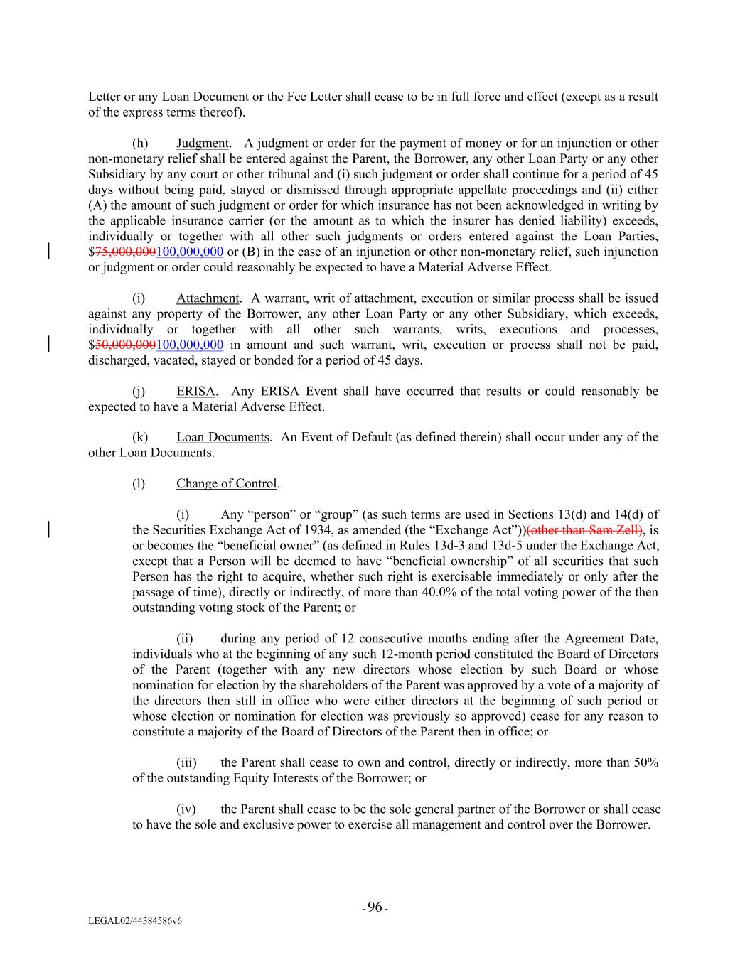 Letter or any Loan Document or the Fee Letter shall cease to be in full force and effect (except as a result of the express terms thereof). (h) Judgment. A judgment or order for the payment of money or for an injunction or other non-monetary relief shall be entered against the Parent, the Borrower, any other Loan Party or any other Subsidiary by any court or other tribunal and (i) such judgment or order shall continue for a period of 45 days without being paid, stayed or dismissed through appropriate appellate proceedings and (ii) either (A) the amount of such judgment or order for which insurance has not been acknowledged in writing by the applicable insurance carrier (or the amount as to which the insurer has denied liability) exceeds, individually or together with all other such judgments or orders entered against the Loan Parties, $75,000,000100,000,000 or (B) in the case of an injunction or other non-monetary relief, such injunction or judgment or order could reasonably be expected to have a Material Adverse Effect. (i) Attachment. A warrant, writ of attachment, execution or similar process shall be issued against any property of the Borrower, any other Loan Party or any other Subsidiary, which exceeds, individually or together with all other such warrants, writs, executions and processes, $50,000,000100,000,000 in amount and such warrant, writ, execution or process shall not be paid, discharged, vacated, stayed or bonded for a period of 45 days. (j) ERISA. Any ERISA Event shall have occurred that results or could reasonably be expected to have a Material Adverse Effect. (k) Loan Documents. An Event of Default (as defined therein) shall occur under any of the other Loan Documents. (l) Change of Control. (i) Any “person” or “group” (as such terms are used in Sections 13(d) and 14(d) of the Securities Exchange Act of 1934, as amended (the “Exchange Act”))(other than Sam Zell), is or becomes the “beneficial owner” (as defined in Rules 13d-3 and 13d-5 under the Exchange Act, except that a Person will be deemed to have “beneficial ownership” of all securities that such Person has the right to acquire, whether such right is exercisable immediately or only after the passage of time), directly or indirectly, of more than 40.0% of the total voting power of the then outstanding voting stock of the Parent; or (ii) during any period of 12 consecutive months ending after the Agreement Date, individuals who at the beginning of any such 12-month period constituted the Board of Directors of the Parent (together with any new directors whose election by such Board or whose nomination for election by the shareholders of the Parent was approved by a vote of a majority of the directors then still in office who were either directors at the beginning of such period or whose election or nomination for election was previously so approved) cease for any reason to constitute a majority of the Board of Directors of the Parent then in office; or (iii) the Parent shall cease to own and control, directly or indirectly, more than 50% of the outstanding Equity Interests of the Borrower; or (iv) the Parent shall cease to be the sole general partner of the Borrower or shall cease to have the sole and exclusive power to exercise all management and control over the Borrower. - 96 - LEGAL02/44384586v6