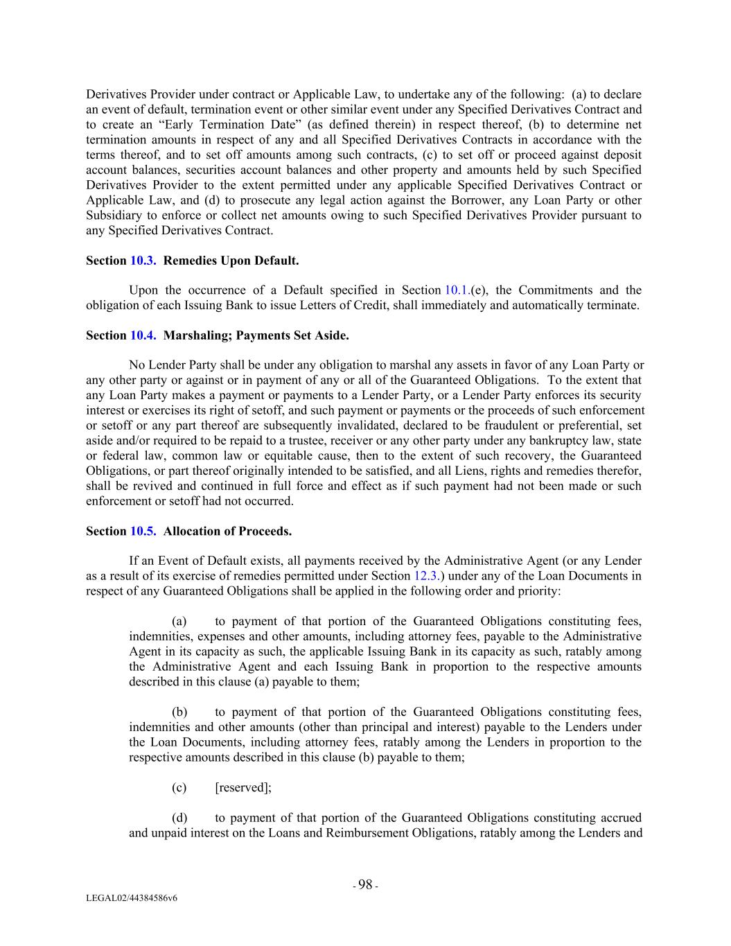 Derivatives Provider under contract or Applicable Law, to undertake any of the following: (a) to declare an event of default, termination event or other similar event under any Specified Derivatives Contract and to create an “Early Termination Date” (as defined therein) in respect thereof, (b) to determine net termination amounts in respect of any and all Specified Derivatives Contracts in accordance with the terms thereof, and to set off amounts among such contracts, (c) to set off or proceed against deposit account balances, securities account balances and other property and amounts held by such Specified Derivatives Provider to the extent permitted under any applicable Specified Derivatives Contract or Applicable Law, and (d) to prosecute any legal action against the Borrower, any Loan Party or other Subsidiary to enforce or collect net amounts owing to such Specified Derivatives Provider pursuant to any Specified Derivatives Contract. Section 10.3. Remedies Upon Default. Upon the occurrence of a Default specified in Section 10.1.(e), the Commitments and the obligation of each Issuing Bank to issue Letters of Credit, shall immediately and automatically terminate. Section 10.4. Marshaling; Payments Set Aside. No Lender Party shall be under any obligation to marshal any assets in favor of any Loan Party or any other party or against or in payment of any or all of the Guaranteed Obligations. To the extent that any Loan Party makes a payment or payments to a Lender Party, or a Lender Party enforces its security interest or exercises its right of setoff, and such payment or payments or the proceeds of such enforcement or setoff or any part thereof are subsequently invalidated, declared to be fraudulent or preferential, set aside and/or required to be repaid to a trustee, receiver or any other party under any bankruptcy law, state or federal law, common law or equitable cause, then to the extent of such recovery, the Guaranteed Obligations, or part thereof originally intended to be satisfied, and all Liens, rights and remedies therefor, shall be revived and continued in full force and effect as if such payment had not been made or such enforcement or setoff had not occurred. Section 10.5. Allocation of Proceeds. If an Event of Default exists, all payments received by the Administrative Agent (or any Lender as a result of its exercise of remedies permitted under Section 12.3.) under any of the Loan Documents in respect of any Guaranteed Obligations shall be applied in the following order and priority: (a) to payment of that portion of the Guaranteed Obligations constituting fees, indemnities, expenses and other amounts, including attorney fees, payable to the Administrative Agent in its capacity as such, the applicable Issuing Bank in its capacity as such, ratably among the Administrative Agent and each Issuing Bank in proportion to the respective amounts described in this clause (a) payable to them; (b) to payment of that portion of the Guaranteed Obligations constituting fees, indemnities and other amounts (other than principal and interest) payable to the Lenders under the Loan Documents, including attorney fees, ratably among the Lenders in proportion to the respective amounts described in this clause (b) payable to them; (c) [reserved]; (d) to payment of that portion of the Guaranteed Obligations constituting accrued and unpaid interest on the Loans and Reimbursement Obligations, ratably among the Lenders and - 98 - LEGAL02/44384586v6