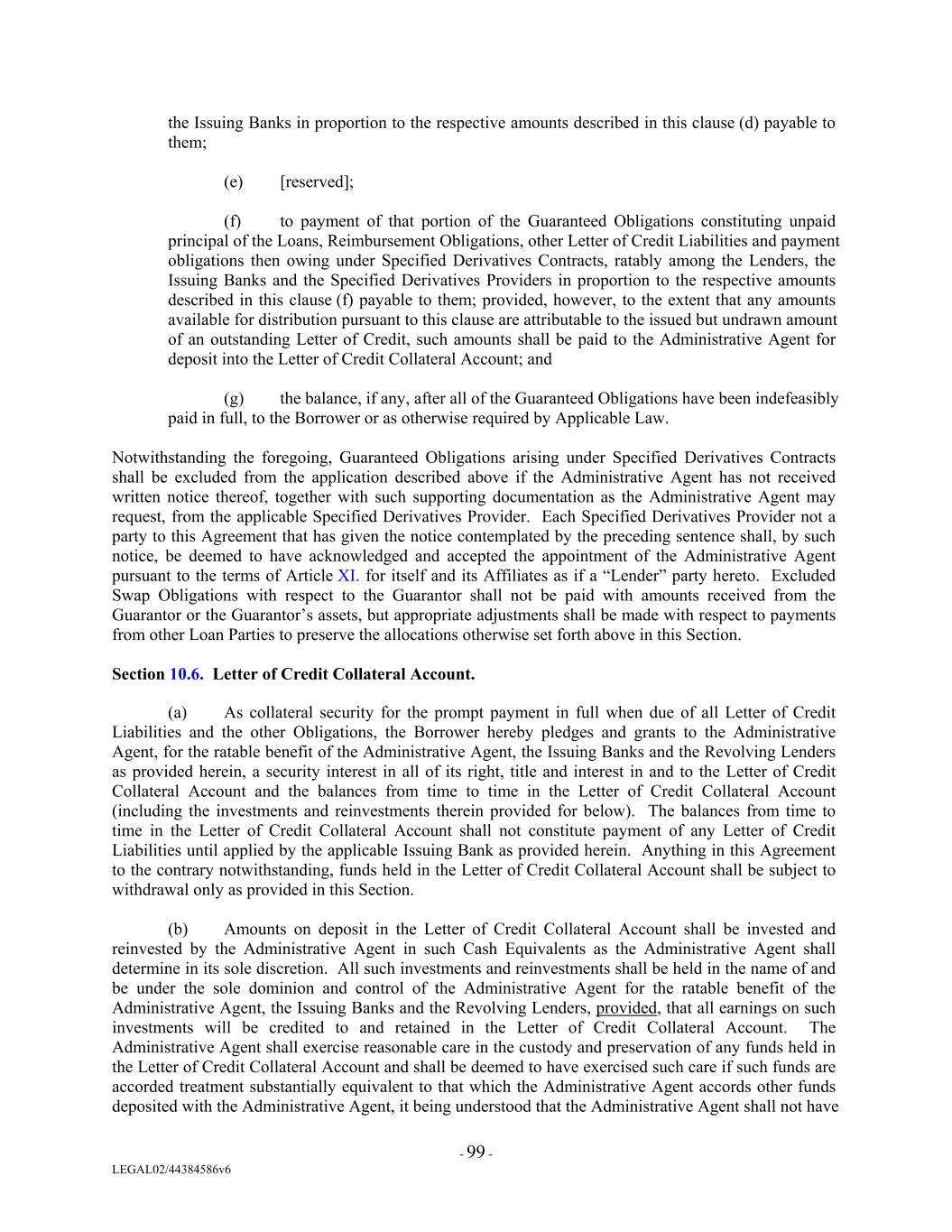 the Issuing Banks in proportion to the respective amounts described in this clause (d) payable to them; (e) [reserved]; (f) to payment of that portion of the Guaranteed Obligations constituting unpaid principal of the Loans, Reimbursement Obligations, other Letter of Credit Liabilities and payment obligations then owing under Specified Derivatives Contracts, ratably among the Lenders, the Issuing Banks and the Specified Derivatives Providers in proportion to the respective amounts described in this clause (f) payable to them; provided, however, to the extent that any amounts available for distribution pursuant to this clause are attributable to the issued but undrawn amount of an outstanding Letter of Credit, such amounts shall be paid to the Administrative Agent for deposit into the Letter of Credit Collateral Account; and (g) the balance, if any, after all of the Guaranteed Obligations have been indefeasibly paid in full, to the Borrower or as otherwise required by Applicable Law. Notwithstanding the foregoing, Guaranteed Obligations arising under Specified Derivatives Contracts shall be excluded from the application described above if the Administrative Agent has not received written notice thereof, together with such supporting documentation as the Administrative Agent may request, from the applicable Specified Derivatives Provider. Each Specified Derivatives Provider not a party to this Agreement that has given the notice contemplated by the preceding sentence shall, by such notice, be deemed to have acknowledged and accepted the appointment of the Administrative Agent pursuant to the terms of Article XI. for itself and its Affiliates as if a “Lender” party hereto. Excluded Swap Obligations with respect to the Guarantor shall not be paid with amounts received from the Guarantor or the Guarantor’s assets, but appropriate adjustments shall be made with respect to payments from other Loan Parties to preserve the allocations otherwise set forth above in this Section. Section 10.6. Letter of Credit Collateral Account. (a) As collateral security for the prompt payment in full when due of all Letter of Credit Liabilities and the other Obligations, the Borrower hereby pledges and grants to the Administrative Agent, for the ratable benefit of the Administrative Agent, the Issuing Banks and the Revolving Lenders as provided herein, a security interest in all of its right, title and interest in and to the Letter of Credit Collateral Account and the balances from time to time in the Letter of Credit Collateral Account (including the investments and reinvestments therein provided for below). The balances from time to time in the Letter of Credit Collateral Account shall not constitute payment of any Letter of Credit Liabilities until applied by the applicable Issuing Bank as provided herein. Anything in this Agreement to the contrary notwithstanding, funds held in the Letter of Credit Collateral Account shall be subject to withdrawal only as provided in this Section. (b) Amounts on deposit in the Letter of Credit Collateral Account shall be invested and reinvested by the Administrative Agent in such Cash Equivalents as the Administrative Agent shall determine in its sole discretion. All such investments and reinvestments shall be held in the name of and be under the sole dominion and control of the Administrative Agent for the ratable benefit of the Administrative Agent, the Issuing Banks and the Revolving Lenders, provided, that all earnings on such investments will be credited to and retained in the Letter of Credit Collateral Account. The Administrative Agent shall exercise reasonable care in the custody and preservation of any funds held in the Letter of Credit Collateral Account and shall be deemed to have exercised such care if such funds are accorded treatment substantially equivalent to that which the Administrative Agent accords other funds deposited with the Administrative Agent, it being understood that the Administrative Agent shall not have - 99 - LEGAL02/44384586v6