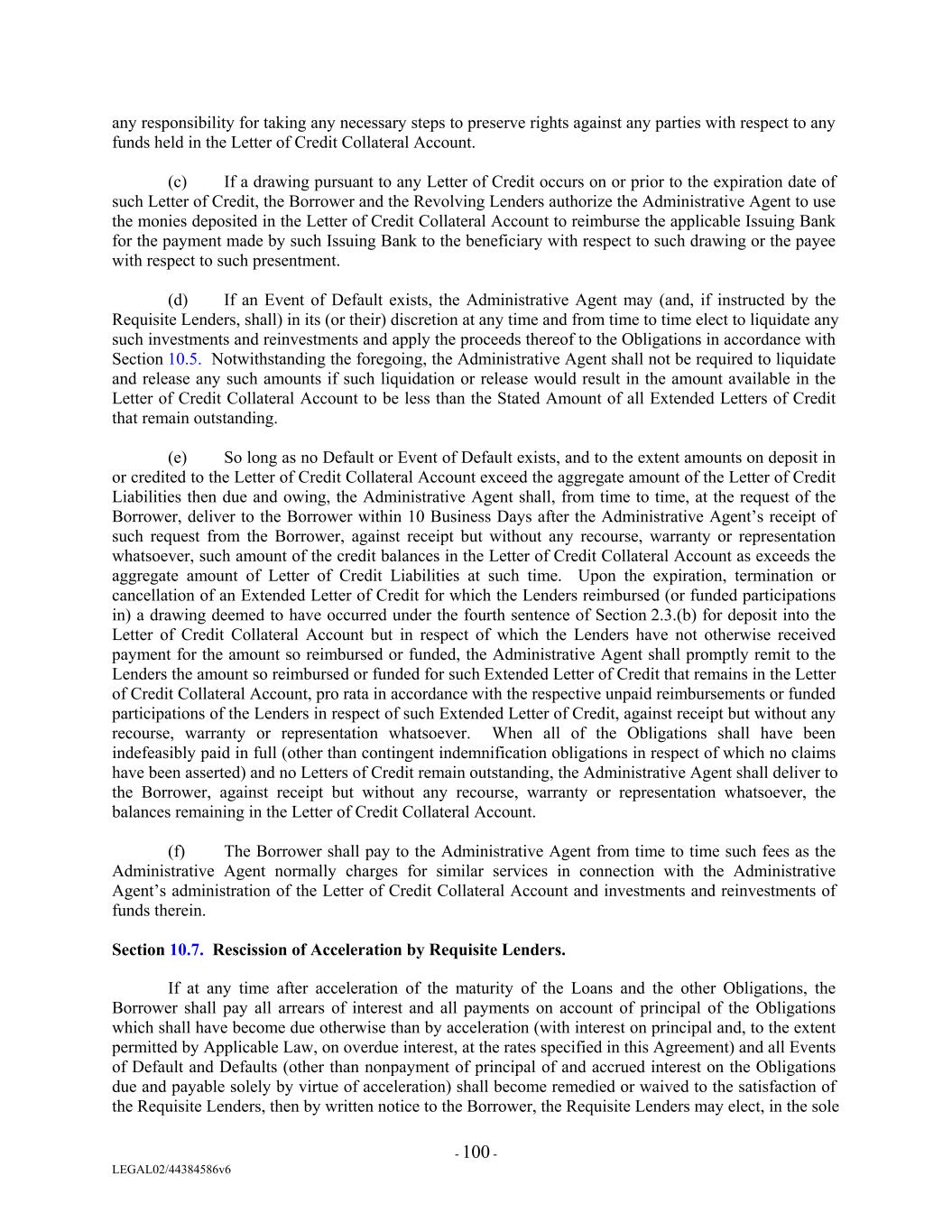 any responsibility for taking any necessary steps to preserve rights against any parties with respect to any funds held in the Letter of Credit Collateral Account. (c) If a drawing pursuant to any Letter of Credit occurs on or prior to the expiration date of such Letter of Credit, the Borrower and the Revolving Lenders authorize the Administrative Agent to use the monies deposited in the Letter of Credit Collateral Account to reimburse the applicable Issuing Bank for the payment made by such Issuing Bank to the beneficiary with respect to such drawing or the payee with respect to such presentment. (d) If an Event of Default exists, the Administrative Agent may (and, if instructed by the Requisite Lenders, shall) in its (or their) discretion at any time and from time to time elect to liquidate any such investments and reinvestments and apply the proceeds thereof to the Obligations in accordance with Section 10.5. Notwithstanding the foregoing, the Administrative Agent shall not be required to liquidate and release any such amounts if such liquidation or release would result in the amount available in the Letter of Credit Collateral Account to be less than the Stated Amount of all Extended Letters of Credit that remain outstanding. (e) So long as no Default or Event of Default exists, and to the extent amounts on deposit in or credited to the Letter of Credit Collateral Account exceed the aggregate amount of the Letter of Credit Liabilities then due and owing, the Administrative Agent shall, from time to time, at the request of the Borrower, deliver to the Borrower within 10 Business Days after the Administrative Agent’s receipt of such request from the Borrower, against receipt but without any recourse, warranty or representation whatsoever, such amount of the credit balances in the Letter of Credit Collateral Account as exceeds the aggregate amount of Letter of Credit Liabilities at such time. Upon the expiration, termination or cancellation of an Extended Letter of Credit for which the Lenders reimbursed (or funded participations in) a drawing deemed to have occurred under the fourth sentence of Section 2.3.(b) for deposit into the Letter of Credit Collateral Account but in respect of which the Lenders have not otherwise received payment for the amount so reimbursed or funded, the Administrative Agent shall promptly remit to the Lenders the amount so reimbursed or funded for such Extended Letter of Credit that remains in the Letter of Credit Collateral Account, pro rata in accordance with the respective unpaid reimbursements or funded participations of the Lenders in respect of such Extended Letter of Credit, against receipt but without any recourse, warranty or representation whatsoever. When all of the Obligations shall have been indefeasibly paid in full (other than contingent indemnification obligations in respect of which no claims have been asserted) and no Letters of Credit remain outstanding, the Administrative Agent shall deliver to the Borrower, against receipt but without any recourse, warranty or representation whatsoever, the balances remaining in the Letter of Credit Collateral Account. (f) The Borrower shall pay to the Administrative Agent from time to time such fees as the Administrative Agent normally charges for similar services in connection with the Administrative Agent’s administration of the Letter of Credit Collateral Account and investments and reinvestments of funds therein. Section 10.7. Rescission of Acceleration by Requisite Lenders. If at any time after acceleration of the maturity of the Loans and the other Obligations, the Borrower shall pay all arrears of interest and all payments on account of principal of the Obligations which shall have become due otherwise than by acceleration (with interest on principal and, to the extent permitted by Applicable Law, on overdue interest, at the rates specified in this Agreement) and all Events of Default and Defaults (other than nonpayment of principal of and accrued interest on the Obligations due and payable solely by virtue of acceleration) shall become remedied or waived to the satisfaction of the Requisite Lenders, then by written notice to the Borrower, the Requisite Lenders may elect, in the sole - 100 - LEGAL02/44384586v6