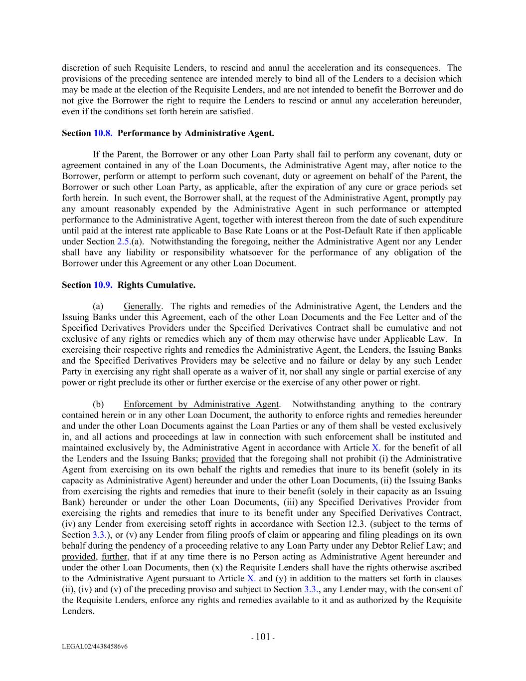 discretion of such Requisite Lenders, to rescind and annul the acceleration and its consequences. The provisions of the preceding sentence are intended merely to bind all of the Lenders to a decision which may be made at the election of the Requisite Lenders, and are not intended to benefit the Borrower and do not give the Borrower the right to require the Lenders to rescind or annul any acceleration hereunder, even if the conditions set forth herein are satisfied. Section 10.8. Performance by Administrative Agent. If the Parent, the Borrower or any other Loan Party shall fail to perform any covenant, duty or agreement contained in any of the Loan Documents, the Administrative Agent may, after notice to the Borrower, perform or attempt to perform such covenant, duty or agreement on behalf of the Parent, the Borrower or such other Loan Party, as applicable, after the expiration of any cure or grace periods set forth herein. In such event, the Borrower shall, at the request of the Administrative Agent, promptly pay any amount reasonably expended by the Administrative Agent in such performance or attempted performance to the Administrative Agent, together with interest thereon from the date of such expenditure until paid at the interest rate applicable to Base Rate Loans or at the Post-Default Rate if then applicable under Section 2.5.(a). Notwithstanding the foregoing, neither the Administrative Agent nor any Lender shall have any liability or responsibility whatsoever for the performance of any obligation of the Borrower under this Agreement or any other Loan Document. Section 10.9. Rights Cumulative. (a) Generally. The rights and remedies of the Administrative Agent, the Lenders and the Issuing Banks under this Agreement, each of the other Loan Documents and the Fee Letter and of the Specified Derivatives Providers under the Specified Derivatives Contract shall be cumulative and not exclusive of any rights or remedies which any of them may otherwise have under Applicable Law. In exercising their respective rights and remedies the Administrative Agent, the Lenders, the Issuing Banks and the Specified Derivatives Providers may be selective and no failure or delay by any such Lender Party in exercising any right shall operate as a waiver of it, nor shall any single or partial exercise of any power or right preclude its other or further exercise or the exercise of any other power or right. (b) Enforcement by Administrative Agent. Notwithstanding anything to the contrary contained herein or in any other Loan Document, the authority to enforce rights and remedies hereunder and under the other Loan Documents against the Loan Parties or any of them shall be vested exclusively in, and all actions and proceedings at law in connection with such enforcement shall be instituted and maintained exclusively by, the Administrative Agent in accordance with Article X. for the benefit of all the Lenders and the Issuing Banks; provided that the foregoing shall not prohibit (i) the Administrative Agent from exercising on its own behalf the rights and remedies that inure to its benefit (solely in its capacity as Administrative Agent) hereunder and under the other Loan Documents, (ii) the Issuing Banks from exercising the rights and remedies that inure to their benefit (solely in their capacity as an Issuing Bank) hereunder or under the other Loan Documents, (iii) any Specified Derivatives Provider from exercising the rights and remedies that inure to its benefit under any Specified Derivatives Contract, (iv) any Lender from exercising setoff rights in accordance with Section 12.3. (subject to the terms of Section 3.3.), or (v) any Lender from filing proofs of claim or appearing and filing pleadings on its own behalf during the pendency of a proceeding relative to any Loan Party under any Debtor Relief Law; and provided, further, that if at any time there is no Person acting as Administrative Agent hereunder and under the other Loan Documents, then (x) the Requisite Lenders shall have the rights otherwise ascribed to the Administrative Agent pursuant to Article X. and (y) in addition to the matters set forth in clauses (ii), (iv) and (v) of the preceding proviso and subject to Section 3.3., any Lender may, with the consent of the Requisite Lenders, enforce any rights and remedies available to it and as authorized by the Requisite Lenders. - 101 - LEGAL02/44384586v6