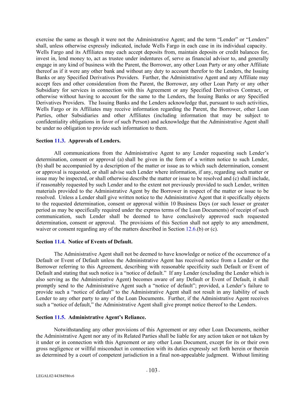 exercise the same as though it were not the Administrative Agent; and the term “Lender” or “Lenders” shall, unless otherwise expressly indicated, include Wells Fargo in each case in its individual capacity. Wells Fargo and its Affiliates may each accept deposits from, maintain deposits or credit balances for, invest in, lend money to, act as trustee under indentures of, serve as financial advisor to, and generally engage in any kind of business with the Parent, the Borrower, any other Loan Party or any other Affiliate thereof as if it were any other bank and without any duty to account therefor to the Lenders, the Issuing Banks or any Specified Derivatives Providers. Further, the Administrative Agent and any Affiliate may accept fees and other consideration from the Parent, the Borrower, any other Loan Party or any other Subsidiary for services in connection with this Agreement or any Specified Derivatives Contract, or otherwise without having to account for the same to the Lenders, the Issuing Banks or any Specified Derivatives Providers. The Issuing Banks and the Lenders acknowledge that, pursuant to such activities, Wells Fargo or its Affiliates may receive information regarding the Parent, the Borrower, other Loan Parties, other Subsidiaries and other Affiliates (including information that may be subject to confidentiality obligations in favor of such Person) and acknowledge that the Administrative Agent shall be under no obligation to provide such information to them. Section 11.3. Approvals of Lenders. All communications from the Administrative Agent to any Lender requesting such Lender’s determination, consent or approval (a) shall be given in the form of a written notice to such Lender, (b) shall be accompanied by a description of the matter or issue as to which such determination, consent or approval is requested, or shall advise such Lender where information, if any, regarding such matter or issue may be inspected, or shall otherwise describe the matter or issue to be resolved and (c) shall include, if reasonably requested by such Lender and to the extent not previously provided to such Lender, written materials provided to the Administrative Agent by the Borrower in respect of the matter or issue to be resolved. Unless a Lender shall give written notice to the Administrative Agent that it specifically objects to the requested determination, consent or approval within 10 Business Days (or such lesser or greater period as may be specifically required under the express terms of the Loan Documents) of receipt of such communication, such Lender shall be deemed to have conclusively approved such requested determination, consent or approval. The provisions of this Section shall not apply to any amendment, waiver or consent regarding any of the matters described in Section 12.6.(b) or (c). Section 11.4. Notice of Events of Default. The Administrative Agent shall not be deemed to have knowledge or notice of the occurrence of a Default or Event of Default unless the Administrative Agent has received notice from a Lender or the Borrower referring to this Agreement, describing with reasonable specificity such Default or Event of Default and stating that such notice is a “notice of default.” If any Lender (excluding the Lender which is also serving as the Administrative Agent) becomes aware of any Default or Event of Default, it shall promptly send to the Administrative Agent such a “notice of default”; provided, a Lender’s failure to provide such a “notice of default” to the Administrative Agent shall not result in any liability of such Lender to any other party to any of the Loan Documents. Further, if the Administrative Agent receives such a “notice of default,” the Administrative Agent shall give prompt notice thereof to the Lenders. Section 11.5. Administrative Agent’s Reliance. Notwithstanding any other provisions of this Agreement or any other Loan Documents, neither the Administrative Agent nor any of its Related Parties shall be liable for any action taken or not taken by it under or in connection with this Agreement or any other Loan Document, except for its or their own gross negligence or willful misconduct in connection with its duties expressly set forth herein or therein as determined by a court of competent jurisdiction in a final non-appealable judgment. Without limiting - 103 - LEGAL02/44384586v6