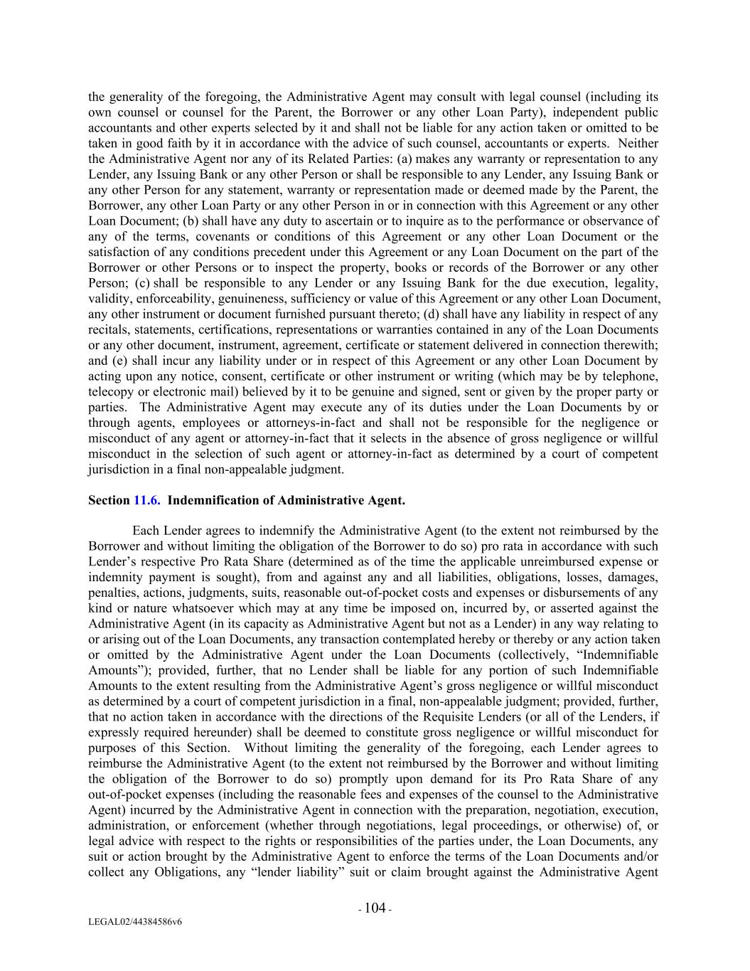 the generality of the foregoing, the Administrative Agent may consult with legal counsel (including its own counsel or counsel for the Parent, the Borrower or any other Loan Party), independent public accountants and other experts selected by it and shall not be liable for any action taken or omitted to be taken in good faith by it in accordance with the advice of such counsel, accountants or experts. Neither the Administrative Agent nor any of its Related Parties: (a) makes any warranty or representation to any Lender, any Issuing Bank or any other Person or shall be responsible to any Lender, any Issuing Bank or any other Person for any statement, warranty or representation made or deemed made by the Parent, the Borrower, any other Loan Party or any other Person in or in connection with this Agreement or any other Loan Document; (b) shall have any duty to ascertain or to inquire as to the performance or observance of any of the terms, covenants or conditions of this Agreement or any other Loan Document or the satisfaction of any conditions precedent under this Agreement or any Loan Document on the part of the Borrower or other Persons or to inspect the property, books or records of the Borrower or any other Person; (c) shall be responsible to any Lender or any Issuing Bank for the due execution, legality, validity, enforceability, genuineness, sufficiency or value of this Agreement or any other Loan Document, any other instrument or document furnished pursuant thereto; (d) shall have any liability in respect of any recitals, statements, certifications, representations or warranties contained in any of the Loan Documents or any other document, instrument, agreement, certificate or statement delivered in connection therewith; and (e) shall incur any liability under or in respect of this Agreement or any other Loan Document by acting upon any notice, consent, certificate or other instrument or writing (which may be by telephone, telecopy or electronic mail) believed by it to be genuine and signed, sent or given by the proper party or parties. The Administrative Agent may execute any of its duties under the Loan Documents by or through agents, employees or attorneys-in-fact and shall not be responsible for the negligence or misconduct of any agent or attorney-in-fact that it selects in the absence of gross negligence or willful misconduct in the selection of such agent or attorney-in-fact as determined by a court of competent jurisdiction in a final non-appealable judgment. Section 11.6. Indemnification of Administrative Agent. Each Lender agrees to indemnify the Administrative Agent (to the extent not reimbursed by the Borrower and without limiting the obligation of the Borrower to do so) pro rata in accordance with such Lender’s respective Pro Rata Share (determined as of the time the applicable unreimbursed expense or indemnity payment is sought), from and against any and all liabilities, obligations, losses, damages, penalties, actions, judgments, suits, reasonable out-of-pocket costs and expenses or disbursements of any kind or nature whatsoever which may at any time be imposed on, incurred by, or asserted against the Administrative Agent (in its capacity as Administrative Agent but not as a Lender) in any way relating to or arising out of the Loan Documents, any transaction contemplated hereby or thereby or any action taken or omitted by the Administrative Agent under the Loan Documents (collectively, “Indemnifiable Amounts”); provided, further, that no Lender shall be liable for any portion of such Indemnifiable Amounts to the extent resulting from the Administrative Agent’s gross negligence or willful misconduct as determined by a court of competent jurisdiction in a final, non-appealable judgment; provided, further, that no action taken in accordance with the directions of the Requisite Lenders (or all of the Lenders, if expressly required hereunder) shall be deemed to constitute gross negligence or willful misconduct for purposes of this Section. Without limiting the generality of the foregoing, each Lender agrees to reimburse the Administrative Agent (to the extent not reimbursed by the Borrower and without limiting the obligation of the Borrower to do so) promptly upon demand for its Pro Rata Share of any out-of-pocket expenses (including the reasonable fees and expenses of the counsel to the Administrative Agent) incurred by the Administrative Agent in connection with the preparation, negotiation, execution, administration, or enforcement (whether through negotiations, legal proceedings, or otherwise) of, or legal advice with respect to the rights or responsibilities of the parties under, the Loan Documents, any suit or action brought by the Administrative Agent to enforce the terms of the Loan Documents and/or collect any Obligations, any “lender liability” suit or claim brought against the Administrative Agent - 104 - LEGAL02/44384586v6