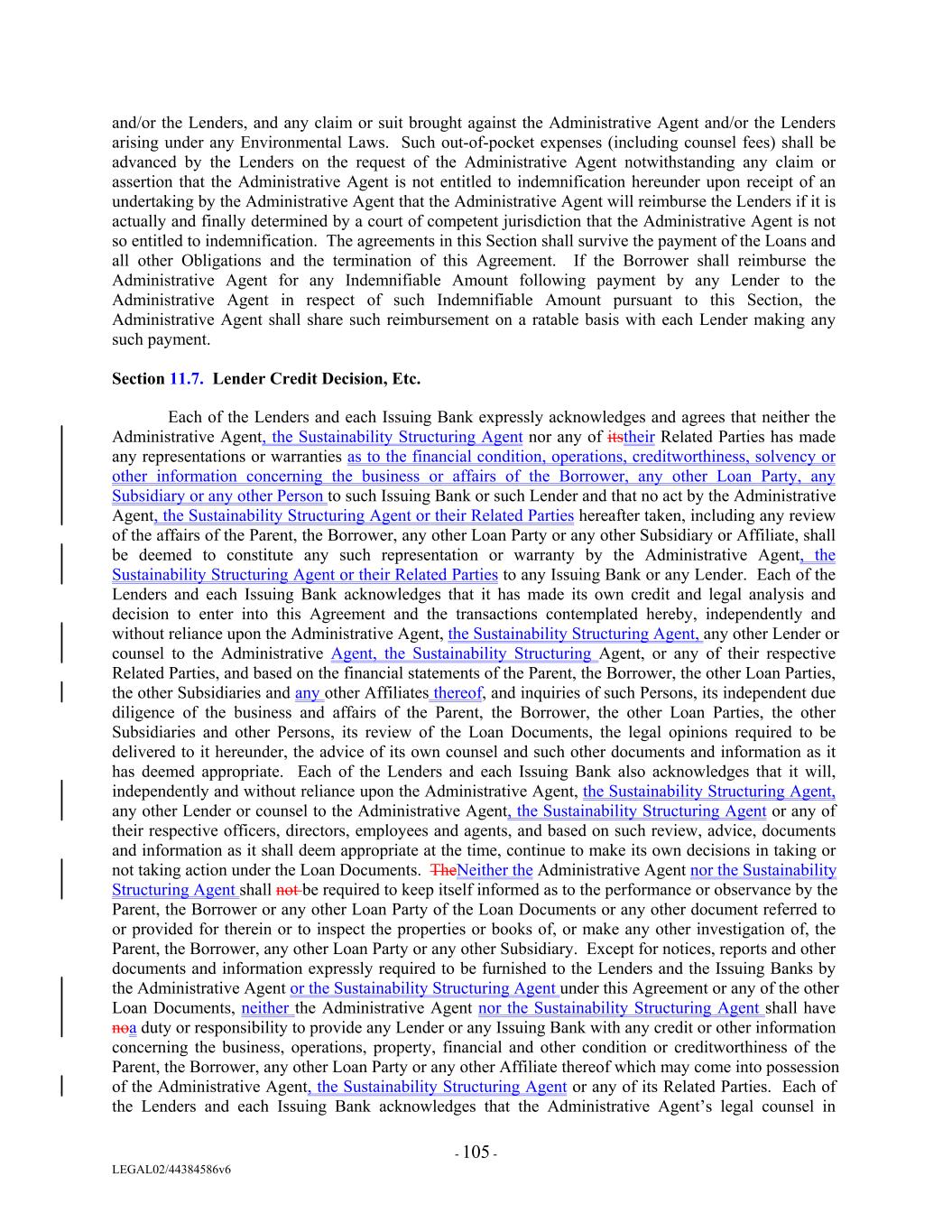 and/or the Lenders, and any claim or suit brought against the Administrative Agent and/or the Lenders arising under any Environmental Laws. Such out-of-pocket expenses (including counsel fees) shall be advanced by the Lenders on the request of the Administrative Agent notwithstanding any claim or assertion that the Administrative Agent is not entitled to indemnification hereunder upon receipt of an undertaking by the Administrative Agent that the Administrative Agent will reimburse the Lenders if it is actually and finally determined by a court of competent jurisdiction that the Administrative Agent is not so entitled to indemnification. The agreements in this Section shall survive the payment of the Loans and all other Obligations and the termination of this Agreement. If the Borrower shall reimburse the Administrative Agent for any Indemnifiable Amount following payment by any Lender to the Administrative Agent in respect of such Indemnifiable Amount pursuant to this Section, the Administrative Agent shall share such reimbursement on a ratable basis with each Lender making any such payment. Section 11.7. Lender Credit Decision, Etc. Each of the Lenders and each Issuing Bank expressly acknowledges and agrees that neither the Administrative Agent, the Sustainability Structuring Agent nor any of itstheir Related Parties has made any representations or warranties as to the financial condition, operations, creditworthiness, solvency or other information concerning the business or affairs of the Borrower, any other Loan Party, any Subsidiary or any other Person to such Issuing Bank or such Lender and that no act by the Administrative Agent, the Sustainability Structuring Agent or their Related Parties hereafter taken, including any review of the affairs of the Parent, the Borrower, any other Loan Party or any other Subsidiary or Affiliate, shall be deemed to constitute any such representation or warranty by the Administrative Agent, the Sustainability Structuring Agent or their Related Parties to any Issuing Bank or any Lender. Each of the Lenders and each Issuing Bank acknowledges that it has made its own credit and legal analysis and decision to enter into this Agreement and the transactions contemplated hereby, independently and without reliance upon the Administrative Agent, the Sustainability Structuring Agent, any other Lender or counsel to the Administrative Agent, the Sustainability Structuring Agent, or any of their respective Related Parties, and based on the financial statements of the Parent, the Borrower, the other Loan Parties, the other Subsidiaries and any other Affiliates thereof, and inquiries of such Persons, its independent due diligence of the business and affairs of the Parent, the Borrower, the other Loan Parties, the other Subsidiaries and other Persons, its review of the Loan Documents, the legal opinions required to be delivered to it hereunder, the advice of its own counsel and such other documents and information as it has deemed appropriate. Each of the Lenders and each Issuing Bank also acknowledges that it will, independently and without reliance upon the Administrative Agent, the Sustainability Structuring Agent, any other Lender or counsel to the Administrative Agent, the Sustainability Structuring Agent or any of their respective officers, directors, employees and agents, and based on such review, advice, documents and information as it shall deem appropriate at the time, continue to make its own decisions in taking or not taking action under the Loan Documents. TheNeither the Administrative Agent nor the Sustainability Structuring Agent shall not be required to keep itself informed as to the performance or observance by the Parent, the Borrower or any other Loan Party of the Loan Documents or any other document referred to or provided for therein or to inspect the properties or books of, or make any other investigation of, the Parent, the Borrower, any other Loan Party or any other Subsidiary. Except for notices, reports and other documents and information expressly required to be furnished to the Lenders and the Issuing Banks by the Administrative Agent or the Sustainability Structuring Agent under this Agreement or any of the other Loan Documents, neither the Administrative Agent nor the Sustainability Structuring Agent shall have noa duty or responsibility to provide any Lender or any Issuing Bank with any credit or other information concerning the business, operations, property, financial and other condition or creditworthiness of the Parent, the Borrower, any other Loan Party or any other Affiliate thereof which may come into possession of the Administrative Agent, the Sustainability Structuring Agent or any of its Related Parties. Each of the Lenders and each Issuing Bank acknowledges that the Administrative Agent’s legal counsel in - 105 - LEGAL02/44384586v6