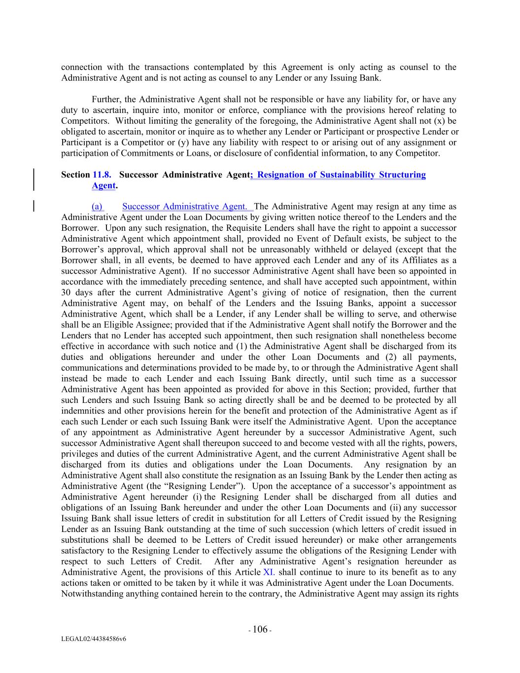 connection with the transactions contemplated by this Agreement is only acting as counsel to the Administrative Agent and is not acting as counsel to any Lender or any Issuing Bank. Further, the Administrative Agent shall not be responsible or have any liability for, or have any duty to ascertain, inquire into, monitor or enforce, compliance with the provisions hereof relating to Competitors. Without limiting the generality of the foregoing, the Administrative Agent shall not (x) be obligated to ascertain, monitor or inquire as to whether any Lender or Participant or prospective Lender or Participant is a Competitor or (y) have any liability with respect to or arising out of any assignment or participation of Commitments or Loans, or disclosure of confidential information, to any Competitor. Section 11.8. Successor Administrative Agent; Resignation of Sustainability Structuring Agent. (a) Successor Administrative Agent. The Administrative Agent may resign at any time as Administrative Agent under the Loan Documents by giving written notice thereof to the Lenders and the Borrower. Upon any such resignation, the Requisite Lenders shall have the right to appoint a successor Administrative Agent which appointment shall, provided no Event of Default exists, be subject to the Borrower’s approval, which approval shall not be unreasonably withheld or delayed (except that the Borrower shall, in all events, be deemed to have approved each Lender and any of its Affiliates as a successor Administrative Agent). If no successor Administrative Agent shall have been so appointed in accordance with the immediately preceding sentence, and shall have accepted such appointment, within 30 days after the current Administrative Agent’s giving of notice of resignation, then the current Administrative Agent may, on behalf of the Lenders and the Issuing Banks, appoint a successor Administrative Agent, which shall be a Lender, if any Lender shall be willing to serve, and otherwise shall be an Eligible Assignee; provided that if the Administrative Agent shall notify the Borrower and the Lenders that no Lender has accepted such appointment, then such resignation shall nonetheless become effective in accordance with such notice and (1) the Administrative Agent shall be discharged from its duties and obligations hereunder and under the other Loan Documents and (2) all payments, communications and determinations provided to be made by, to or through the Administrative Agent shall instead be made to each Lender and each Issuing Bank directly, until such time as a successor Administrative Agent has been appointed as provided for above in this Section; provided, further that such Lenders and such Issuing Bank so acting directly shall be and be deemed to be protected by all indemnities and other provisions herein for the benefit and protection of the Administrative Agent as if each such Lender or each such Issuing Bank were itself the Administrative Agent. Upon the acceptance of any appointment as Administrative Agent hereunder by a successor Administrative Agent, such successor Administrative Agent shall thereupon succeed to and become vested with all the rights, powers, privileges and duties of the current Administrative Agent, and the current Administrative Agent shall be discharged from its duties and obligations under the Loan Documents. Any resignation by an Administrative Agent shall also constitute the resignation as an Issuing Bank by the Lender then acting as Administrative Agent (the “Resigning Lender”). Upon the acceptance of a successor’s appointment as Administrative Agent hereunder (i) the Resigning Lender shall be discharged from all duties and obligations of an Issuing Bank hereunder and under the other Loan Documents and (ii) any successor Issuing Bank shall issue letters of credit in substitution for all Letters of Credit issued by the Resigning Lender as an Issuing Bank outstanding at the time of such succession (which letters of credit issued in substitutions shall be deemed to be Letters of Credit issued hereunder) or make other arrangements satisfactory to the Resigning Lender to effectively assume the obligations of the Resigning Lender with respect to such Letters of Credit. After any Administrative Agent’s resignation hereunder as Administrative Agent, the provisions of this Article XI. shall continue to inure to its benefit as to any actions taken or omitted to be taken by it while it was Administrative Agent under the Loan Documents. Notwithstanding anything contained herein to the contrary, the Administrative Agent may assign its rights - 106 - LEGAL02/44384586v6