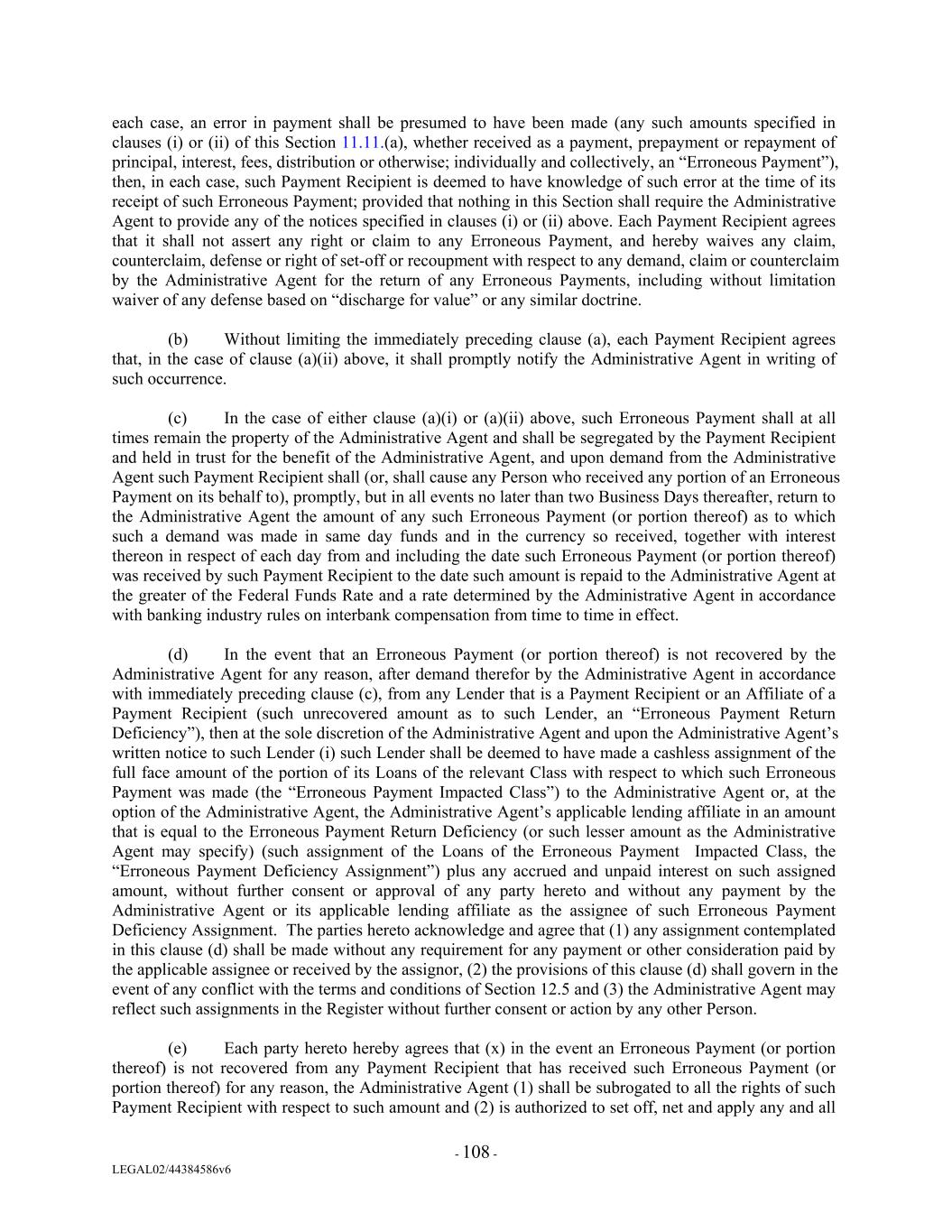each case, an error in payment shall be presumed to have been made (any such amounts specified in clauses (i) or (ii) of this Section 11.11.(a), whether received as a payment, prepayment or repayment of principal, interest, fees, distribution or otherwise; individually and collectively, an “Erroneous Payment”), then, in each case, such Payment Recipient is deemed to have knowledge of such error at the time of its receipt of such Erroneous Payment; provided that nothing in this Section shall require the Administrative Agent to provide any of the notices specified in clauses (i) or (ii) above. Each Payment Recipient agrees that it shall not assert any right or claim to any Erroneous Payment, and hereby waives any claim, counterclaim, defense or right of set-off or recoupment with respect to any demand, claim or counterclaim by the Administrative Agent for the return of any Erroneous Payments, including without limitation waiver of any defense based on “discharge for value” or any similar doctrine. (b) Without limiting the immediately preceding clause (a), each Payment Recipient agrees that, in the case of clause (a)(ii) above, it shall promptly notify the Administrative Agent in writing of such occurrence. (c) In the case of either clause (a)(i) or (a)(ii) above, such Erroneous Payment shall at all times remain the property of the Administrative Agent and shall be segregated by the Payment Recipient and held in trust for the benefit of the Administrative Agent, and upon demand from the Administrative Agent such Payment Recipient shall (or, shall cause any Person who received any portion of an Erroneous Payment on its behalf to), promptly, but in all events no later than two Business Days thereafter, return to the Administrative Agent the amount of any such Erroneous Payment (or portion thereof) as to which such a demand was made in same day funds and in the currency so received, together with interest thereon in respect of each day from and including the date such Erroneous Payment (or portion thereof) was received by such Payment Recipient to the date such amount is repaid to the Administrative Agent at the greater of the Federal Funds Rate and a rate determined by the Administrative Agent in accordance with banking industry rules on interbank compensation from time to time in effect. (d) In the event that an Erroneous Payment (or portion thereof) is not recovered by the Administrative Agent for any reason, after demand therefor by the Administrative Agent in accordance with immediately preceding clause (c), from any Lender that is a Payment Recipient or an Affiliate of a Payment Recipient (such unrecovered amount as to such Lender, an “Erroneous Payment Return Deficiency”), then at the sole discretion of the Administrative Agent and upon the Administrative Agent’s written notice to such Lender (i) such Lender shall be deemed to have made a cashless assignment of the full face amount of the portion of its Loans of the relevant Class with respect to which such Erroneous Payment was made (the “Erroneous Payment Impacted Class”) to the Administrative Agent or, at the option of the Administrative Agent, the Administrative Agent’s applicable lending affiliate in an amount that is equal to the Erroneous Payment Return Deficiency (or such lesser amount as the Administrative Agent may specify) (such assignment of the Loans of the Erroneous Payment Impacted Class, the “Erroneous Payment Deficiency Assignment”) plus any accrued and unpaid interest on such assigned amount, without further consent or approval of any party hereto and without any payment by the Administrative Agent or its applicable lending affiliate as the assignee of such Erroneous Payment Deficiency Assignment. The parties hereto acknowledge and agree that (1) any assignment contemplated in this clause (d) shall be made without any requirement for any payment or other consideration paid by the applicable assignee or received by the assignor, (2) the provisions of this clause (d) shall govern in the event of any conflict with the terms and conditions of Section 12.5 and (3) the Administrative Agent may reflect such assignments in the Register without further consent or action by any other Person. (e) Each party hereto hereby agrees that (x) in the event an Erroneous Payment (or portion thereof) is not recovered from any Payment Recipient that has received such Erroneous Payment (or portion thereof) for any reason, the Administrative Agent (1) shall be subrogated to all the rights of such Payment Recipient with respect to such amount and (2) is authorized to set off, net and apply any and all - 108 - LEGAL02/44384586v6