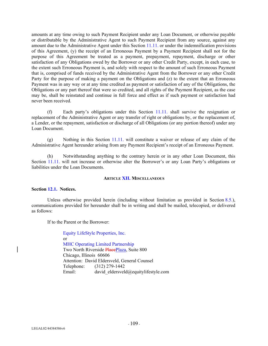 amounts at any time owing to such Payment Recipient under any Loan Document, or otherwise payable or distributable by the Administrative Agent to such Payment Recipient from any source, against any amount due to the Administrative Agent under this Section 11.11. or under the indemnification provisions of this Agreement, (y) the receipt of an Erroneous Payment by a Payment Recipient shall not for the purpose of this Agreement be treated as a payment, prepayment, repayment, discharge or other satisfaction of any Obligations owed by the Borrower or any other Credit Party, except, in each case, to the extent such Erroneous Payment is, and solely with respect to the amount of such Erroneous Payment that is, comprised of funds received by the Administrative Agent from the Borrower or any other Credit Party for the purpose of making a payment on the Obligations and (z) to the extent that an Erroneous Payment was in any way or at any time credited as payment or satisfaction of any of the Obligations, the Obligations or any part thereof that were so credited, and all rights of the Payment Recipient, as the case may be, shall be reinstated and continue in full force and effect as if such payment or satisfaction had never been received. (f) Each party’s obligations under this Section 11.11. shall survive the resignation or replacement of the Administrative Agent or any transfer of right or obligations by, or the replacement of, a Lender, or the repayment, satisfaction or discharge of all Obligations (or any portion thereof) under any Loan Document. (g) Nothing in this Section 11.11. will constitute a waiver or release of any claim of the Administrative Agent hereunder arising from any Payment Recipient’s receipt of an Erroneous Payment. (h) Notwithstanding anything to the contrary herein or in any other Loan Document, this Section 11.11. will not increase or otherwise alter the Borrower’s or any Loan Party’s obligations or liabilities under the Loan Documents. ARTICLE XII. MISCELLANEOUS Section 12.1. Notices. Unless otherwise provided herein (including without limitation as provided in Section 8.5.), communications provided for hereunder shall be in writing and shall be mailed, telecopied, or delivered as follows: If to the Parent or the Borrower: Equity LifeStyle Properties, Inc. or MHC Operating Limited Partnership Two North Riverside PlacePlaza, Suite 800 Chicago, Illinois 60606 Attention: David Eldersveld, General Counsel Telephone: (312) 279-1442 Email: david_eldersveld@equitylifestyle.com - 109 - LEGAL02/44384586v6
