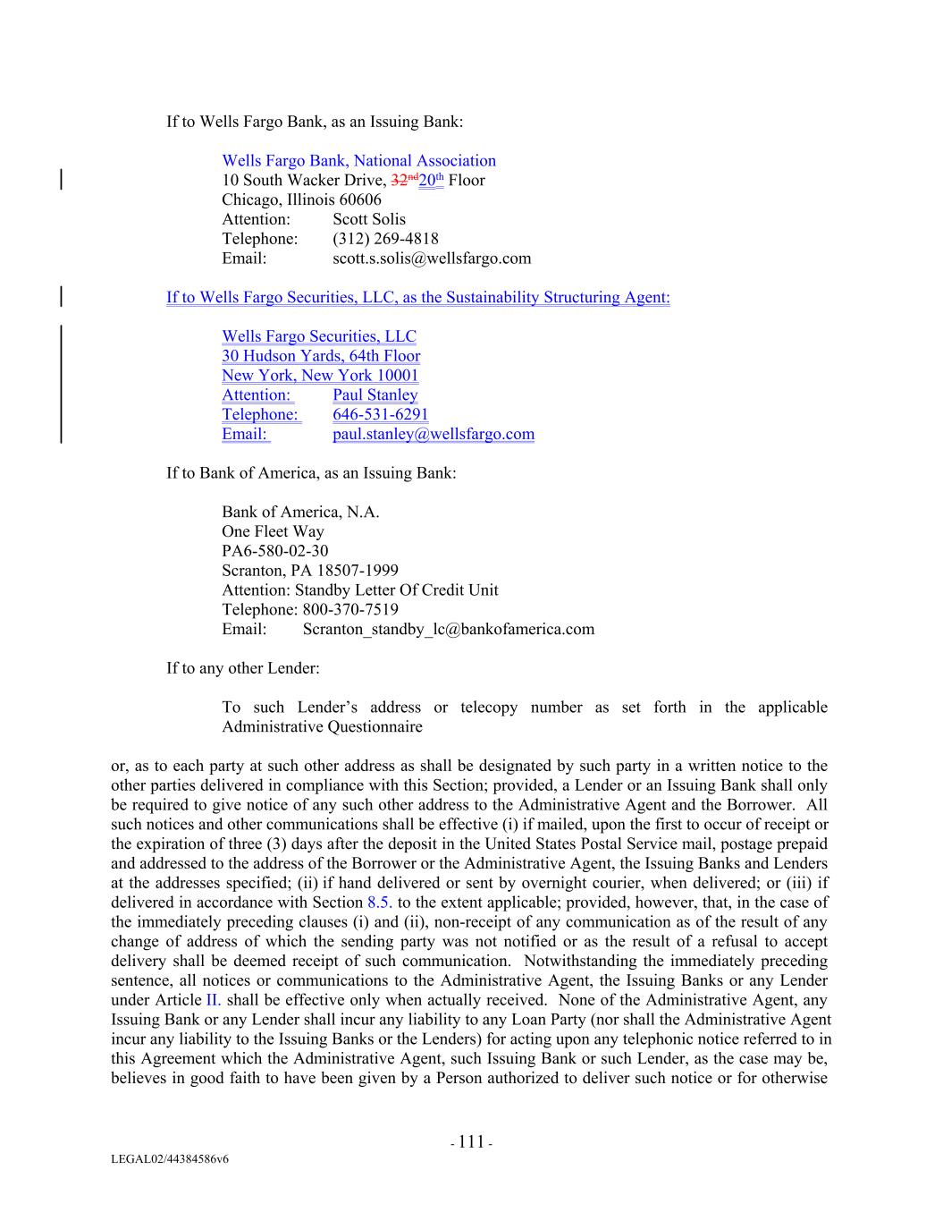 If to Wells Fargo Bank, as an Issuing Bank: Wells Fargo Bank, National Association 10 South Wacker Drive, 32nd20th Floor Chicago, Illinois 60606 Attention: Scott Solis Telephone: (312) 269-4818 Email: scott.s.solis@wellsfargo.com If to Wells Fargo Securities, LLC, as the Sustainability Structuring Agent: Wells Fargo Securities, LLC 30 Hudson Yards, 64th Floor New York, New York 10001 Attention: Paul Stanley Telephone: 646-531-6291 Email: paul.stanley@wellsfargo.com If to Bank of America, as an Issuing Bank: Bank of America, N.A. One Fleet Way PA6-580-02-30 Scranton, PA 18507-1999 Attention: Standby Letter Of Credit Unit Telephone: 800-370-7519 Email: Scranton_standby_lc@bankofamerica.com If to any other Lender: To such Lender’s address or telecopy number as set forth in the applicable Administrative Questionnaire or, as to each party at such other address as shall be designated by such party in a written notice to the other parties delivered in compliance with this Section; provided, a Lender or an Issuing Bank shall only be required to give notice of any such other address to the Administrative Agent and the Borrower. All such notices and other communications shall be effective (i) if mailed, upon the first to occur of receipt or the expiration of three (3) days after the deposit in the United States Postal Service mail, postage prepaid and addressed to the address of the Borrower or the Administrative Agent, the Issuing Banks and Lenders at the addresses specified; (ii) if hand delivered or sent by overnight courier, when delivered; or (iii) if delivered in accordance with Section 8.5. to the extent applicable; provided, however, that, in the case of the immediately preceding clauses (i) and (ii), non-receipt of any communication as of the result of any change of address of which the sending party was not notified or as the result of a refusal to accept delivery shall be deemed receipt of such communication. Notwithstanding the immediately preceding sentence, all notices or communications to the Administrative Agent, the Issuing Banks or any Lender under Article II. shall be effective only when actually received. None of the Administrative Agent, any Issuing Bank or any Lender shall incur any liability to any Loan Party (nor shall the Administrative Agent incur any liability to the Issuing Banks or the Lenders) for acting upon any telephonic notice referred to in this Agreement which the Administrative Agent, such Issuing Bank or such Lender, as the case may be, believes in good faith to have been given by a Person authorized to deliver such notice or for otherwise - 111 - LEGAL02/44384586v6