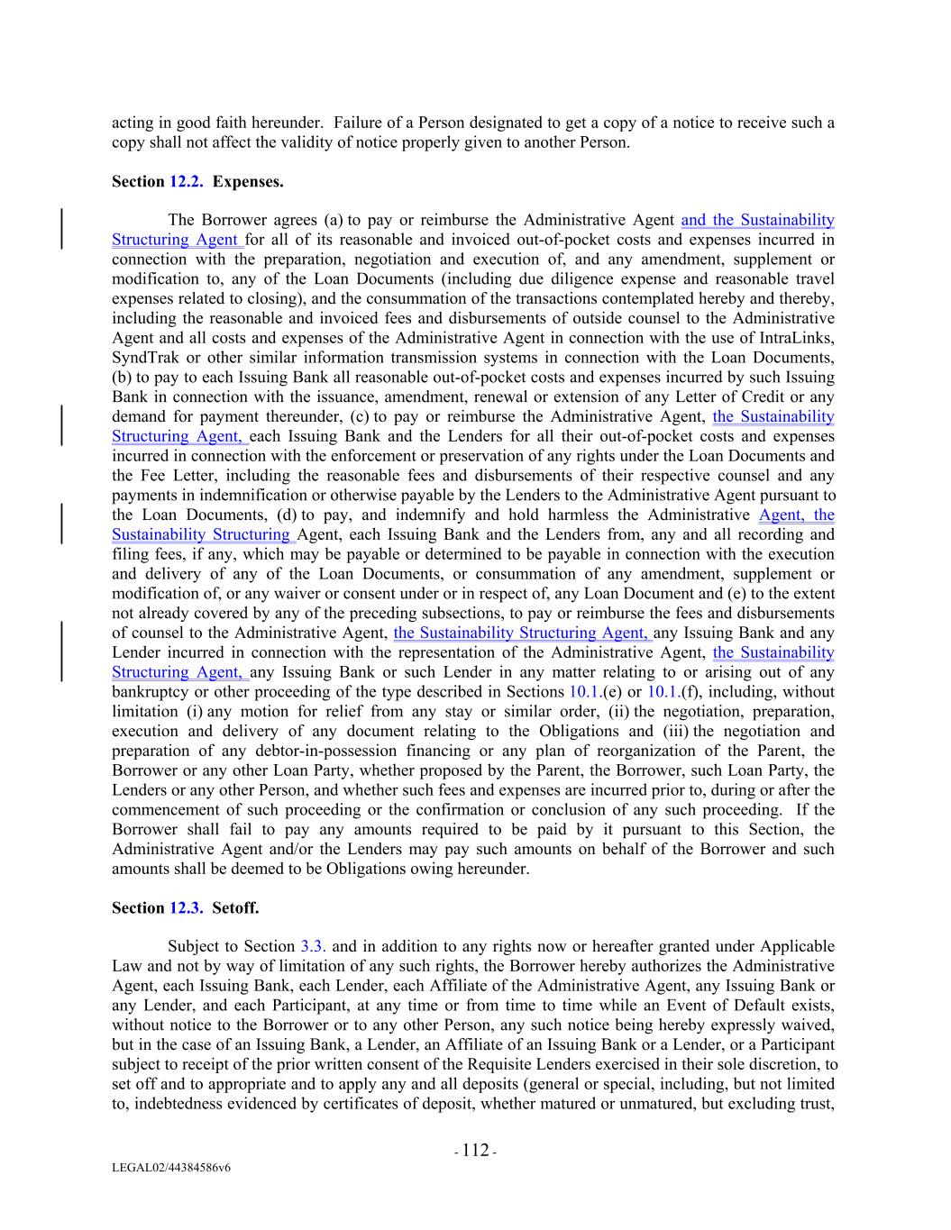 acting in good faith hereunder. Failure of a Person designated to get a copy of a notice to receive such a copy shall not affect the validity of notice properly given to another Person. Section 12.2. Expenses. The Borrower agrees (a) to pay or reimburse the Administrative Agent and the Sustainability Structuring Agent for all of its reasonable and invoiced out-of-pocket costs and expenses incurred in connection with the preparation, negotiation and execution of, and any amendment, supplement or modification to, any of the Loan Documents (including due diligence expense and reasonable travel expenses related to closing), and the consummation of the transactions contemplated hereby and thereby, including the reasonable and invoiced fees and disbursements of outside counsel to the Administrative Agent and all costs and expenses of the Administrative Agent in connection with the use of IntraLinks, SyndTrak or other similar information transmission systems in connection with the Loan Documents, (b) to pay to each Issuing Bank all reasonable out-of-pocket costs and expenses incurred by such Issuing Bank in connection with the issuance, amendment, renewal or extension of any Letter of Credit or any demand for payment thereunder, (c) to pay or reimburse the Administrative Agent, the Sustainability Structuring Agent, each Issuing Bank and the Lenders for all their out-of-pocket costs and expenses incurred in connection with the enforcement or preservation of any rights under the Loan Documents and the Fee Letter, including the reasonable fees and disbursements of their respective counsel and any payments in indemnification or otherwise payable by the Lenders to the Administrative Agent pursuant to the Loan Documents, (d) to pay, and indemnify and hold harmless the Administrative Agent, the Sustainability Structuring Agent, each Issuing Bank and the Lenders from, any and all recording and filing fees, if any, which may be payable or determined to be payable in connection with the execution and delivery of any of the Loan Documents, or consummation of any amendment, supplement or modification of, or any waiver or consent under or in respect of, any Loan Document and (e) to the extent not already covered by any of the preceding subsections, to pay or reimburse the fees and disbursements of counsel to the Administrative Agent, the Sustainability Structuring Agent, any Issuing Bank and any Lender incurred in connection with the representation of the Administrative Agent, the Sustainability Structuring Agent, any Issuing Bank or such Lender in any matter relating to or arising out of any bankruptcy or other proceeding of the type described in Sections 10.1.(e) or 10.1.(f), including, without limitation (i) any motion for relief from any stay or similar order, (ii) the negotiation, preparation, execution and delivery of any document relating to the Obligations and (iii) the negotiation and preparation of any debtor-in-possession financing or any plan of reorganization of the Parent, the Borrower or any other Loan Party, whether proposed by the Parent, the Borrower, such Loan Party, the Lenders or any other Person, and whether such fees and expenses are incurred prior to, during or after the commencement of such proceeding or the confirmation or conclusion of any such proceeding. If the Borrower shall fail to pay any amounts required to be paid by it pursuant to this Section, the Administrative Agent and/or the Lenders may pay such amounts on behalf of the Borrower and such amounts shall be deemed to be Obligations owing hereunder. Section 12.3. Setoff. Subject to Section 3.3. and in addition to any rights now or hereafter granted under Applicable Law and not by way of limitation of any such rights, the Borrower hereby authorizes the Administrative Agent, each Issuing Bank, each Lender, each Affiliate of the Administrative Agent, any Issuing Bank or any Lender, and each Participant, at any time or from time to time while an Event of Default exists, without notice to the Borrower or to any other Person, any such notice being hereby expressly waived, but in the case of an Issuing Bank, a Lender, an Affiliate of an Issuing Bank or a Lender, or a Participant subject to receipt of the prior written consent of the Requisite Lenders exercised in their sole discretion, to set off and to appropriate and to apply any and all deposits (general or special, including, but not limited to, indebtedness evidenced by certificates of deposit, whether matured or unmatured, but excluding trust, - 112 - LEGAL02/44384586v6