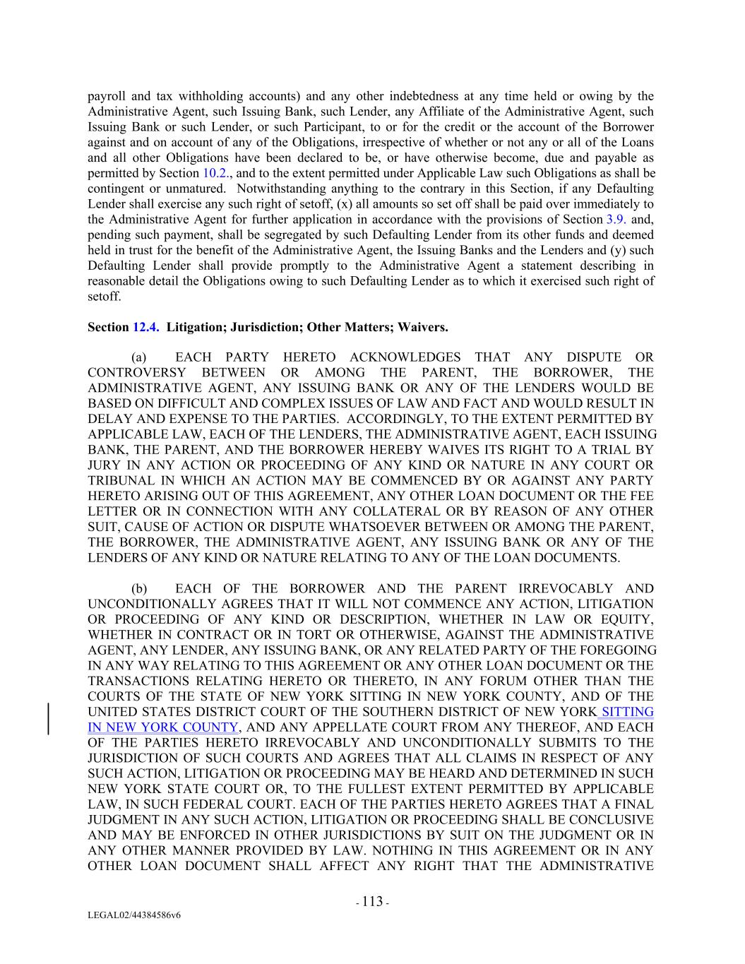 payroll and tax withholding accounts) and any other indebtedness at any time held or owing by the Administrative Agent, such Issuing Bank, such Lender, any Affiliate of the Administrative Agent, such Issuing Bank or such Lender, or such Participant, to or for the credit or the account of the Borrower against and on account of any of the Obligations, irrespective of whether or not any or all of the Loans and all other Obligations have been declared to be, or have otherwise become, due and payable as permitted by Section 10.2., and to the extent permitted under Applicable Law such Obligations as shall be contingent or unmatured. Notwithstanding anything to the contrary in this Section, if any Defaulting Lender shall exercise any such right of setoff, (x) all amounts so set off shall be paid over immediately to the Administrative Agent for further application in accordance with the provisions of Section 3.9. and, pending such payment, shall be segregated by such Defaulting Lender from its other funds and deemed held in trust for the benefit of the Administrative Agent, the Issuing Banks and the Lenders and (y) such Defaulting Lender shall provide promptly to the Administrative Agent a statement describing in reasonable detail the Obligations owing to such Defaulting Lender as to which it exercised such right of setoff. Section 12.4. Litigation; Jurisdiction; Other Matters; Waivers. (a) EACH PARTY HERETO ACKNOWLEDGES THAT ANY DISPUTE OR CONTROVERSY BETWEEN OR AMONG THE PARENT, THE BORROWER, THE ADMINISTRATIVE AGENT, ANY ISSUING BANK OR ANY OF THE LENDERS WOULD BE BASED ON DIFFICULT AND COMPLEX ISSUES OF LAW AND FACT AND WOULD RESULT IN DELAY AND EXPENSE TO THE PARTIES. ACCORDINGLY, TO THE EXTENT PERMITTED BY APPLICABLE LAW, EACH OF THE LENDERS, THE ADMINISTRATIVE AGENT, EACH ISSUING BANK, THE PARENT, AND THE BORROWER HEREBY WAIVES ITS RIGHT TO A TRIAL BY JURY IN ANY ACTION OR PROCEEDING OF ANY KIND OR NATURE IN ANY COURT OR TRIBUNAL IN WHICH AN ACTION MAY BE COMMENCED BY OR AGAINST ANY PARTY HERETO ARISING OUT OF THIS AGREEMENT, ANY OTHER LOAN DOCUMENT OR THE FEE LETTER OR IN CONNECTION WITH ANY COLLATERAL OR BY REASON OF ANY OTHER SUIT, CAUSE OF ACTION OR DISPUTE WHATSOEVER BETWEEN OR AMONG THE PARENT, THE BORROWER, THE ADMINISTRATIVE AGENT, ANY ISSUING BANK OR ANY OF THE LENDERS OF ANY KIND OR NATURE RELATING TO ANY OF THE LOAN DOCUMENTS. (b) EACH OF THE BORROWER AND THE PARENT IRREVOCABLY AND UNCONDITIONALLY AGREES THAT IT WILL NOT COMMENCE ANY ACTION, LITIGATION OR PROCEEDING OF ANY KIND OR DESCRIPTION, WHETHER IN LAW OR EQUITY, WHETHER IN CONTRACT OR IN TORT OR OTHERWISE, AGAINST THE ADMINISTRATIVE AGENT, ANY LENDER, ANY ISSUING BANK, OR ANY RELATED PARTY OF THE FOREGOING IN ANY WAY RELATING TO THIS AGREEMENT OR ANY OTHER LOAN DOCUMENT OR THE TRANSACTIONS RELATING HERETO OR THERETO, IN ANY FORUM OTHER THAN THE COURTS OF THE STATE OF NEW YORK SITTING IN NEW YORK COUNTY, AND OF THE UNITED STATES DISTRICT COURT OF THE SOUTHERN DISTRICT OF NEW YORK SITTING IN NEW YORK COUNTY, AND ANY APPELLATE COURT FROM ANY THEREOF, AND EACH OF THE PARTIES HERETO IRREVOCABLY AND UNCONDITIONALLY SUBMITS TO THE JURISDICTION OF SUCH COURTS AND AGREES THAT ALL CLAIMS IN RESPECT OF ANY SUCH ACTION, LITIGATION OR PROCEEDING MAY BE HEARD AND DETERMINED IN SUCH NEW YORK STATE COURT OR, TO THE FULLEST EXTENT PERMITTED BY APPLICABLE LAW, IN SUCH FEDERAL COURT. EACH OF THE PARTIES HERETO AGREES THAT A FINAL JUDGMENT IN ANY SUCH ACTION, LITIGATION OR PROCEEDING SHALL BE CONCLUSIVE AND MAY BE ENFORCED IN OTHER JURISDICTIONS BY SUIT ON THE JUDGMENT OR IN ANY OTHER MANNER PROVIDED BY LAW. NOTHING IN THIS AGREEMENT OR IN ANY OTHER LOAN DOCUMENT SHALL AFFECT ANY RIGHT THAT THE ADMINISTRATIVE - 113 - LEGAL02/44384586v6