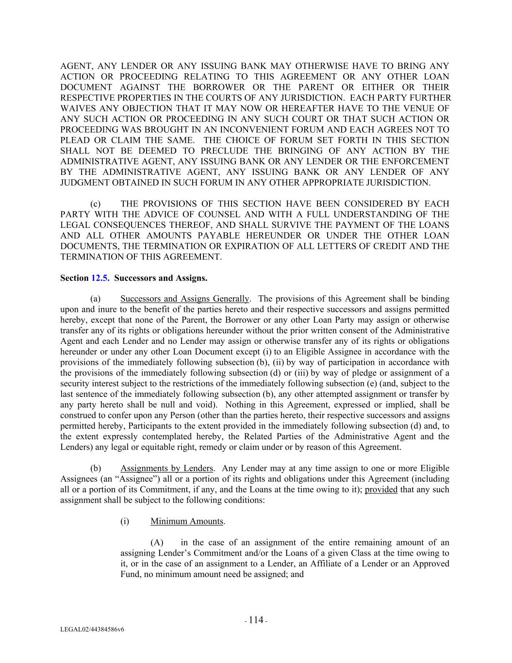 AGENT, ANY LENDER OR ANY ISSUING BANK MAY OTHERWISE HAVE TO BRING ANY ACTION OR PROCEEDING RELATING TO THIS AGREEMENT OR ANY OTHER LOAN DOCUMENT AGAINST THE BORROWER OR THE PARENT OR EITHER OR THEIR RESPECTIVE PROPERTIES IN THE COURTS OF ANY JURISDICTION. EACH PARTY FURTHER WAIVES ANY OBJECTION THAT IT MAY NOW OR HEREAFTER HAVE TO THE VENUE OF ANY SUCH ACTION OR PROCEEDING IN ANY SUCH COURT OR THAT SUCH ACTION OR PROCEEDING WAS BROUGHT IN AN INCONVENIENT FORUM AND EACH AGREES NOT TO PLEAD OR CLAIM THE SAME. THE CHOICE OF FORUM SET FORTH IN THIS SECTION SHALL NOT BE DEEMED TO PRECLUDE THE BRINGING OF ANY ACTION BY THE ADMINISTRATIVE AGENT, ANY ISSUING BANK OR ANY LENDER OR THE ENFORCEMENT BY THE ADMINISTRATIVE AGENT, ANY ISSUING BANK OR ANY LENDER OF ANY JUDGMENT OBTAINED IN SUCH FORUM IN ANY OTHER APPROPRIATE JURISDICTION. (c) THE PROVISIONS OF THIS SECTION HAVE BEEN CONSIDERED BY EACH PARTY WITH THE ADVICE OF COUNSEL AND WITH A FULL UNDERSTANDING OF THE LEGAL CONSEQUENCES THEREOF, AND SHALL SURVIVE THE PAYMENT OF THE LOANS AND ALL OTHER AMOUNTS PAYABLE HEREUNDER OR UNDER THE OTHER LOAN DOCUMENTS, THE TERMINATION OR EXPIRATION OF ALL LETTERS OF CREDIT AND THE TERMINATION OF THIS AGREEMENT. Section 12.5. Successors and Assigns. (a) Successors and Assigns Generally. The provisions of this Agreement shall be binding upon and inure to the benefit of the parties hereto and their respective successors and assigns permitted hereby, except that none of the Parent, the Borrower or any other Loan Party may assign or otherwise transfer any of its rights or obligations hereunder without the prior written consent of the Administrative Agent and each Lender and no Lender may assign or otherwise transfer any of its rights or obligations hereunder or under any other Loan Document except (i) to an Eligible Assignee in accordance with the provisions of the immediately following subsection (b), (ii) by way of participation in accordance with the provisions of the immediately following subsection (d) or (iii) by way of pledge or assignment of a security interest subject to the restrictions of the immediately following subsection (e) (and, subject to the last sentence of the immediately following subsection (b), any other attempted assignment or transfer by any party hereto shall be null and void). Nothing in this Agreement, expressed or implied, shall be construed to confer upon any Person (other than the parties hereto, their respective successors and assigns permitted hereby, Participants to the extent provided in the immediately following subsection (d) and, to the extent expressly contemplated hereby, the Related Parties of the Administrative Agent and the Lenders) any legal or equitable right, remedy or claim under or by reason of this Agreement. (b) Assignments by Lenders. Any Lender may at any time assign to one or more Eligible Assignees (an “Assignee”) all or a portion of its rights and obligations under this Agreement (including all or a portion of its Commitment, if any, and the Loans at the time owing to it); provided that any such assignment shall be subject to the following conditions: (i) Minimum Amounts. (A) in the case of an assignment of the entire remaining amount of an assigning Lender’s Commitment and/or the Loans of a given Class at the time owing to it, or in the case of an assignment to a Lender, an Affiliate of a Lender or an Approved Fund, no minimum amount need be assigned; and - 114 - LEGAL02/44384586v6