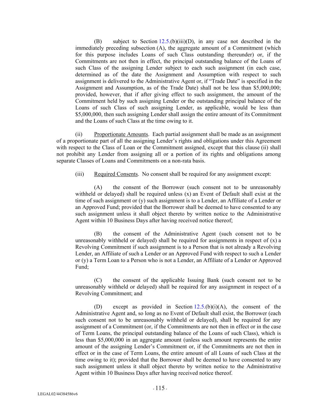 (B) subject to Section 12.5.(b)(iii)(D), in any case not described in the immediately preceding subsection (A), the aggregate amount of a Commitment (which for this purpose includes Loans of such Class outstanding thereunder) or, if the Commitments are not then in effect, the principal outstanding balance of the Loans of such Class of the assigning Lender subject to each such assignment (in each case, determined as of the date the Assignment and Assumption with respect to such assignment is delivered to the Administrative Agent or, if “Trade Date” is specified in the Assignment and Assumption, as of the Trade Date) shall not be less than $5,000,000; provided, however, that if after giving effect to such assignment, the amount of the Commitment held by such assigning Lender or the outstanding principal balance of the Loans of such Class of such assigning Lender, as applicable, would be less than $5,000,000, then such assigning Lender shall assign the entire amount of its Commitment and the Loans of such Class at the time owing to it. (ii) Proportionate Amounts. Each partial assignment shall be made as an assignment of a proportionate part of all the assigning Lender’s rights and obligations under this Agreement with respect to the Class of Loan or the Commitment assigned, except that this clause (ii) shall not prohibit any Lender from assigning all or a portion of its rights and obligations among separate Classes of Loans and Commitments on a non-rata basis. (iii) Required Consents. No consent shall be required for any assignment except: (A) the consent of the Borrower (such consent not to be unreasonably withheld or delayed) shall be required unless (x) an Event of Default shall exist at the time of such assignment or (y) such assignment is to a Lender, an Affiliate of a Lender or an Approved Fund; provided that the Borrower shall be deemed to have consented to any such assignment unless it shall object thereto by written notice to the Administrative Agent within 10 Business Days after having received notice thereof; (B) the consent of the Administrative Agent (such consent not to be unreasonably withheld or delayed) shall be required for assignments in respect of (x) a Revolving Commitment if such assignment is to a Person that is not already a Revolving Lender, an Affiliate of such a Lender or an Approved Fund with respect to such a Lender or (y) a Term Loan to a Person who is not a Lender, an Affiliate of a Lender or Approved Fund; (C) the consent of the applicable Issuing Bank (such consent not to be unreasonably withheld or delayed) shall be required for any assignment in respect of a Revolving Commitment; and (D) except as provided in Section 12.5.(b)(i)(A), the consent of the Administrative Agent and, so long as no Event of Default shall exist, the Borrower (each such consent not to be unreasonably withheld or delayed), shall be required for any assignment of a Commitment (or, if the Commitments are not then in effect or in the case of Term Loans, the principal outstanding balance of the Loans of such Class), which is less than $5,000,000 in an aggregate amount (unless such amount represents the entire amount of the assigning Lender’s Commitment or, if the Commitments are not then in effect or in the case of Term Loans, the entire amount of all Loans of such Class at the time owing to it); provided that the Borrower shall be deemed to have consented to any such assignment unless it shall object thereto by written notice to the Administrative Agent within 10 Business Days after having received notice thereof. - 115 - LEGAL02/44384586v6