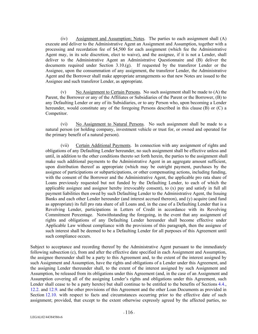 (iv) Assignment and Assumption; Notes. The parties to each assignment shall (A) execute and deliver to the Administrative Agent an Assignment and Assumption, together with a processing and recordation fee of $4,500 for each assignment (which fee the Administrative Agent may, in its sole discretion, elect to waive), and the assignee, if it is not a Lender, shall deliver to the Administrative Agent an Administrative Questionnaire and (B) deliver the documents required under Section 3.10.(g). If requested by the transferor Lender or the Assignee, upon the consummation of any assignment, the transferor Lender, the Administrative Agent and the Borrower shall make appropriate arrangements so that new Notes are issued to the Assignee and such transferor Lender, as appropriate. (v) No Assignment to Certain Persons. No such assignment shall be made to (A) the Parent, the Borrower or any of the Affiliates or Subsidiaries of the Parent or the Borrower, (B) to any Defaulting Lender or any of its Subsidiaries, or to any Person who, upon becoming a Lender hereunder, would constitute any of the foregoing Persons described in this clause (B) or (C) a Competitor. (vi) No Assignment to Natural Persons. No such assignment shall be made to a natural person (or holding company, investment vehicle or trust for, or owned and operated for the primary benefit of a natural person). (vii) Certain Additional Payments. In connection with any assignment of rights and obligations of any Defaulting Lender hereunder, no such assignment shall be effective unless and until, in addition to the other conditions thereto set forth herein, the parties to the assignment shall make such additional payments to the Administrative Agent in an aggregate amount sufficient, upon distribution thereof as appropriate (which may be outright payment, purchases by the assignee of participations or subparticipations, or other compensating actions, including funding, with the consent of the Borrower and the Administrative Agent, the applicable pro rata share of Loans previously requested but not funded by the Defaulting Lender, to each of which the applicable assignee and assignor hereby irrevocably consent), to (x) pay and satisfy in full all payment liabilities then owed by such Defaulting Lender to the Administrative Agent, the Issuing Banks and each other Lender hereunder (and interest accrued thereon), and (y) acquire (and fund as appropriate) its full pro rata share of all Loans and, in the case of a Defaulting Lender that is a Revolving Lender, participations in Letters of Credit in accordance with its Revolving Commitment Percentage. Notwithstanding the foregoing, in the event that any assignment of rights and obligations of any Defaulting Lender hereunder shall become effective under Applicable Law without compliance with the provisions of this paragraph, then the assignee of such interest shall be deemed to be a Defaulting Lender for all purposes of this Agreement until such compliance occurs. Subject to acceptance and recording thereof by the Administrative Agent pursuant to the immediately following subsection (c), from and after the effective date specified in each Assignment and Assumption, the assignee thereunder shall be a party to this Agreement and, to the extent of the interest assigned by such Assignment and Assumption, have the rights and obligations of a Lender under this Agreement, and the assigning Lender thereunder shall, to the extent of the interest assigned by such Assignment and Assumption, be released from its obligations under this Agreement (and, in the case of an Assignment and Assumption covering all of the assigning Lender’s rights and obligations under this Agreement, such Lender shall cease to be a party hereto) but shall continue to be entitled to the benefits of Sections 4.4., 12.2. and 12.9. and the other provisions of this Agreement and the other Loan Documents as provided in Section 12.10. with respect to facts and circumstances occurring prior to the effective date of such assignment; provided, that except to the extent otherwise expressly agreed by the affected parties, no - 116 - LEGAL02/44384586v6