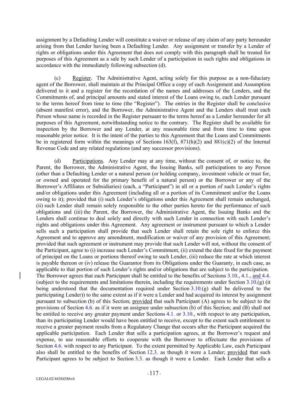 assignment by a Defaulting Lender will constitute a waiver or release of any claim of any party hereunder arising from that Lender having been a Defaulting Lender. Any assignment or transfer by a Lender of rights or obligations under this Agreement that does not comply with this paragraph shall be treated for purposes of this Agreement as a sale by such Lender of a participation in such rights and obligations in accordance with the immediately following subsection (d). (c) Register. The Administrative Agent, acting solely for this purpose as a non-fiduciary agent of the Borrower, shall maintain at the Principal Office a copy of each Assignment and Assumption delivered to it and a register for the recordation of the names and addresses of the Lenders, and the Commitments of, and principal amounts and stated interest of the Loans owing to, each Lender pursuant to the terms hereof from time to time (the “Register”). The entries in the Register shall be conclusive (absent manifest error), and the Borrower, the Administrative Agent and the Lenders shall treat each Person whose name is recorded in the Register pursuant to the terms hereof as a Lender hereunder for all purposes of this Agreement, notwithstanding notice to the contrary. The Register shall be available for inspection by the Borrower and any Lender, at any reasonable time and from time to time upon reasonable prior notice. It is the intent of the parties to this Agreement that the Loans and Commitments be in registered form within the meanings of Sections 163(f), 871(h)(2) and 881(c)(2) of the Internal Revenue Code and any related regulations (and any successor provisions). (d) Participations. Any Lender may at any time, without the consent of, or notice to, the Parent, the Borrower, the Administrative Agent, the Issuing Banks, sell participations to any Person (other than a Defaulting Lender or a natural person (or holding company, investment vehicle or trust for, or owned and operated for the primary benefit of a natural person) or the Borrower or any of the Borrower’s Affiliates or Subsidiaries) (each, a “Participant”) in all or a portion of such Lender’s rights and/or obligations under this Agreement (including all or a portion of its Commitment and/or the Loans owing to it); provided that (i) such Lender’s obligations under this Agreement shall remain unchanged, (ii) such Lender shall remain solely responsible to the other parties hereto for the performance of such obligations and (iii) the Parent, the Borrower, the Administrative Agent, the Issuing Banks and the Lenders shall continue to deal solely and directly with such Lender in connection with such Lender’s rights and obligations under this Agreement. Any agreement or instrument pursuant to which a Lender sells such a participation shall provide that such Lender shall retain the sole right to enforce this Agreement and to approve any amendment, modification or waiver of any provision of this Agreement; provided that such agreement or instrument may provide that such Lender will not, without the consent of the Participant, agree to (i) increase such Lender’s Commitment, (ii) extend the date fixed for the payment of principal on the Loans or portions thereof owing to such Lender, (iii) reduce the rate at which interest is payable thereon or (iv) release the Guarantor from its Obligations under the Guaranty, in each case, as applicable to that portion of such Lender’s rights and/or obligations that are subject to the participation. The Borrower agrees that each Participant shall be entitled to the benefits of Sections 3.10., 4.1., and 4.4. (subject to the requirements and limitations therein, including the requirements under Section 3.10.(g) (it being understood that the documentation required under Section 3.10.(g) shall be delivered to the participating Lender)) to the same extent as if it were a Lender and had acquired its interest by assignment pursuant to subsection (b) of this Section; provided that such Participant (A) agrees to be subject to the provisions of Section 4.6. as if it were an assignee under subsection (b) of this Section; and (B) shall not be entitled to receive any greater payment under Sections 4.1. or 3.10., with respect to any participation, than its participating Lender would have been entitled to receive, except to the extent such entitlement to receive a greater payment results from a Regulatory Change that occurs after the Participant acquired the applicable participation. Each Lender that sells a participation agrees, at the Borrower’s request and expense, to use reasonable efforts to cooperate with the Borrower to effectuate the provisions of Section 4.6. with respect to any Participant. To the extent permitted by Applicable Law, each Participant also shall be entitled to the benefits of Section 12.3. as though it were a Lender; provided that such Participant agrees to be subject to Section 3.3. as though it were a Lender. Each Lender that sells a - 117 - LEGAL02/44384586v6