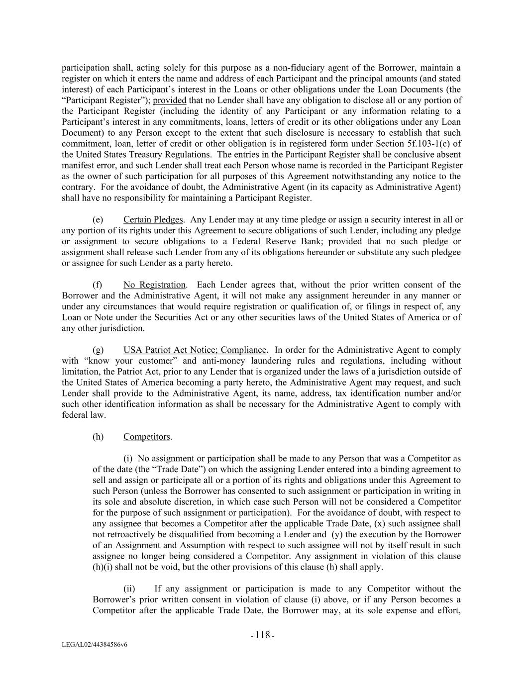 participation shall, acting solely for this purpose as a non-fiduciary agent of the Borrower, maintain a register on which it enters the name and address of each Participant and the principal amounts (and stated interest) of each Participant’s interest in the Loans or other obligations under the Loan Documents (the “Participant Register”); provided that no Lender shall have any obligation to disclose all or any portion of the Participant Register (including the identity of any Participant or any information relating to a Participant’s interest in any commitments, loans, letters of credit or its other obligations under any Loan Document) to any Person except to the extent that such disclosure is necessary to establish that such commitment, loan, letter of credit or other obligation is in registered form under Section 5f.103-1(c) of the United States Treasury Regulations. The entries in the Participant Register shall be conclusive absent manifest error, and such Lender shall treat each Person whose name is recorded in the Participant Register as the owner of such participation for all purposes of this Agreement notwithstanding any notice to the contrary. For the avoidance of doubt, the Administrative Agent (in its capacity as Administrative Agent) shall have no responsibility for maintaining a Participant Register. (e) Certain Pledges. Any Lender may at any time pledge or assign a security interest in all or any portion of its rights under this Agreement to secure obligations of such Lender, including any pledge or assignment to secure obligations to a Federal Reserve Bank; provided that no such pledge or assignment shall release such Lender from any of its obligations hereunder or substitute any such pledgee or assignee for such Lender as a party hereto. (f) No Registration. Each Lender agrees that, without the prior written consent of the Borrower and the Administrative Agent, it will not make any assignment hereunder in any manner or under any circumstances that would require registration or qualification of, or filings in respect of, any Loan or Note under the Securities Act or any other securities laws of the United States of America or of any other jurisdiction. (g) USA Patriot Act Notice; Compliance. In order for the Administrative Agent to comply with “know your customer” and anti-money laundering rules and regulations, including without limitation, the Patriot Act, prior to any Lender that is organized under the laws of a jurisdiction outside of the United States of America becoming a party hereto, the Administrative Agent may request, and such Lender shall provide to the Administrative Agent, its name, address, tax identification number and/or such other identification information as shall be necessary for the Administrative Agent to comply with federal law. (h) Competitors. (i) No assignment or participation shall be made to any Person that was a Competitor as of the date (the “Trade Date”) on which the assigning Lender entered into a binding agreement to sell and assign or participate all or a portion of its rights and obligations under this Agreement to such Person (unless the Borrower has consented to such assignment or participation in writing in its sole and absolute discretion, in which case such Person will not be considered a Competitor for the purpose of such assignment or participation). For the avoidance of doubt, with respect to any assignee that becomes a Competitor after the applicable Trade Date, (x) such assignee shall not retroactively be disqualified from becoming a Lender and (y) the execution by the Borrower of an Assignment and Assumption with respect to such assignee will not by itself result in such assignee no longer being considered a Competitor. Any assignment in violation of this clause (h)(i) shall not be void, but the other provisions of this clause (h) shall apply. (ii) If any assignment or participation is made to any Competitor without the Borrower’s prior written consent in violation of clause (i) above, or if any Person becomes a Competitor after the applicable Trade Date, the Borrower may, at its sole expense and effort, - 118 - LEGAL02/44384586v6