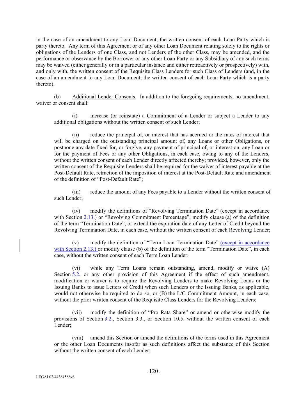 in the case of an amendment to any Loan Document, the written consent of each Loan Party which is party thereto. Any term of this Agreement or of any other Loan Document relating solely to the rights or obligations of the Lenders of one Class, and not Lenders of the other Class, may be amended, and the performance or observance by the Borrower or any other Loan Party or any Subsidiary of any such terms may be waived (either generally or in a particular instance and either retroactively or prospectively) with, and only with, the written consent of the Requisite Class Lenders for such Class of Lenders (and, in the case of an amendment to any Loan Document, the written consent of each Loan Party which is a party thereto). (b) Additional Lender Consents. In addition to the foregoing requirements, no amendment, waiver or consent shall: (i) increase (or reinstate) a Commitment of a Lender or subject a Lender to any additional obligations without the written consent of such Lender; (ii) reduce the principal of, or interest that has accrued or the rates of interest that will be charged on the outstanding principal amount of, any Loans or other Obligations, or postpone any date fixed for, or forgive, any payment of principal of, or interest on, any Loan or for the payment of Fees or any other Obligations, in each case, owing to any of the Lenders, without the written consent of each Lender directly affected thereby; provided, however, only the written consent of the Requisite Lenders shall be required for the waiver of interest payable at the Post-Default Rate, retraction of the imposition of interest at the Post-Default Rate and amendment of the definition of “Post-Default Rate”; (iii) reduce the amount of any Fees payable to a Lender without the written consent of such Lender; (iv) modify the definitions of “Revolving Termination Date” (except in accordance with Section 2.13.) or “Revolving Commitment Percentage”, modify clause (a) of the definition of the term “Termination Date”, or extend the expiration date of any Letter of Credit beyond the Revolving Termination Date, in each case, without the written consent of each Revolving Lender; (v) modify the definition of “Term Loan Termination Date” (except in accordance with Section 2.13.) or modify clause (b) of the definition of the term “Termination Date”, in each case, without the written consent of each Term Loan Lender; (vi) while any Term Loans remain outstanding, amend, modify or waive (A) Section 5.2. or any other provision of this Agreement if the effect of such amendment, modification or waiver is to require the Revolving Lenders to make Revolving Loans or the Issuing Banks to issue Letters of Credit when such Lenders or the Issuing Banks, as applicable, would not otherwise be required to do so, or (B) the L/C Commitment Amount, in each case, without the prior written consent of the Requisite Class Lenders for the Revolving Lenders; (vii) modify the definition of “Pro Rata Share” or amend or otherwise modify the provisions of Section 3.2., Section 3.3., or Section 10.5. without the written consent of each Lender; (viii) amend this Section or amend the definitions of the terms used in this Agreement or the other Loan Documents insofar as such definitions affect the substance of this Section without the written consent of each Lender; - 120 - LEGAL02/44384586v6