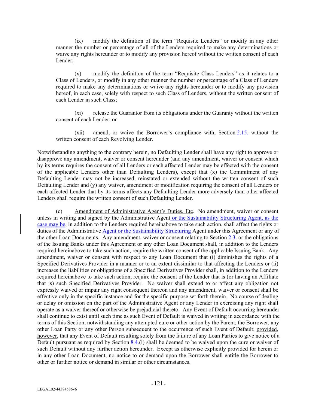 (ix) modify the definition of the term “Requisite Lenders” or modify in any other manner the number or percentage of all of the Lenders required to make any determinations or waive any rights hereunder or to modify any provision hereof without the written consent of each Lender; (x) modify the definition of the term “Requisite Class Lenders” as it relates to a Class of Lenders, or modify in any other manner the number or percentage of a Class of Lenders required to make any determinations or waive any rights hereunder or to modify any provision hereof, in each case, solely with respect to such Class of Lenders, without the written consent of each Lender in such Class; (xi) release the Guarantor from its obligations under the Guaranty without the written consent of each Lender; or (xii) amend, or waive the Borrower’s compliance with, Section 2.15. without the written consent of each Revolving Lender. Notwithstanding anything to the contrary herein, no Defaulting Lender shall have any right to approve or disapprove any amendment, waiver or consent hereunder (and any amendment, waiver or consent which by its terms requires the consent of all Lenders or each affected Lender may be effected with the consent of the applicable Lenders other than Defaulting Lenders), except that (x) the Commitment of any Defaulting Lender may not be increased, reinstated or extended without the written consent of such Defaulting Lender and (y) any waiver, amendment or modification requiring the consent of all Lenders or each affected Lender that by its terms affects any Defaulting Lender more adversely than other affected Lenders shall require the written consent of such Defaulting Lender. (c) Amendment of Administrative Agent’s Duties, Etc. No amendment, waiver or consent unless in writing and signed by the Administrative Agent or the Sustainability Structuring Agent, as the case may be, in addition to the Lenders required hereinabove to take such action, shall affect the rights or duties of the Administrative Agent or the Sustainability Structuring Agent under this Agreement or any of the other Loan Documents. Any amendment, waiver or consent relating to Section 2.3. or the obligations of the Issuing Banks under this Agreement or any other Loan Document shall, in addition to the Lenders required hereinabove to take such action, require the written consent of the applicable Issuing Bank. Any amendment, waiver or consent with respect to any Loan Document that (i) diminishes the rights of a Specified Derivatives Provider in a manner or to an extent dissimilar to that affecting the Lenders or (ii) increases the liabilities or obligations of a Specified Derivatives Provider shall, in addition to the Lenders required hereinabove to take such action, require the consent of the Lender that is (or having an Affiliate that is) such Specified Derivatives Provider. No waiver shall extend to or affect any obligation not expressly waived or impair any right consequent thereon and any amendment, waiver or consent shall be effective only in the specific instance and for the specific purpose set forth therein. No course of dealing or delay or omission on the part of the Administrative Agent or any Lender in exercising any right shall operate as a waiver thereof or otherwise be prejudicial thereto. Any Event of Default occurring hereunder shall continue to exist until such time as such Event of Default is waived in writing in accordance with the terms of this Section, notwithstanding any attempted cure or other action by the Parent, the Borrower, any other Loan Party or any other Person subsequent to the occurrence of such Event of Default; provided, however, that any Event of Default resulting solely from the failure of any Loan Parties to give notice of a Default pursuant as required by Section 8.4.(i) shall be deemed to be waived upon the cure or waiver of such Default without any further action hereunder. Except as otherwise explicitly provided for herein or in any other Loan Document, no notice to or demand upon the Borrower shall entitle the Borrower to other or further notice or demand in similar or other circumstances. - 121 - LEGAL02/44384586v6