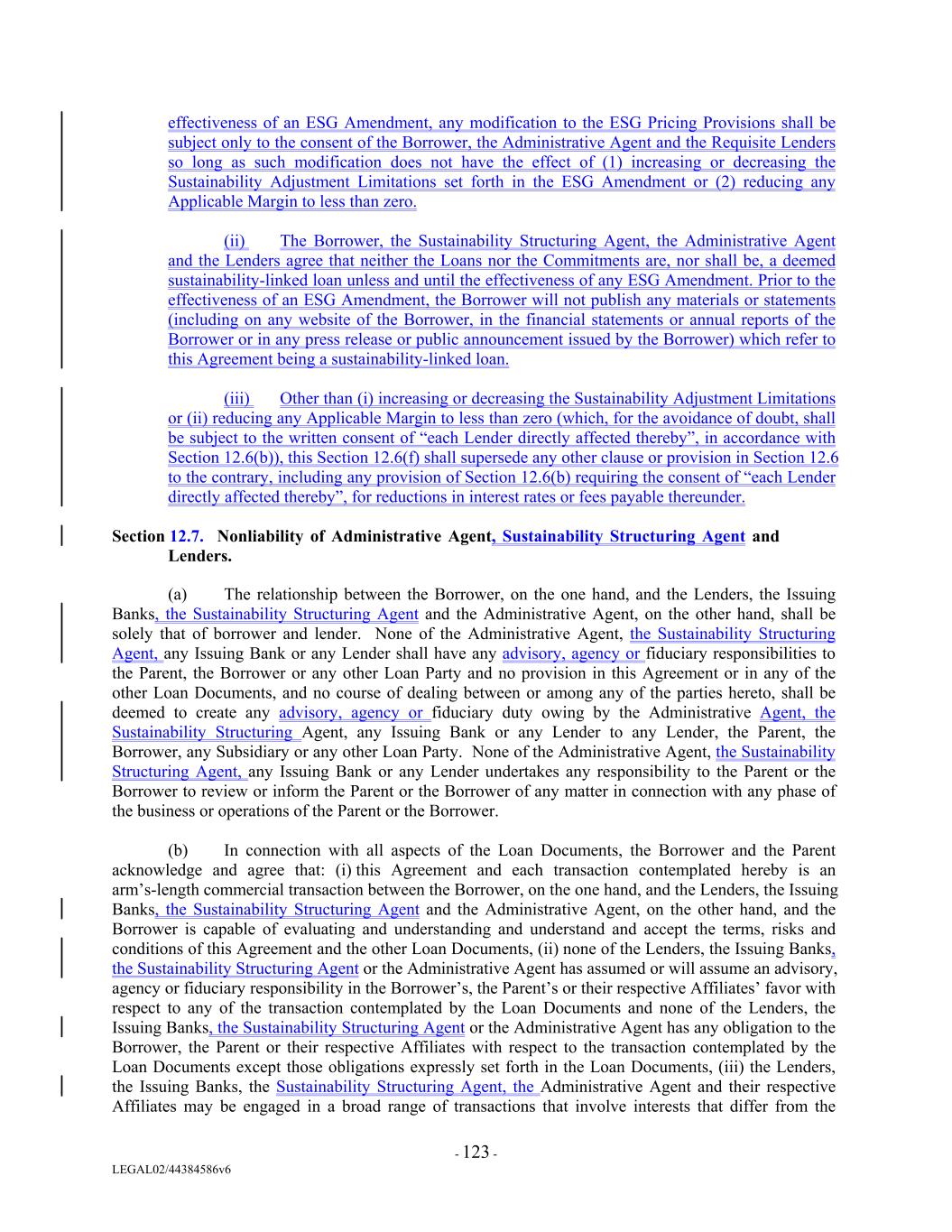 effectiveness of an ESG Amendment, any modification to the ESG Pricing Provisions shall be subject only to the consent of the Borrower, the Administrative Agent and the Requisite Lenders so long as such modification does not have the effect of (1) increasing or decreasing the Sustainability Adjustment Limitations set forth in the ESG Amendment or (2) reducing any Applicable Margin to less than zero. (ii) The Borrower, the Sustainability Structuring Agent, the Administrative Agent and the Lenders agree that neither the Loans nor the Commitments are, nor shall be, a deemed sustainability-linked loan unless and until the effectiveness of any ESG Amendment. Prior to the effectiveness of an ESG Amendment, the Borrower will not publish any materials or statements (including on any website of the Borrower, in the financial statements or annual reports of the Borrower or in any press release or public announcement issued by the Borrower) which refer to this Agreement being a sustainability-linked loan. (iii) Other than (i) increasing or decreasing the Sustainability Adjustment Limitations or (ii) reducing any Applicable Margin to less than zero (which, for the avoidance of doubt, shall be subject to the written consent of “each Lender directly affected thereby”, in accordance with Section 12.6(b)), this Section 12.6(f) shall supersede any other clause or provision in Section 12.6 to the contrary, including any provision of Section 12.6(b) requiring the consent of “each Lender directly affected thereby”, for reductions in interest rates or fees payable thereunder. Section 12.7. Nonliability of Administrative Agent, Sustainability Structuring Agent and Lenders. (a) The relationship between the Borrower, on the one hand, and the Lenders, the Issuing Banks, the Sustainability Structuring Agent and the Administrative Agent, on the other hand, shall be solely that of borrower and lender. None of the Administrative Agent, the Sustainability Structuring Agent, any Issuing Bank or any Lender shall have any advisory, agency or fiduciary responsibilities to the Parent, the Borrower or any other Loan Party and no provision in this Agreement or in any of the other Loan Documents, and no course of dealing between or among any of the parties hereto, shall be deemed to create any advisory, agency or fiduciary duty owing by the Administrative Agent, the Sustainability Structuring Agent, any Issuing Bank or any Lender to any Lender, the Parent, the Borrower, any Subsidiary or any other Loan Party. None of the Administrative Agent, the Sustainability Structuring Agent, any Issuing Bank or any Lender undertakes any responsibility to the Parent or the Borrower to review or inform the Parent or the Borrower of any matter in connection with any phase of the business or operations of the Parent or the Borrower. (b) In connection with all aspects of the Loan Documents, the Borrower and the Parent acknowledge and agree that: (i) this Agreement and each transaction contemplated hereby is an arm’s-length commercial transaction between the Borrower, on the one hand, and the Lenders, the Issuing Banks, the Sustainability Structuring Agent and the Administrative Agent, on the other hand, and the Borrower is capable of evaluating and understanding and understand and accept the terms, risks and conditions of this Agreement and the other Loan Documents, (ii) none of the Lenders, the Issuing Banks, the Sustainability Structuring Agent or the Administrative Agent has assumed or will assume an advisory, agency or fiduciary responsibility in the Borrower’s, the Parent’s or their respective Affiliates’ favor with respect to any of the transaction contemplated by the Loan Documents and none of the Lenders, the Issuing Banks, the Sustainability Structuring Agent or the Administrative Agent has any obligation to the Borrower, the Parent or their respective Affiliates with respect to the transaction contemplated by the Loan Documents except those obligations expressly set forth in the Loan Documents, (iii) the Lenders, the Issuing Banks, the Sustainability Structuring Agent, the Administrative Agent and their respective Affiliates may be engaged in a broad range of transactions that involve interests that differ from the - 123 - LEGAL02/44384586v6