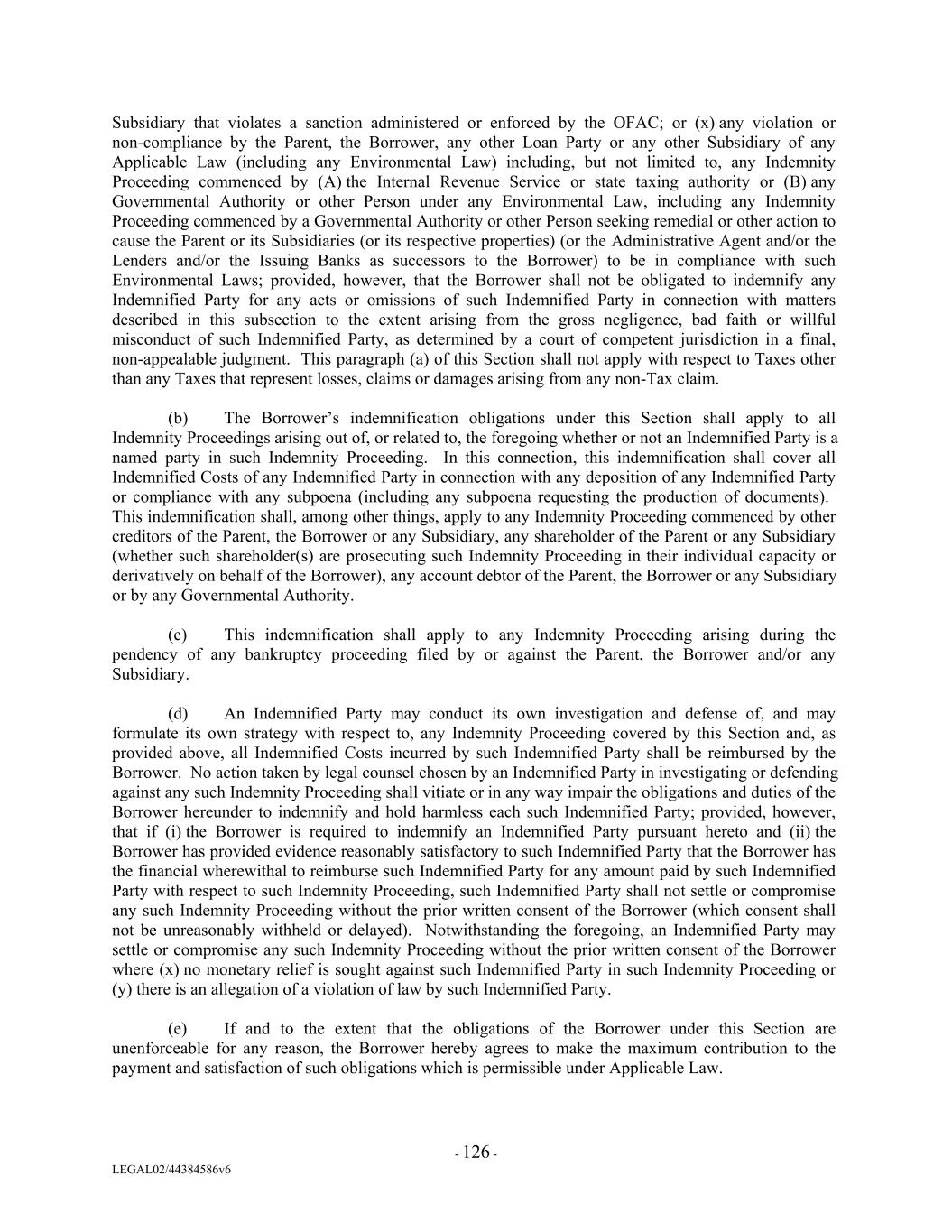 Subsidiary that violates a sanction administered or enforced by the OFAC; or (x) any violation or non-compliance by the Parent, the Borrower, any other Loan Party or any other Subsidiary of any Applicable Law (including any Environmental Law) including, but not limited to, any Indemnity Proceeding commenced by (A) the Internal Revenue Service or state taxing authority or (B) any Governmental Authority or other Person under any Environmental Law, including any Indemnity Proceeding commenced by a Governmental Authority or other Person seeking remedial or other action to cause the Parent or its Subsidiaries (or its respective properties) (or the Administrative Agent and/or the Lenders and/or the Issuing Banks as successors to the Borrower) to be in compliance with such Environmental Laws; provided, however, that the Borrower shall not be obligated to indemnify any Indemnified Party for any acts or omissions of such Indemnified Party in connection with matters described in this subsection to the extent arising from the gross negligence, bad faith or willful misconduct of such Indemnified Party, as determined by a court of competent jurisdiction in a final, non-appealable judgment. This paragraph (a) of this Section shall not apply with respect to Taxes other than any Taxes that represent losses, claims or damages arising from any non-Tax claim. (b) The Borrower’s indemnification obligations under this Section shall apply to all Indemnity Proceedings arising out of, or related to, the foregoing whether or not an Indemnified Party is a named party in such Indemnity Proceeding. In this connection, this indemnification shall cover all Indemnified Costs of any Indemnified Party in connection with any deposition of any Indemnified Party or compliance with any subpoena (including any subpoena requesting the production of documents). This indemnification shall, among other things, apply to any Indemnity Proceeding commenced by other creditors of the Parent, the Borrower or any Subsidiary, any shareholder of the Parent or any Subsidiary (whether such shareholder(s) are prosecuting such Indemnity Proceeding in their individual capacity or derivatively on behalf of the Borrower), any account debtor of the Parent, the Borrower or any Subsidiary or by any Governmental Authority. (c) This indemnification shall apply to any Indemnity Proceeding arising during the pendency of any bankruptcy proceeding filed by or against the Parent, the Borrower and/or any Subsidiary. (d) An Indemnified Party may conduct its own investigation and defense of, and may formulate its own strategy with respect to, any Indemnity Proceeding covered by this Section and, as provided above, all Indemnified Costs incurred by such Indemnified Party shall be reimbursed by the Borrower. No action taken by legal counsel chosen by an Indemnified Party in investigating or defending against any such Indemnity Proceeding shall vitiate or in any way impair the obligations and duties of the Borrower hereunder to indemnify and hold harmless each such Indemnified Party; provided, however, that if (i) the Borrower is required to indemnify an Indemnified Party pursuant hereto and (ii) the Borrower has provided evidence reasonably satisfactory to such Indemnified Party that the Borrower has the financial wherewithal to reimburse such Indemnified Party for any amount paid by such Indemnified Party with respect to such Indemnity Proceeding, such Indemnified Party shall not settle or compromise any such Indemnity Proceeding without the prior written consent of the Borrower (which consent shall not be unreasonably withheld or delayed). Notwithstanding the foregoing, an Indemnified Party may settle or compromise any such Indemnity Proceeding without the prior written consent of the Borrower where (x) no monetary relief is sought against such Indemnified Party in such Indemnity Proceeding or (y) there is an allegation of a violation of law by such Indemnified Party. (e) If and to the extent that the obligations of the Borrower under this Section are unenforceable for any reason, the Borrower hereby agrees to make the maximum contribution to the payment and satisfaction of such obligations which is permissible under Applicable Law. - 126 - LEGAL02/44384586v6
