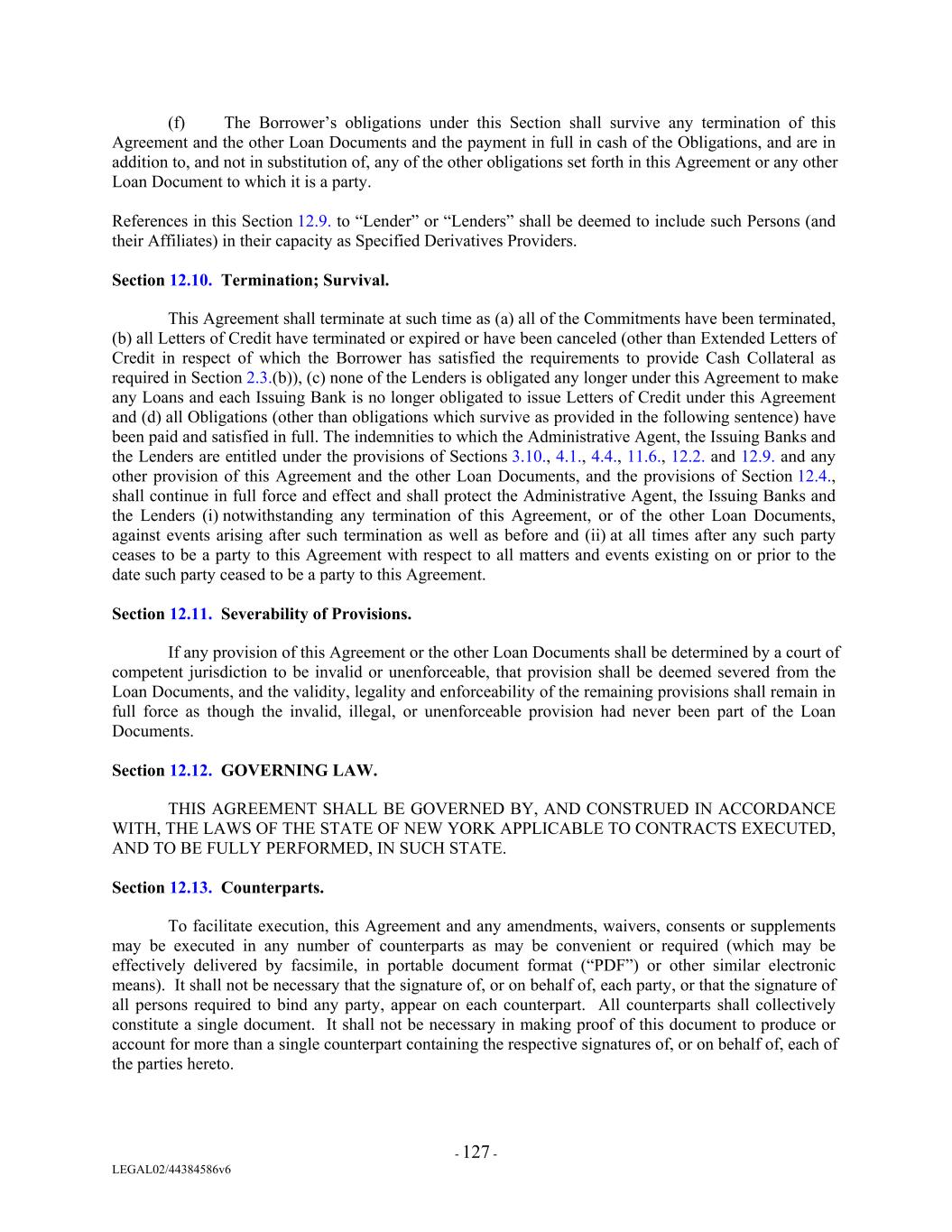 (f) The Borrower’s obligations under this Section shall survive any termination of this Agreement and the other Loan Documents and the payment in full in cash of the Obligations, and are in addition to, and not in substitution of, any of the other obligations set forth in this Agreement or any other Loan Document to which it is a party. References in this Section 12.9. to “Lender” or “Lenders” shall be deemed to include such Persons (and their Affiliates) in their capacity as Specified Derivatives Providers. Section 12.10. Termination; Survival. This Agreement shall terminate at such time as (a) all of the Commitments have been terminated, (b) all Letters of Credit have terminated or expired or have been canceled (other than Extended Letters of Credit in respect of which the Borrower has satisfied the requirements to provide Cash Collateral as required in Section 2.3.(b)), (c) none of the Lenders is obligated any longer under this Agreement to make any Loans and each Issuing Bank is no longer obligated to issue Letters of Credit under this Agreement and (d) all Obligations (other than obligations which survive as provided in the following sentence) have been paid and satisfied in full. The indemnities to which the Administrative Agent, the Issuing Banks and the Lenders are entitled under the provisions of Sections 3.10., 4.1., 4.4., 11.6., 12.2. and 12.9. and any other provision of this Agreement and the other Loan Documents, and the provisions of Section 12.4., shall continue in full force and effect and shall protect the Administrative Agent, the Issuing Banks and the Lenders (i) notwithstanding any termination of this Agreement, or of the other Loan Documents, against events arising after such termination as well as before and (ii) at all times after any such party ceases to be a party to this Agreement with respect to all matters and events existing on or prior to the date such party ceased to be a party to this Agreement. Section 12.11. Severability of Provisions. If any provision of this Agreement or the other Loan Documents shall be determined by a court of competent jurisdiction to be invalid or unenforceable, that provision shall be deemed severed from the Loan Documents, and the validity, legality and enforceability of the remaining provisions shall remain in full force as though the invalid, illegal, or unenforceable provision had never been part of the Loan Documents. Section 12.12. GOVERNING LAW. THIS AGREEMENT SHALL BE GOVERNED BY, AND CONSTRUED IN ACCORDANCE WITH, THE LAWS OF THE STATE OF NEW YORK APPLICABLE TO CONTRACTS EXECUTED, AND TO BE FULLY PERFORMED, IN SUCH STATE. Section 12.13. Counterparts. To facilitate execution, this Agreement and any amendments, waivers, consents or supplements may be executed in any number of counterparts as may be convenient or required (which may be effectively delivered by facsimile, in portable document format (“PDF”) or other similar electronic means). It shall not be necessary that the signature of, or on behalf of, each party, or that the signature of all persons required to bind any party, appear on each counterpart. All counterparts shall collectively constitute a single document. It shall not be necessary in making proof of this document to produce or account for more than a single counterpart containing the respective signatures of, or on behalf of, each of the parties hereto. - 127 - LEGAL02/44384586v6