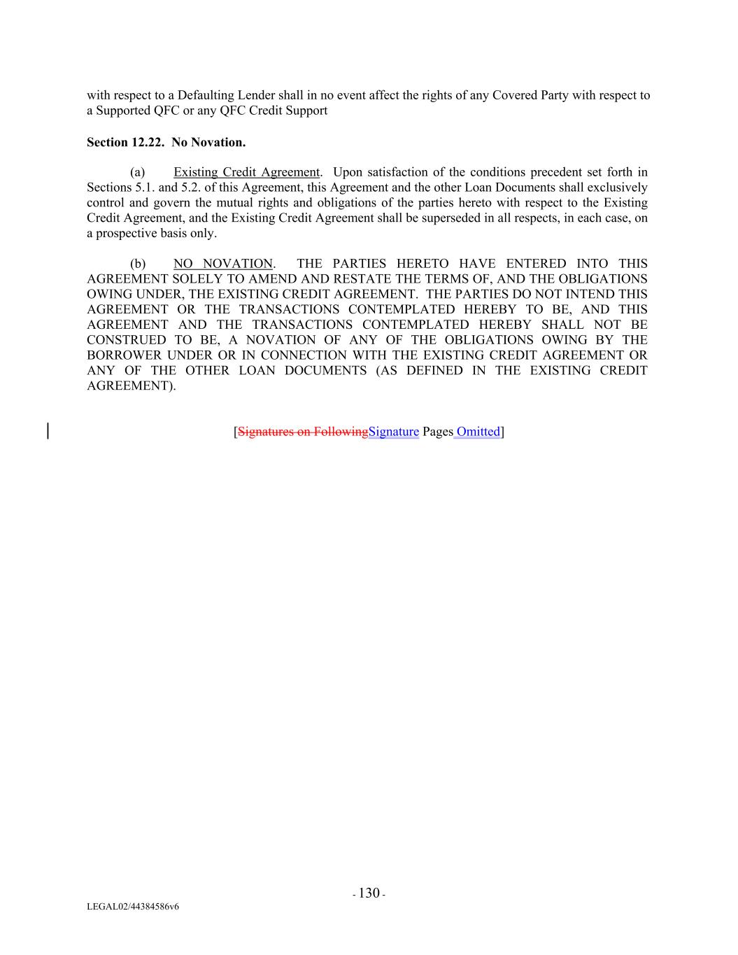 with respect to a Defaulting Lender shall in no event affect the rights of any Covered Party with respect to a Supported QFC or any QFC Credit Support Section 12.22. No Novation. (a) Existing Credit Agreement. Upon satisfaction of the conditions precedent set forth in Sections 5.1. and 5.2. of this Agreement, this Agreement and the other Loan Documents shall exclusively control and govern the mutual rights and obligations of the parties hereto with respect to the Existing Credit Agreement, and the Existing Credit Agreement shall be superseded in all respects, in each case, on a prospective basis only. (b) NO NOVATION. THE PARTIES HERETO HAVE ENTERED INTO THIS AGREEMENT SOLELY TO AMEND AND RESTATE THE TERMS OF, AND THE OBLIGATIONS OWING UNDER, THE EXISTING CREDIT AGREEMENT. THE PARTIES DO NOT INTEND THIS AGREEMENT OR THE TRANSACTIONS CONTEMPLATED HEREBY TO BE, AND THIS AGREEMENT AND THE TRANSACTIONS CONTEMPLATED HEREBY SHALL NOT BE CONSTRUED TO BE, A NOVATION OF ANY OF THE OBLIGATIONS OWING BY THE BORROWER UNDER OR IN CONNECTION WITH THE EXISTING CREDIT AGREEMENT OR ANY OF THE OTHER LOAN DOCUMENTS (AS DEFINED IN THE EXISTING CREDIT AGREEMENT). [Signatures on FollowingSignature Pages Omitted] - 130 - LEGAL02/44384586v6