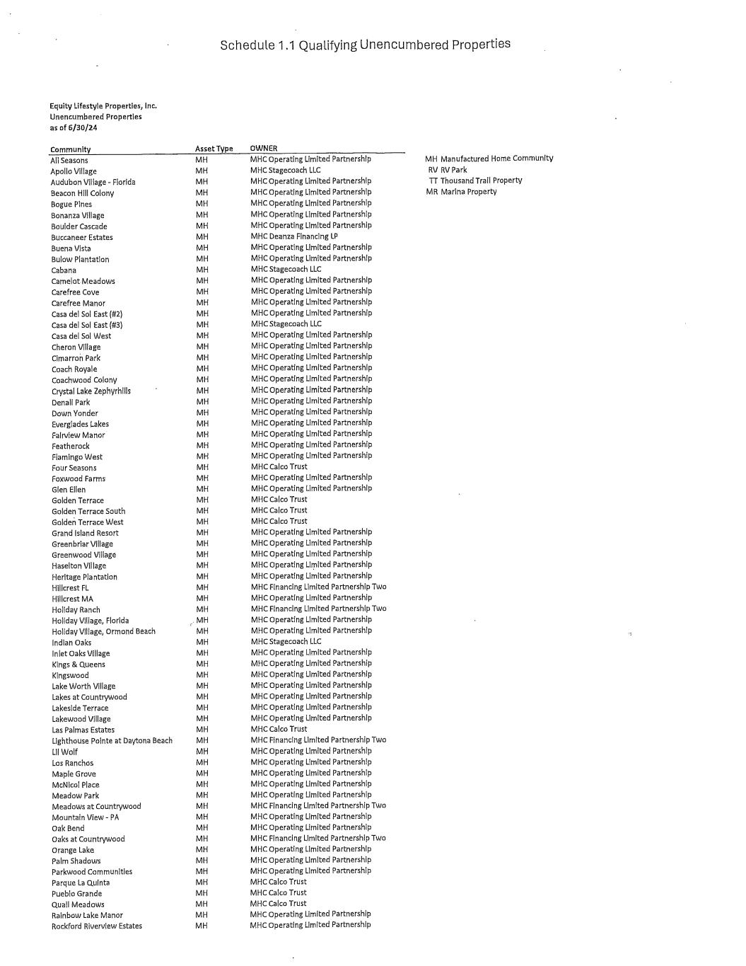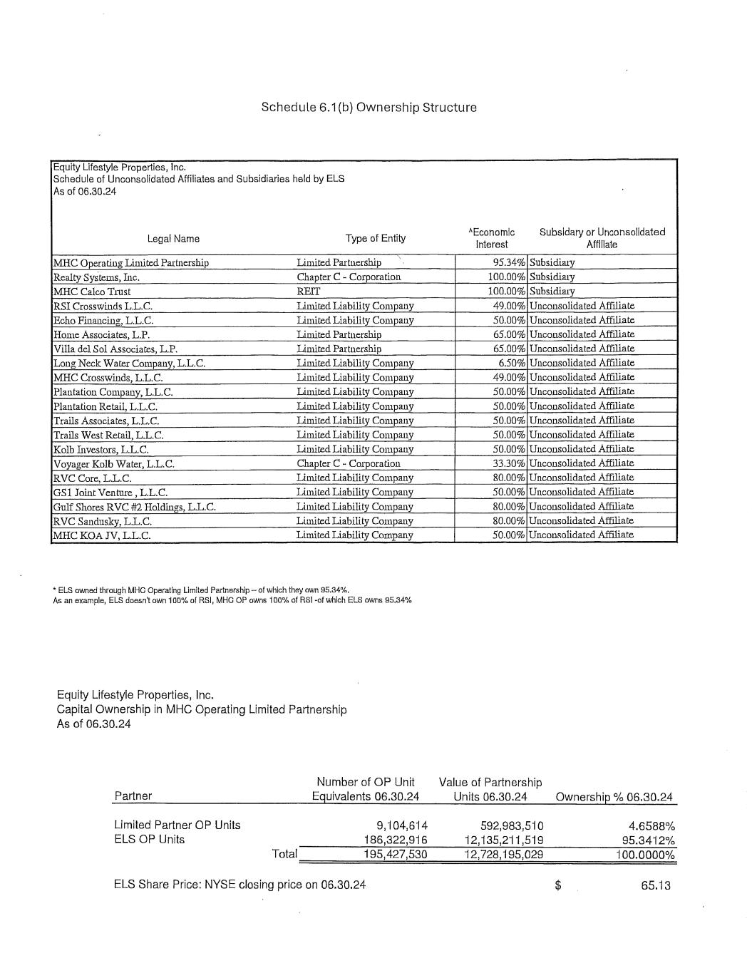 SCHEDULE 6.1.(h) Litigation Please refer to: - Risks Relating to Governmental Regulation and Potential Litigation – o Page 16 of the 10-K for Equity Lifestyle Properties, Inc. filed for the annual period ended 12/31/23, which can be found at https://equitylifestyle.gcs- web.com/node/23006/html as supplemented Risk Factors on Page 31 of the 10-Q for Equity Lifestyle Properties, Inc. filed for the quarter ended 3/31/24, which can be found at https://equitylifestyle.gcs- web.com/node/23211/html#ie90eec58395c4b2e95aea631160f7411_109 (“2024 Q1 10Q”) - Note 11 Commitments and Contingencies – Page 14 of the 2024 Q1 10Q.