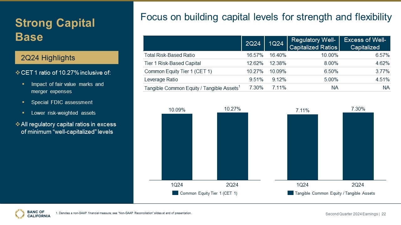 Strong capital ratios well above the regulatory thresholds for "well capitalized" banks at June 30, 2024, including an estimated 16.57% Total risk-based capital ratio, 12.62% Tier 1 capital ratio, 10.27% CET1 capital ratio, and 9.51% Tier 1 leverage ratio.