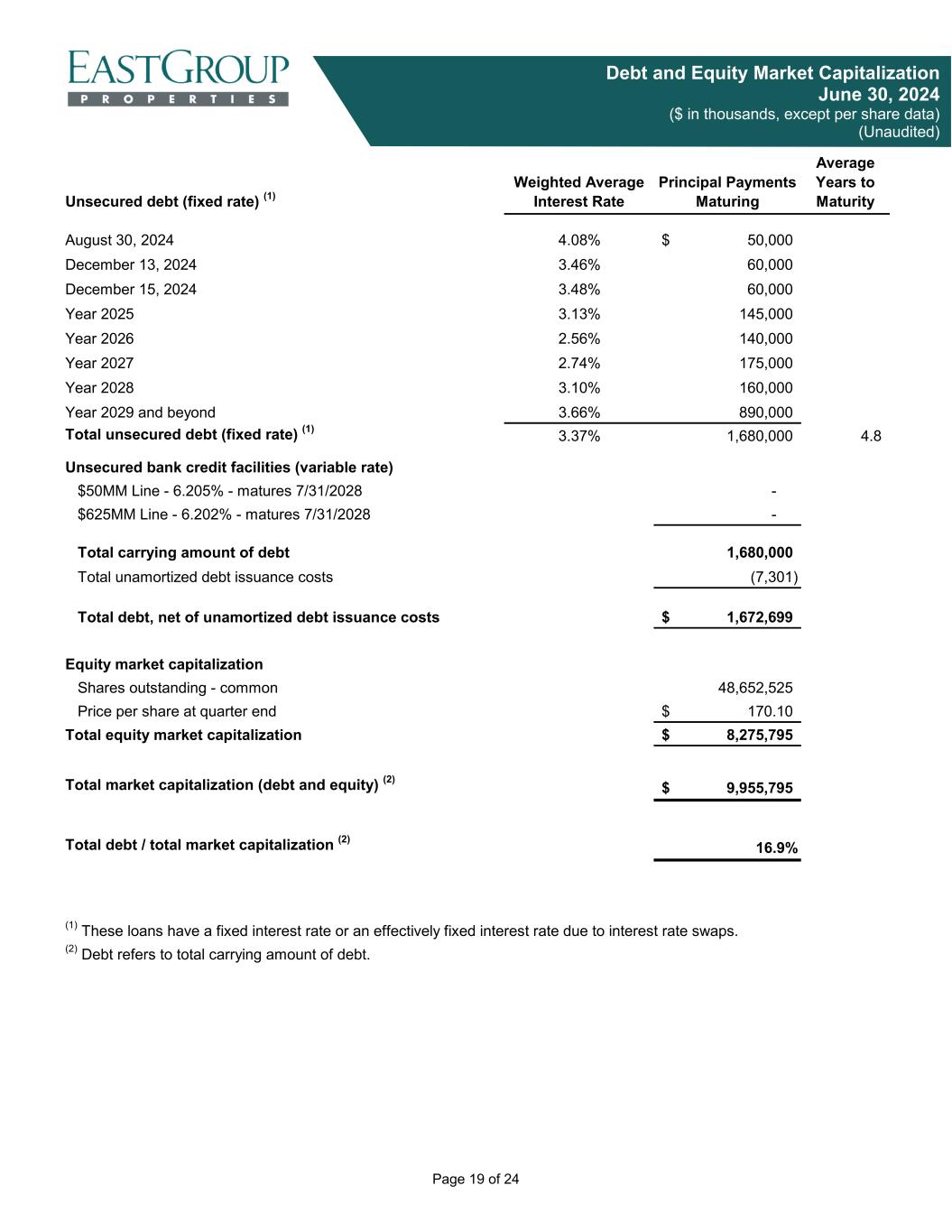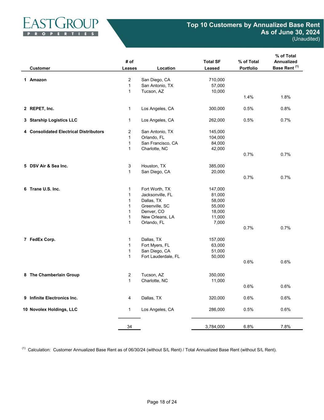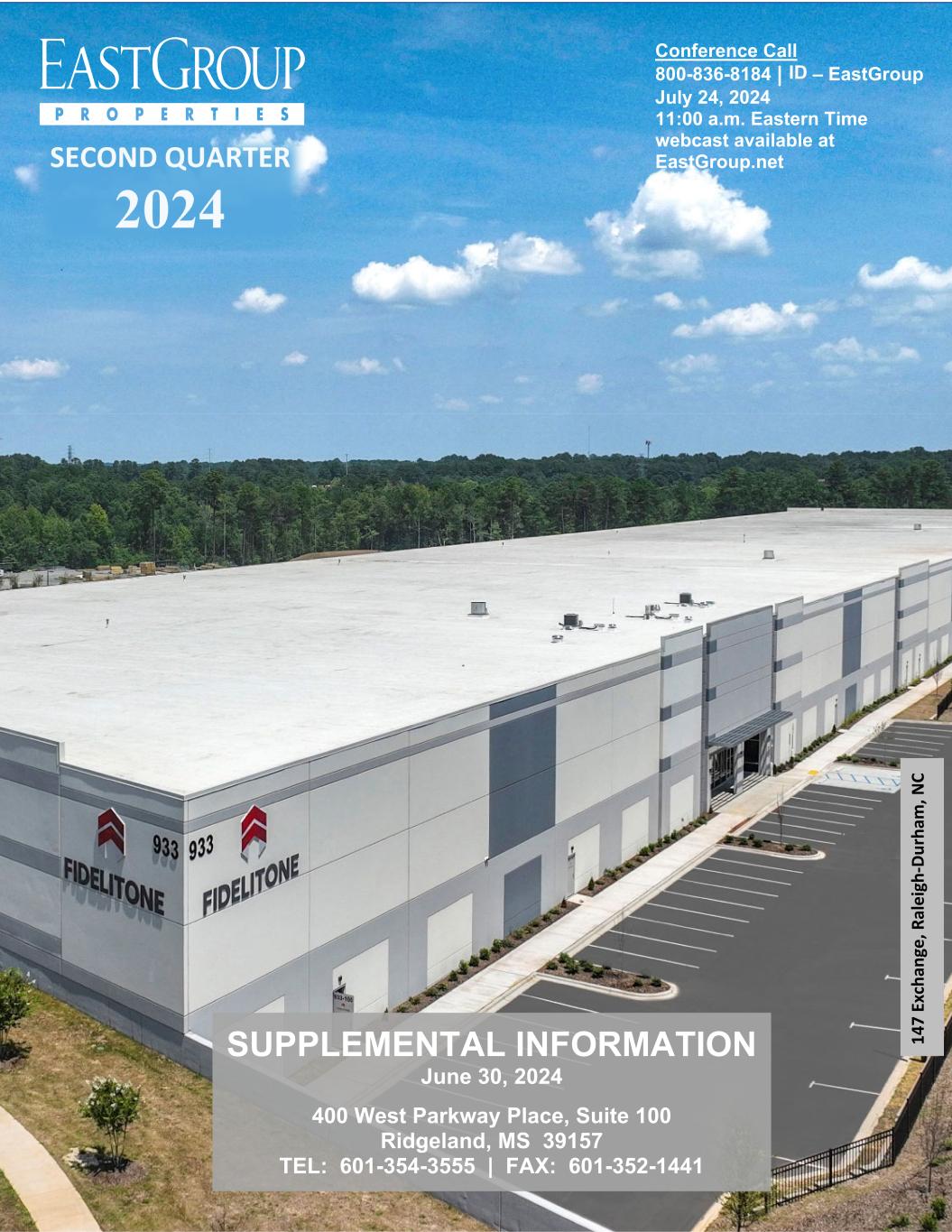 Page 1 of 24 Table of Contents Conference Call 800-836-8184 | ID – EastGroup July 24, 2024 11:00 a.m. Eastern Time webcast available at EastGroup.net 1 4 7 E xc h an ge , R al e ig h -D u rh am , N C SUPPLEMENTAL INFORMATION June 30, 2024 400 West Parkway Place, Suite 100 Ridgeland, MS 39157 TEL: 601-354-3555 | FAX: 601-352-1441