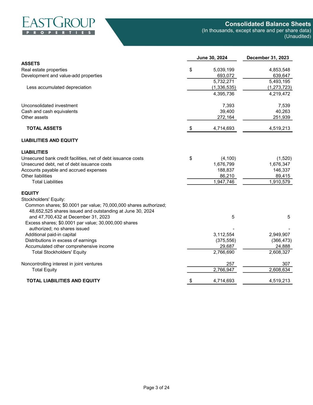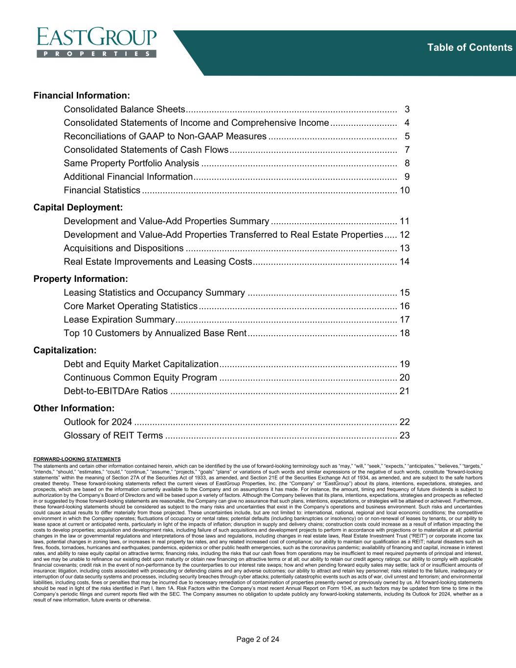 Page 2 of 24 Table of Contents Financial Information: Consolidated Balance Sheets .................................................................................. 3 Consolidated Statements of Income and Comprehensive Income .......................... 4 Reconciliations of GAAP to Non-GAAP Measures .................................................. 5 Consolidated Statements of Cash Flows ................................................................. 7 Same Property Portfolio Analysis ............................................................................ 8 Additional Financial Information ............................................................................... 9 Financial Statistics ................................................................................................... 10 Capital Deployment: Development and Value-Add Properties Summary ................................................. 11 Development and Value-Add Properties Transferred to Real Estate Properties ..... 12 Acquisitions and Dispositions .................................................................................. 13 Real Estate Improvements and Leasing Costs ........................................................ 14 Property Information: Leasing Statistics and Occupancy Summary .......................................................... 15 Core Market Operating Statistics ............................................................................. 16 Lease Expiration Summary ...................................................................................... 17 Top 10 Customers by Annualized Base Rent .......................................................... 18 Capitalization: Debt and Equity Market Capitalization ..................................................................... 19 Continuous Common Equity Program ..................................................................... 20 Debt-to-EBITDAre Ratios ........................................................................................ 21 Other Information: Outlook for 2024 ...................................................................................................... 22 Glossary of REIT Terms .......................................................................................... 23 FORWARD-LOOKING STATEMENTS The statements and certain other information contained herein, which can be identified by the use of forward-looking terminology such as “may,” “will,” “seek,” “expects,” “anticipates,” “believes,” “targets,” “intends,” “should,” “estimates,” “could,” “continue,” “assume,” “projects,” “goals” “plans” or variations of such words and similar expressions or the negative of such words, constitute “forward-looking statements” within the meaning of Section 27A of the Securities Act of 1933, as amended, and Section 21E of the Securities Exchange Act of 1934, as amended, and are subject to the safe harbors created thereby. These forward-looking statements reflect the current views of EastGroup Properties, Inc. (the “Company” or “EastGroup”) about its plans, intentions, expectations, strategies, and prospects, which are based on the information currently available to the Company and on assumptions it has made. For instance, the amount, timing and frequency of future dividends is subject to authorization by the Company’s Board of Directors and will be based upon a variety of factors. Although the Company believes that its plans, intentions, expectations, strategies and prospects as reflected in or suggested by those forward-looking statements are reasonable, the Company can give no assurance that such plans, intentions, expectations, or strategies will be attained or achieved. Furthermore, these forward-looking statements should be considered as subject to the many risks and uncertainties that exist in the Company’s operations and business environment. Such risks and uncertainties could cause actual results to differ materially from those projected. These uncertainties include, but are not limited to: international, national, regional and local economic conditions; the competitive environment in which the Company operates; fluctuations of occupancy or rental rates; potential defaults (including bankruptcies or insolvency) on or non-renewal of leases by tenants, or our ability to lease space at current or anticipated rents, particularly in light of the impacts of inflation; disruption in supply and delivery chains; construction costs could increase as a result of inflation impacting the costs to develop properties; acquisition and development risks, including failure of such acquisitions and development projects to perform in accordance with projections or to materialize at all; potential changes in the law or governmental regulations and interpretations of those laws and regulations, including changes in real estate laws, Real Estate Investment Trust (“REIT”) or corporate income tax laws, potential changes in zoning laws, or increases in real property tax rates, and any related increased cost of compliance; our ability to maintain our qualification as a REIT; natural disasters such as fires, floods, tornadoes, hurricanes and earthquakes; pandemics, epidemics or other public health emergencies, such as the coronavirus pandemic; availability of financing and capital, increase in interest rates, and ability to raise equity capital on attractive terms; financing risks, including the risks that our cash flows from operations may be insufficient to meet required payments of principal and interest, and we may be unable to refinance our existing debt upon maturity or obtain new financing on attractive terms or at all; our ability to retain our credit agency ratings; our ability to comply with applicable financial covenants; credit risk in the event of non-performance by the counterparties to our interest rate swaps; how and when pending forward 