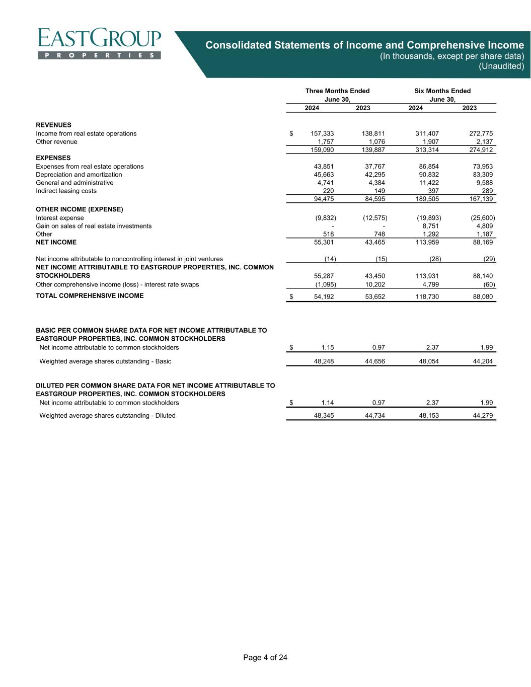 Page 4 of 24 Consolidated Statements of Income and Comprehensive Income (In thousands, except per share data) (Unaudited) 2024 2023 2024 2023 REVENUES Income from real estate operations 157,333$ 138,811 311,407 272,775 Other revenue 1,757 1,076 1,907 2,137 159,090 139,887 313,314 274,912 EXPENSES Expenses from real estate operations 43,851 37,767 86,854 73,953 Depreciation and amortization 45,663 42,295 90,832 83,309 General and administrative 4,741 4,384 11,422 9,588 Indirect leasing costs 220 149 397 289 94,475 84,595 189,505 167,139 OTHER INCOME (EXPENSE) Interest expense (9,832) (12,575) (19,893) (25,600) Gain on sales of real estate investments - - 8,751 4,809 Other 518 748 1,292 1,187 NET INCOME 55,301 43,465 113,959 88,169 Net income attributable to noncontrolling interest in joint ventures (14) (15) (28) (29) NET INCOME ATTRIBUTABLE TO EASTGROUP PROPERTIES, INC. COMMON STOCKHOLDERS 55,287 43,450 113,931 88,140 Other comprehensive income (loss) - interest rate swaps (1,095) 10,202 4,799 (60) TOTAL COMPREHENSIVE INCOME 54,192$ 53,652 118,730 88,080 BASIC PER COMMON SHARE DATA FOR NET INCOME ATTRIBUTABLE TO EASTGROUP PROPERTIES, INC. COMMON STOCKHOLDERS Net income attributable to common stockholders 1.15$ 0.97 2.37 1.99 Weighted average shares outstanding - Basic 48,248 44,656 48,054 44,204 DILUTED PER COMMON SHARE DATA FOR NET INCOME ATTRIBUTABLE TO EASTGROUP PROPERTIES, INC. COMMON STOCKHOLDERS Net income attributable to common stockholders 1.14$ 0.97 2.37 1.99 Weighted average shares outstanding - Diluted 48,345 44,734 48,153 44,279 Six Months Ended June 30,June 30, Three Months Ended