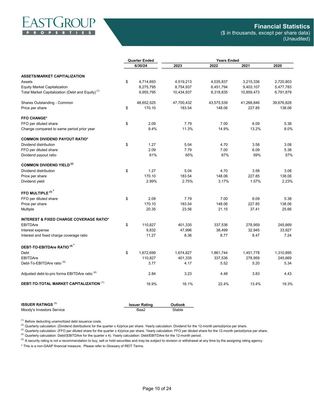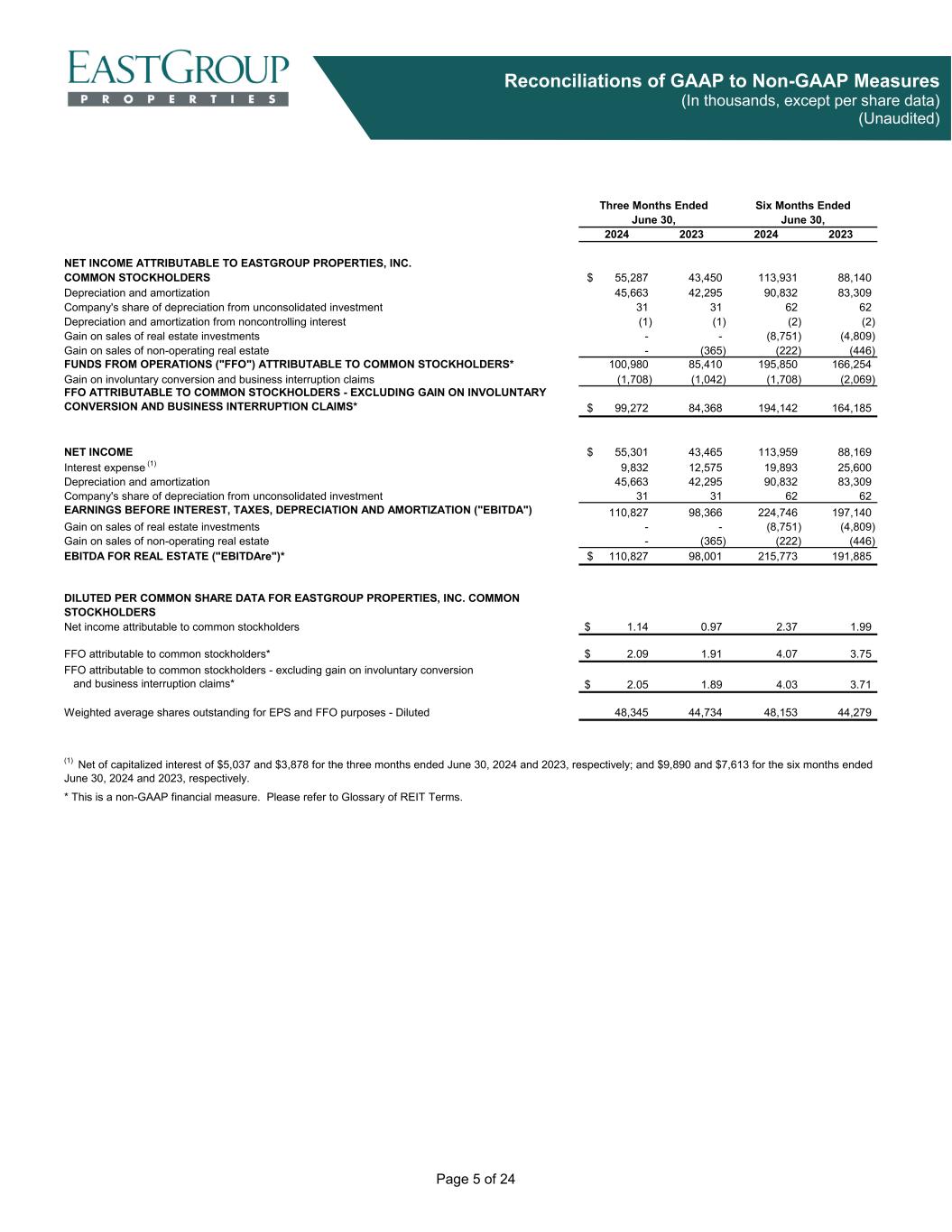 Page 5 of 24 Reconciliations of GAAP to Non-GAAP Measures (In thousands, except per share data) (Unaudited) 2024 2023 2024 2023 NET INCOME ATTRIBUTABLE TO EASTGROUP PROPERTIES, INC. COMMON STOCKHOLDERS 55,287$ 43,450 113,931 88,140 Depreciation and amortization 45,663 42,295 90,832 83,309 Company's share of depreciation from unconsolidated investment 31 31 62 62 Depreciation and amortization from noncontrolling interest (1) (1) (2) (2) Gain on sales of real estate investments - - (8,751) (4,809) Gain on sales of non-operating real estate - (365) (222) (446) FUNDS FROM OPERATIONS ("FFO") ATTRIBUTABLE TO COMMON STOCKHOLDERS* 100,980 85,410 195,850 166,254 Gain on involuntary conversion and business interruption claims (1,708) (1,042) (1,708) (2,069) FFO ATTRIBUTABLE TO COMMON STOCKHOLDERS - EXCLUDING GAIN ON INVOLUNTARY CONVERSION AND BUSINESS INTERRUPTION CLAIMS* 99,272$ 84,368 194,142 164,185 NET INCOME 55,301$ 43,465 113,959 88,169 Interest expense (1) 9,832 12,575 19,893 25,600 Depreciation and amortization 45,663 42,295 90,832 83,309 Company's share of depreciation from unconsolidated investment 31 31 62 62 EARNINGS BEFORE INTEREST, TAXES, DEPRECIATION AND AMORTIZATION ("EBITDA") 110,827 98,366 224,746 197,140 Gain on sales of real estate investments - - (8,751) (4,809) Gain on sales of non-operating real estate - (365) (222) (446) EBITDA FOR REAL ESTATE ("EBITDAre")* 110,827$ 98,001 215,773 191,885 DILUTED PER COMMON SHARE DATA FOR EASTGROUP PROPERTIES, INC. COMMON STOCKHOLDERS Net income attributable to common stockholders 1.14$ 0.97 2.37 1.99 FFO attributable to common stockholders* 2.09$ 1.91 4.07 3.75 FFO attributable to common stockholders - excluding gain on involuntary conversion and business interruption claims* 2.05$ 1.89 4.03 3.71 Weighted average shares outstanding for EPS and FFO purposes - Diluted 48,345 44,734 48,153 44,279 June 30, * This is a non-GAAP financial measure. Please refer to Glossary of REIT Terms. Three Months Ended June 30, Six Months Ended (1) Net of capitalized interest of $5,037 and $3,878 for the three months ended June 30, 2024 and 2023, respectively; and $9,890 and $7,613 for the six months ended June 30, 2024 and 2023, respectively.