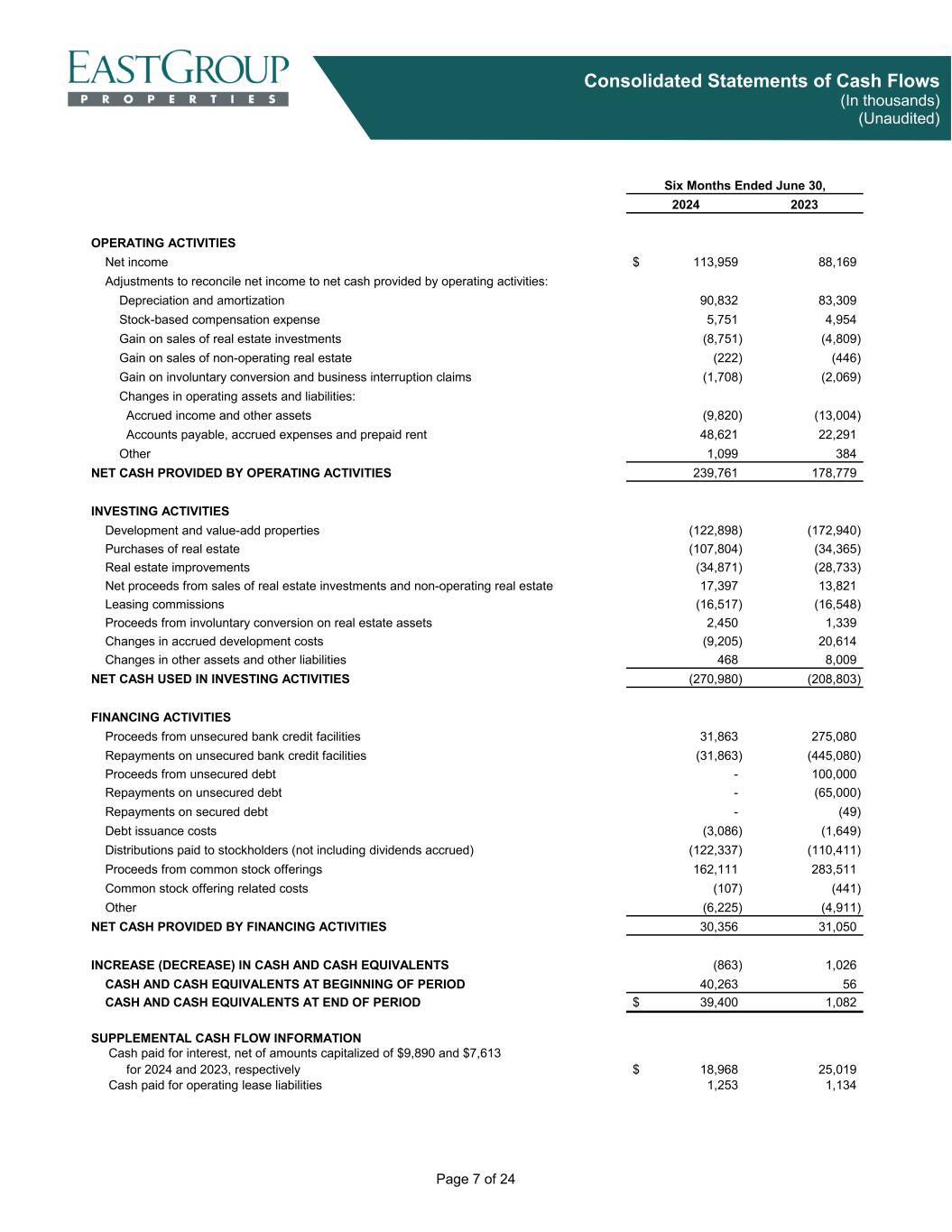 Page 7 of 24 Consolidated Statements of Cash Flows (In thousands) (Unaudited) 2024 2023 OPERATING ACTIVITIES Net income 113,959$ 88,169 Adjustments to reconcile net income to net cash provided by operating activities: Depreciation and amortization 90,832 83,309 Stock-based compensation expense 5,751 4,954 Gain on sales of real estate investments (8,751) (4,809) Gain on sales of non-operating real estate (222) (446) Gain on involuntary conversion and business interruption claims (1,708) (2,069) Changes in operating assets and liabilities: Accrued income and other assets (9,820) (13,004) Accounts payable, accrued expenses and prepaid rent 48,621 22,291 Other 1,099 384 NET CASH PROVIDED BY OPERATING ACTIVITIES 239,761 178,779 INVESTING ACTIVITIES Development and value-add properties (122,898) (172,940) Purchases of real estate (107,804) (34,365) Real estate improvements (34,871) (28,733) Net proceeds from sales of real estate investments and non-operating real estate 17,397 13,821 Leasing commissions (16,517) (16,548) Proceeds from involuntary conversion on real estate assets 2,450 1,339 Changes in accrued development costs (9,205) 20,614 Changes in other assets and other liabilities 468 8,009 NET CASH USED IN INVESTING ACTIVITIES (270,980) (208,803) FINANCING ACTIVITIES Proceeds from unsecured bank credit facilities 31,863 275,080 Repayments on unsecured bank credit facilities (31,863) (445,080) Proceeds from unsecured debt - 100,000 Repayments on unsecured debt - (65,000) Repayments on secured debt - (49) Debt issuance costs (3,086) (1,649) Distributions paid to stockholders (not including dividends accrued) (122,337) (110,411) Proceeds from common stock offerings 162,111 283,511 Common stock offering related costs (107) (441) Other (6,225) (4,911) NET CASH PROVIDED BY FINANCING ACTIVITIES 30,356 31,050 INCREASE (DECREASE) IN CASH AND CASH EQUIVALENTS (863) 1,026 CASH AND CASH EQUIVALENTS AT BEGINNING OF PERIOD 40,263 56 CASH AND CASH EQUIVALENTS AT END OF PERIOD 39,400$ 1,082 SUPPLEMENTAL CASH FLOW INFORMATION Cash paid for interest, net of amounts capitalized of $9,890 and $7,613 for 2024 and 2023, respectively 18,968$ 25,019 Cash paid for operating lease liabilities 1,253 1,134 Six Months Ended June 30,