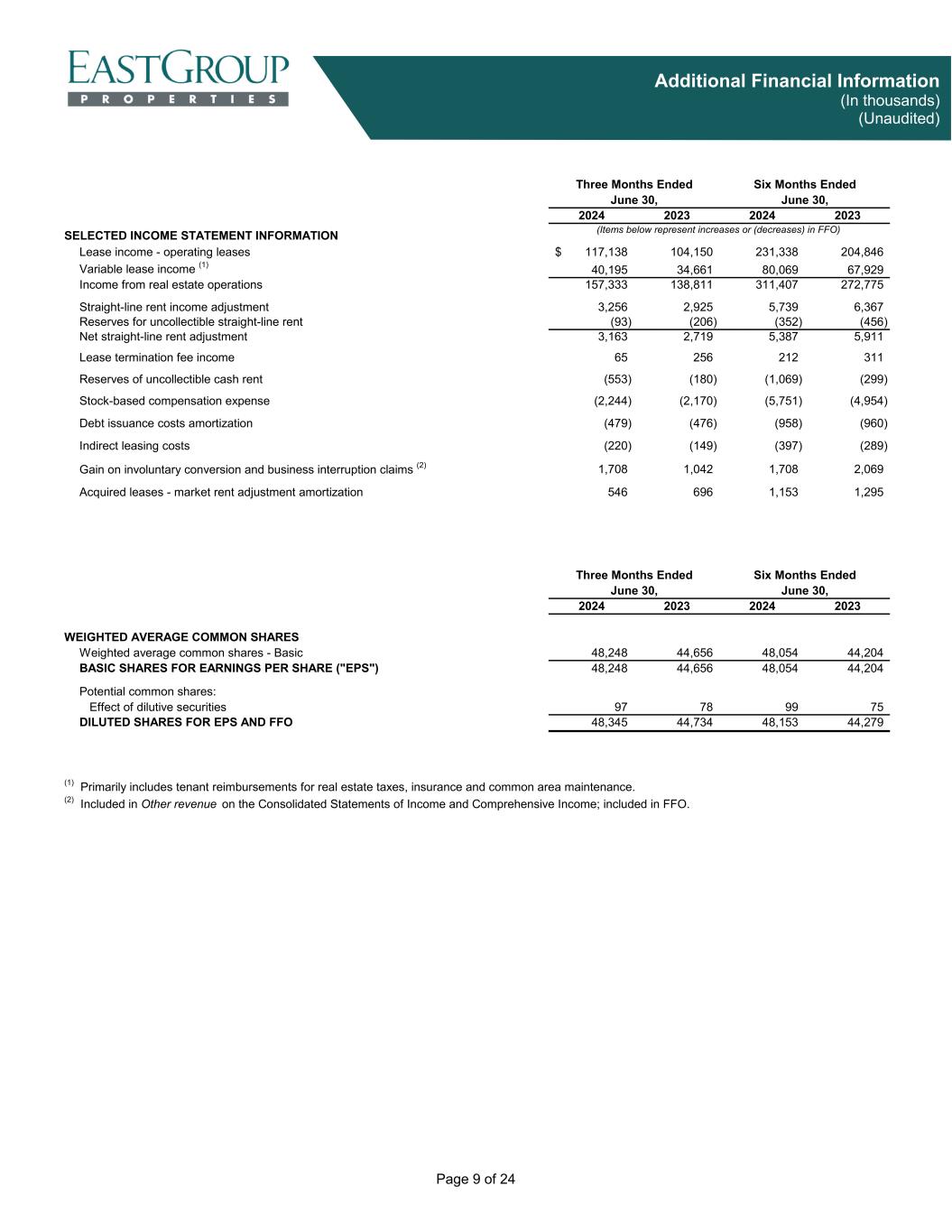Page 9 of 24 Additional Financial Information (In thousands) (Unaudited) 2024 2023 2024 2023 Lease income - operating leases 117,138$ 104,150 231,338 204,846 Variable lease income (1) 40,195 34,661 80,069 67,929 Income from real estate operations 157,333 138,811 311,407 272,775 Straight-line rent income adjustment 3,256 2,925 5,739 6,367 Reserves for uncollectible straight-line rent (93) (206) (352) (456) Net straight-line rent adjustment 3,163 2,719 5,387 5,911 Lease termination fee income 65 256 212 311 Reserves of uncollectible cash rent (553) (180) (1,069) (299) Stock-based compensation expense (2,244) (2,170) (5,751) (4,954) Debt issuance costs amortization (479) (476) (958) (960) Indirect leasing costs (220) (149) (397) (289) Gain on involuntary conversion and business interruption claims (2) 1,708 1,042 1,708 2,069 Acquired leases - market rent adjustment amortization 546 696 1,153 1,295 2024 2023 2024 2023 WEIGHTED AVERAGE COMMON SHARES Weighted average common shares - Basic 48,248 44,656 48,054 44,204 BASIC SHARES FOR EARNINGS PER SHARE ("EPS") 48,248 44,656 48,054 44,204 Potential common shares: Effect of dilutive securities 97 78 99 75 DILUTED SHARES FOR EPS AND FFO 48,345 44,734 48,153 44,279 (1) Primarily includes tenant reimbursements for real estate taxes, insurance and common area maintenance. (2) Included in Other revenue on the Consolidated Statements of Income and Comprehensive Income; included in FFO. (Items below represent increases or (decreases) in FFO) June 30, Three Months Ended Three Months Ended June 30, Six Months Ended June 30, Six Months Ended June 30, SELECTED INCOME STATEMENT INFORMATION