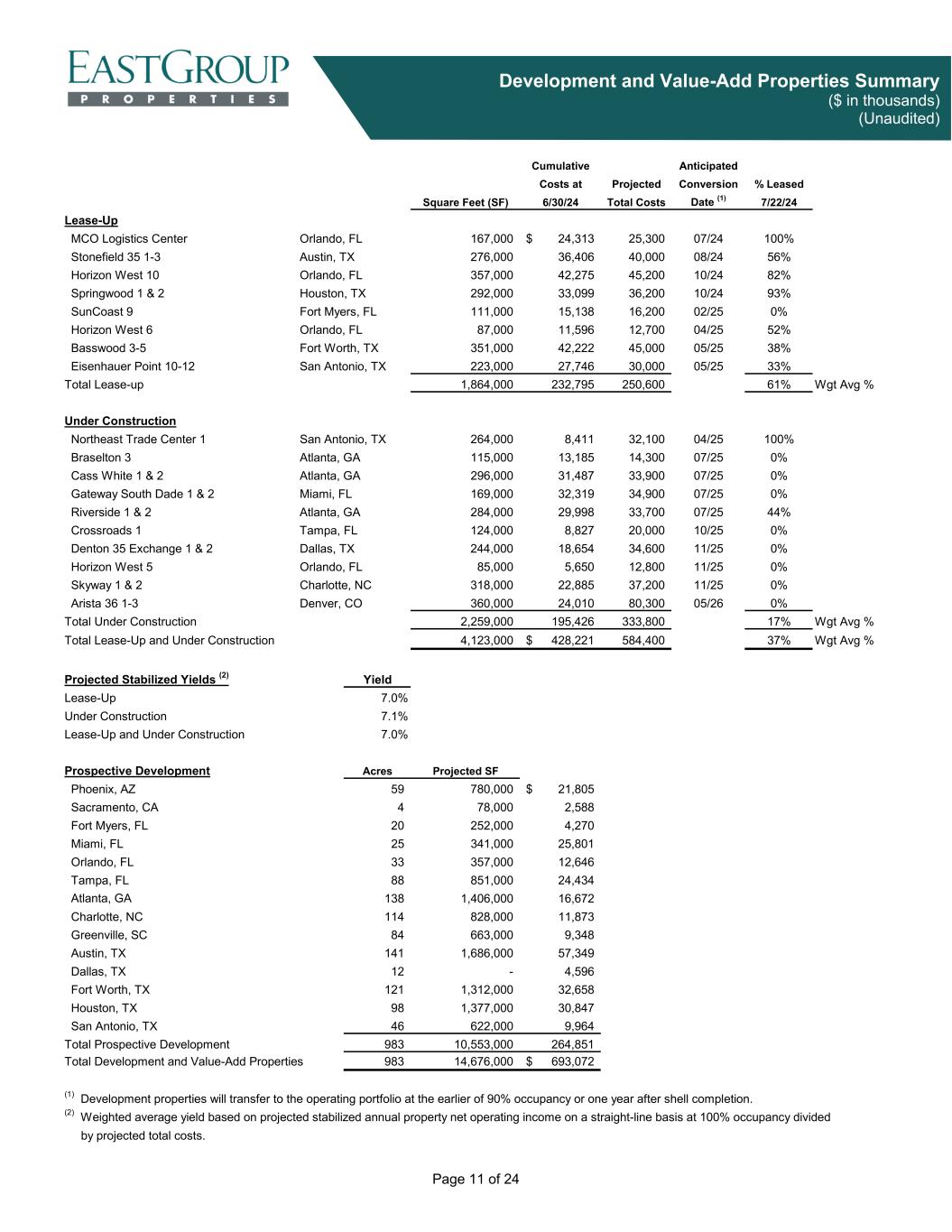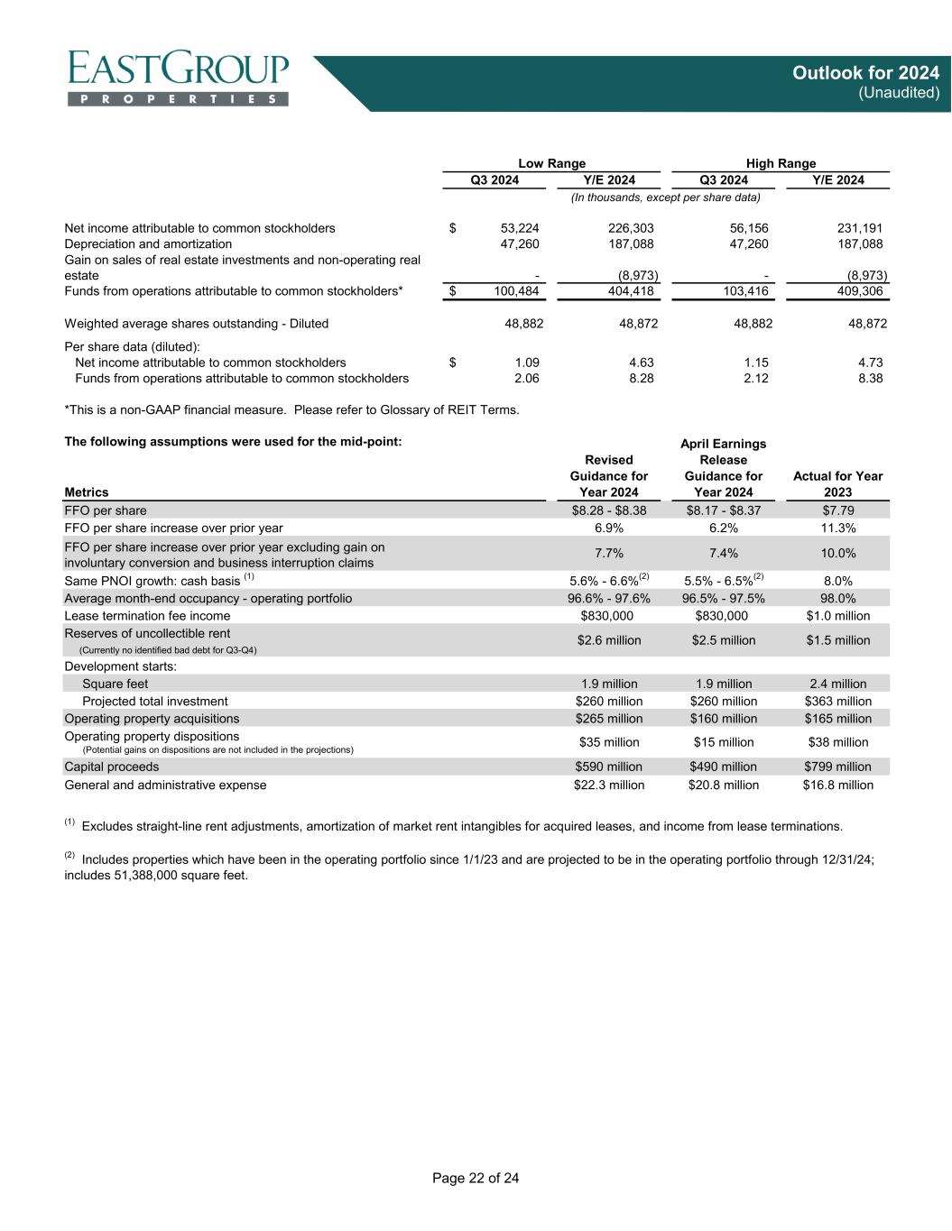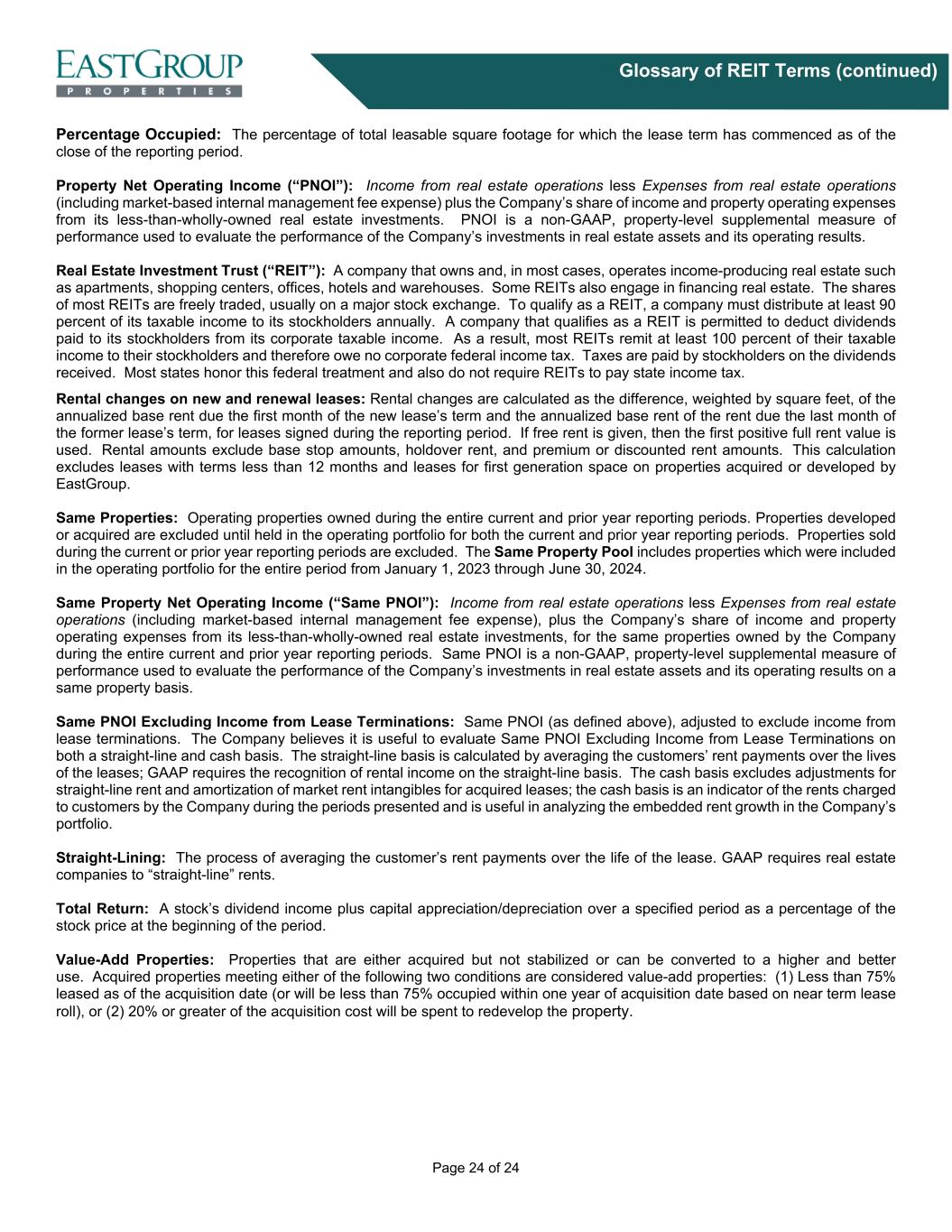 Page 24 of 24 Glossary of REIT Terms (continued) Percentage Occupied: The percentage of total leasable square footage for which the lease term has commenced as of the close of the reporting period. Property Net Operating Income (“PNOI”): Income from real estate operations less Expenses from real estate operations (including market-based internal management fee expense) plus the Company’s share of income and property operating expenses from its less-than-wholly-owned real estate investments. PNOI is a non-GAAP, property-level supplemental measure of performance used to evaluate the performance of the Company’s investments in real estate assets and its operating results. Real Estate Investment Trust (“REIT”): A company that owns and, in most cases, operates income-producing real estate such as apartments, shopping centers, offices, hotels and warehouses. Some REITs also engage in financing real estate. The shares of most REITs are freely traded, usually on a major stock exchange. To qualify as a REIT, a company must distribute at least 90 percent of its taxable income to its stockholders annually. A company that qualifies as a REIT is permitted to deduct dividends paid to its stockholders from its corporate taxable income. As a result, most REITs remit at least 100 percent of their taxable income to their stockholders and therefore owe no corporate federal income tax. Taxes are paid by stockholders on the dividends received. Most states honor this federal treatment and also do not require REITs to pay state income tax. Rental changes on new and renewal leases: Rental changes are calculated as the difference, weighted by square feet, of the annualized base rent due the first month of the new lease’s term and the annualized base rent of the rent due the last month of the former lease’s term, for leases signed during the reporting period. If free rent is given, then the first positive full rent value is used. Rental amounts exclude base stop amounts, holdover rent, and premium or discounted rent amounts. This calculation excludes leases with terms less than 12 months and leases for first generation space on properties acquired or developed by EastGroup. Same Properties: Operating properties owned during the entire current and prior year reporting periods. Properties developed or acquired are excluded until held in the operating portfolio for both the current and prior year reporting periods. Properties sold during the current or prior year reporting periods are excluded. The Same Property Pool includes properties which were included in the operating portfolio for the entire period from January 1, 2023 through June 30, 2024. Same Property Net Operating Income (“Same PNOI”): Income from real estate operations less Expenses from real estate operations (including market-based internal management fee expense), plus the Company’s share of income and property operating expenses from its less-than-wholly-owned real estate investments, for the same properties owned by the Company during the entire current and prior year reporting periods. Same PNOI is a non-GAAP, property-level supplemental measure of performance used to evaluate the performance of the Company’s investments in real estate assets and its operating results on a same property basis. Same PNOI Excluding Income from Lease Terminations: Same PNOI (as defined above), adjusted to exclude income from lease terminations. The Company believes it is useful to evaluate Same PNOI Excluding Income from Lease Terminations on both a straight-line and cash basis. The straight-line basis is calculated by averaging the customers’ rent payments over the lives of the leases; GAAP requires the recognition of rental income on the straight-line basis. The cash basis excludes adjustments for straight-line rent and amortization of market rent intangibles for acquired leases; the cash basis is an indicator of the rents charged to customers by the Company during the periods presented and is useful in analyzing the embedded rent growth in the Company’s portfolio. Straight-Lining: The process of averaging the customer’s rent payments over the life of the lease. GAAP requires real estate companies to “straight-line” rents. Total Return: A stock’s dividend income plus capital appreciation/depreciation over a specified period as a percentage of the stock price at the beginning of the period. Value-Add Properties: Properties that are either acquired but not stabilized or can be converted to a higher and better use. Acquired properties meeting either of the following two conditions are considered value-add properties: (1) Less than 75% leased as of the acquisition date (or will be less than 75% occupied within one year of acquisition date based on near term lease roll), or (2) 20% or greater of the acquisition cost will be spent to redevelop the property.