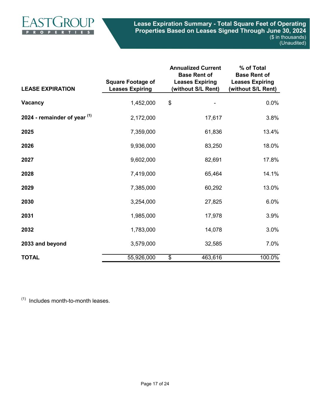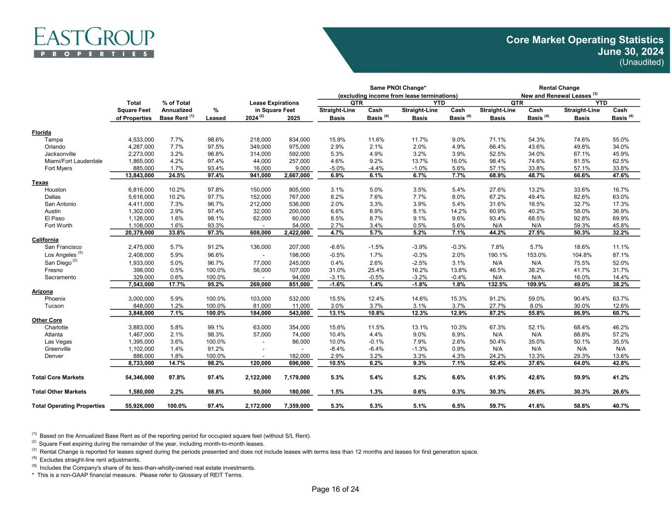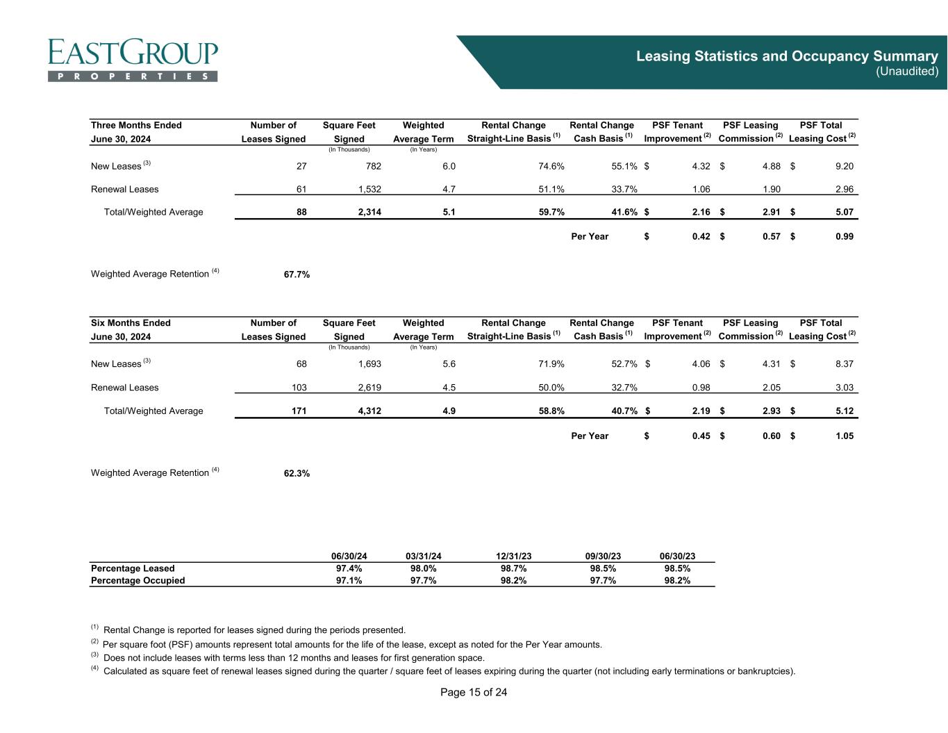 Page 24 of 24 Glossary of REIT Terms (continued) Percentage Occupied: The percentage of total leasable square footage for which the lease term has commenced as of the close of the reporting period. Property Net Operating Income (“PNOI”): Income from real estate operations less Expenses from real estate operations (including market-based internal management fee expense) plus the Company’s share of income and property operating expenses from its less-than-wholly-owned real estate investments. PNOI is a non-GAAP, property-level supplemental measure of performance used to evaluate the performance of the Company’s investments in real estate assets and its operating results. Real Estate Investment Trust (“REIT”): A company that owns and, in most cases, operates income-producing real estate such as apartments, shopping centers, offices, hotels and warehouses. Some REITs also engage in financing real estate. The shares of most REITs are freely traded, usually on a major stock exchange. To qualify as a REIT, a company must distribute at least 90 percent of its taxable income to its stockholders annually. A company that qualifies as a REIT is permitted to deduct dividends paid to its stockholders from its corporate taxable income. As a result, most REITs remit at least 100 percent of their taxable income to their stockholders and therefore owe no corporate federal income tax. Taxes are paid by stockholders on the dividends received. Most states honor this federal treatment and also do not require REITs to pay state income tax. Rental changes on new and renewal leases: Rental changes are calculated as the difference, weighted by square feet, of the annualized base rent due the first month of the new lease’s term and the annualized base rent of the rent due the last month of the former lease’s term, for leases signed during the reporting period. If free rent is given, then the first positive full rent value is used. Rental amounts exclude base stop amounts, holdover rent, and premium or discounted rent amounts. This calculation excludes leases with terms less than 12 months and leases for first generation space on properties acquired or developed by EastGroup. Same Properties: Operating properties owned during the entire current and prior year reporting periods. Properties developed or acquired are excluded until held in the operating portfolio for both the current and prior year reporting periods. Properties sold during the current or prior year reporting periods are excluded. The Same Property Pool includes properties which were included in the operating portfolio for the entire period from January 1, 2023 through June 30, 2024. Same Property Net Operating Income (“Same PNOI”): Income from real estate operations less Expenses from real estate operations (including market-based internal management fee expense), plus the Company’s share of income and property operating expenses from its less-than-wholly-owned real estate investments, for the same properties owned by the Company during the entire current and prior year reporting periods. Same PNOI is a non-GAAP, property-level supplemental measure of performance used to evaluate the performance of the Company’s investments in real estate assets and its operating results on a same property basis. Same PNOI Excluding Income from Lease Terminations: Same PNOI (as defined above), adjusted to exclude income from lease terminations. The Company believes it is useful to evaluate Same PNOI Excluding Income from Lease Terminations on both a straight-line and cash basis. The straight-line basis is calculated by averaging the customers’ rent payments over the lives of the leases; GAAP requires the recognition of rental income on the straight-line basis. The cash basis excludes adjustments for straight-line rent and amortization of market rent intangibles for acquired leases; the cash basis is an indicator of the rents charged to customers by the Company during the periods presented and is useful in analyzing the embedded rent growth in the Company’s portfolio. Straight-Lining: The process of averaging the customer’s rent payments over the life of the lease. GAAP requires real estate companies to “straight-line” rents. Total Return: A stock’s dividend income plus capital appreciation/depreciation over a specified period as a percentage of the stock price at the beginning of the period. Value-Add Properties: Properties that are either acquired but not stabilized or can be converted to a higher and better use. Acquired properties meeting either of the following two conditions are considered value-add properties: (1) Less than 75% leased as of the acquisition date (or will be less than 75% occupied within one year of acquisition date based on near term lease roll), or (2) 20% or greater of the acquisition cost will be spent to redevelop the property.
