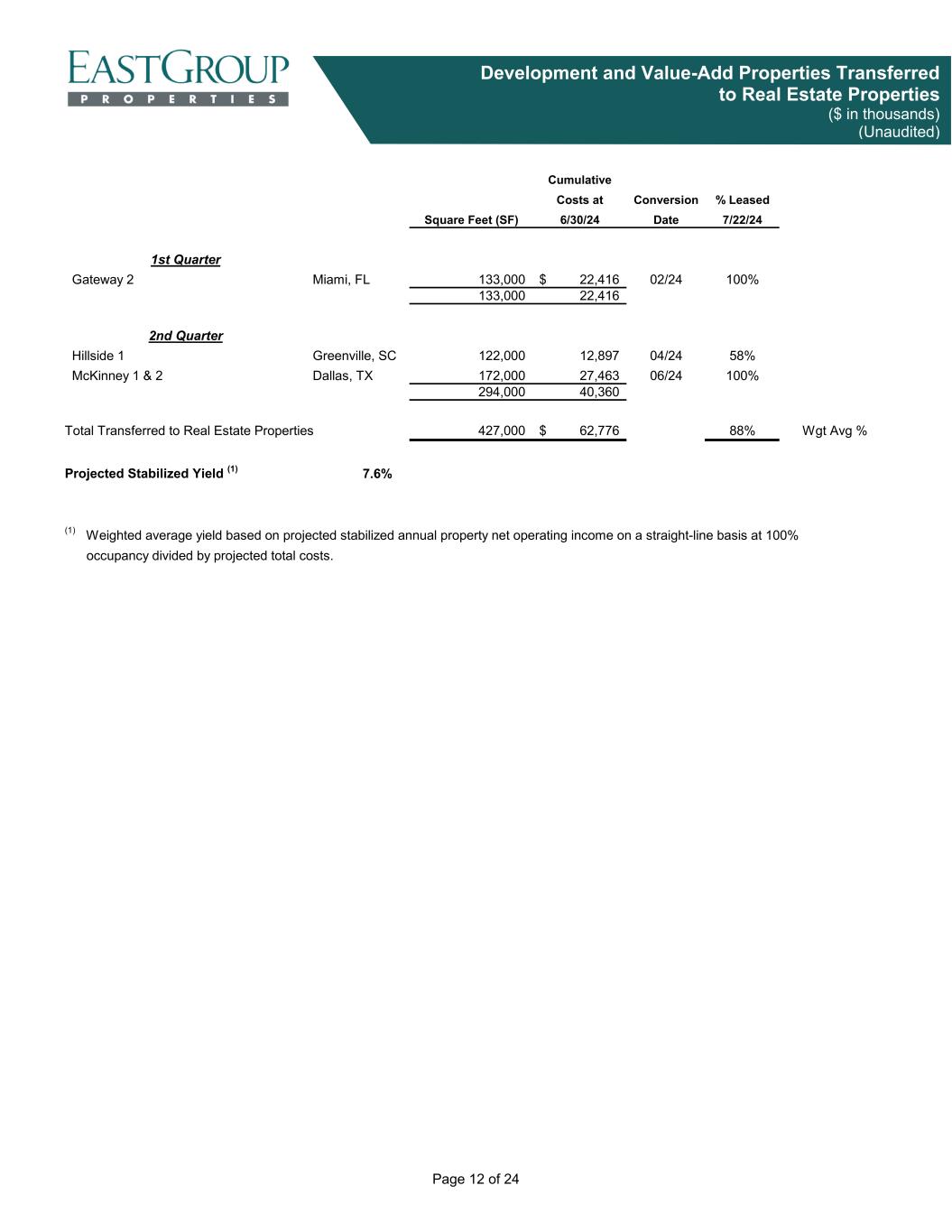 Page 11 of 24 Development and Value-Add Properties Summary ($ in thousands) (Unaudited) Cumulative Anticipated Costs at Projected Conversion % Leased Square Feet (SF) 6/30/24 Total Costs Date (1) 7/22/24 Lease-Up MCO Logistics Center Orlando, FL 167,000 24,313$ 25,300 07/24 100% Stonefield 35 1-3 Austin, TX 276,000 36,406 40,000 08/24 56% Horizon West 10 Orlando, FL 357,000 42,275 45,200 10/24 82% Springwood 1 & 2 Houston, TX 292,000 33,099 36,200 10/24 93% SunCoast 9 Fort Myers, FL 111,000 15,138 16,200 02/25 0% Horizon West 6 Orlando, FL 87,000 11,596 12,700 04/25 52% Basswood 3-5 Fort Worth, TX 351,000 42,222 45,000 05/25 38% Eisenhauer Point 10-12 San Antonio, TX 223,000 27,746 30,000 05/25 33% Total Lease-up 1,864,000 232,795 250,600 61% Wgt Avg % Under Construction Northeast Trade Center 1 San Antonio, TX 264,000 8,411 32,100 04/25 100% Braselton 3 Atlanta, GA 115,000 13,185 14,300 07/25 0% Cass White 1 & 2 Atlanta, GA 296,000 31,487 33,900 07/25 0% Gateway South Dade 1 & 2 Miami, FL 169,000 32,319 34,900 07/25 0% Riverside 1 & 2 Atlanta, GA 284,000 29,998 33,700 07/25 44% Crossroads 1 Tampa, FL 124,000 8,827 20,000 10/25 0% Denton 35 Exchange 1 & 2 Dallas, TX 244,000 18,654 34,600 11/25 0% Horizon West 5 Orlando, FL 85,000 5,650 12,800 11/25 0% Skyway 1 & 2 Charlotte, NC 318,000 22,885 37,200 11/25 0% Arista 36 1-3 Denver, CO 360,000 24,010 80,300 05/26 0% Total Under Construction 2,259,000 195,426 333,800 17% Wgt Avg % Total Lease-Up and Under Construction 4,123,000 428,221$ 584,400 37% Wgt Avg % Projected Stabilized Yields (2) Yield Lease-Up 7.0% Under Construction 7.1% Lease-Up and Under Construction 7.0% Prospective Development Acres Projected SF Phoenix, AZ 59 780,000 21,805$ Sacramento, CA 4 78,000 2,588 Fort Myers, FL 20 252,000 4,270 Miami, FL 25 341,000 25,801 Orlando, FL 33 357,000 12,646 Tampa, FL 88 851,000 24,434 Atlanta, GA 138 1,406,000 16,672 Charlotte, NC 114 828,000 11,873 Greenville, SC 84 663,000 9,348 Austin, TX 141 1,686,000 57,349 Dallas, TX 12 - 4,596 Fort Worth, TX 121 1,312,000 32,658 Houston, TX 98 1,377,000 30,847 San Antonio, TX 46 622,000 9,964 Total Prospective Development 983 10,553,000 264,851 Total Development and Value-Add Properties 983 14,676,000 693,072$ (1) Development properties will transfer to the operating portfolio at the earlier of 90% occupancy or one year after shell completion. (2) Weighted average yield based on projected stabilized annual property net operating income on a straight-line basis at 100% occupancy divided by projected total costs.