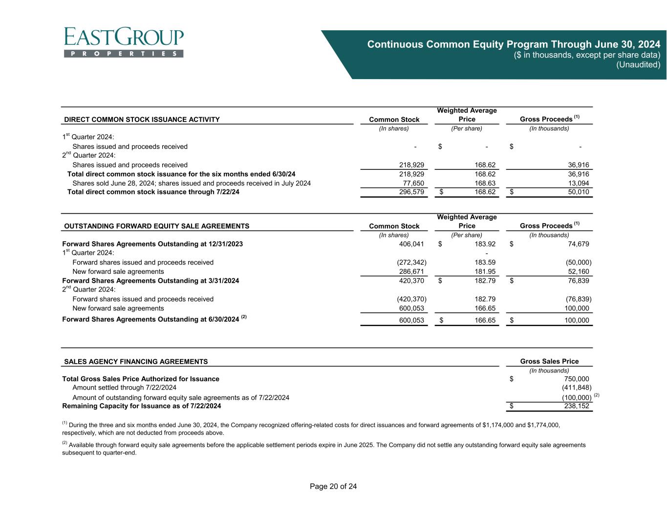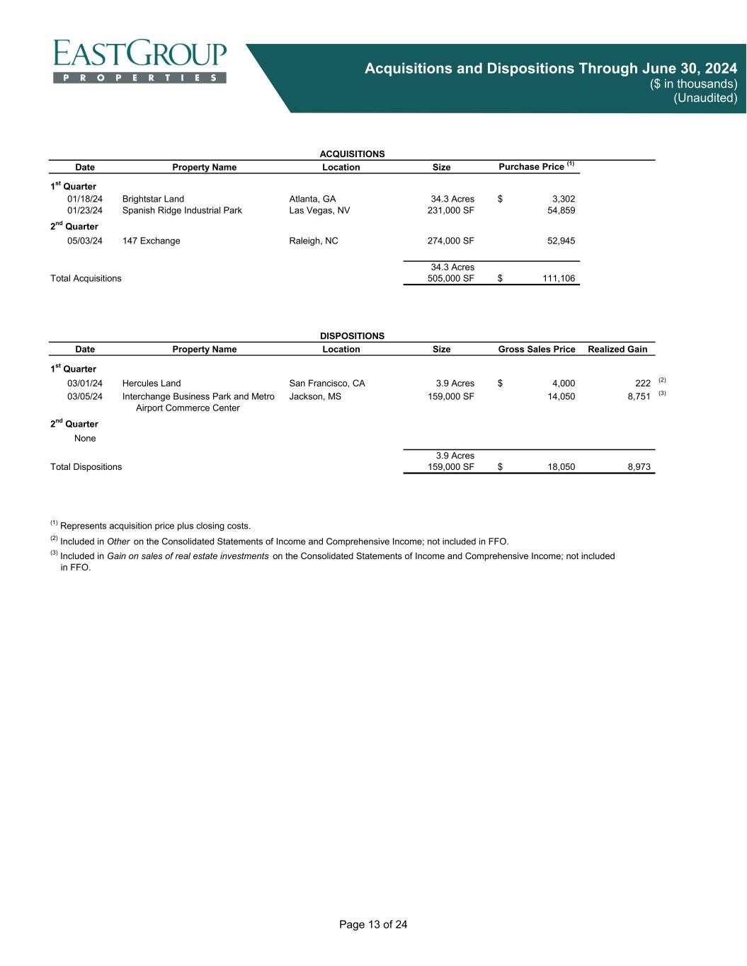 •EastGroup recognized gains on sales of real estate investments of $8,751,000 ($0.18 per share) during the six months ended June 30, 2024, compared to $4,809,000 ($0.11 per share) during the six months ended June 30, 2023.