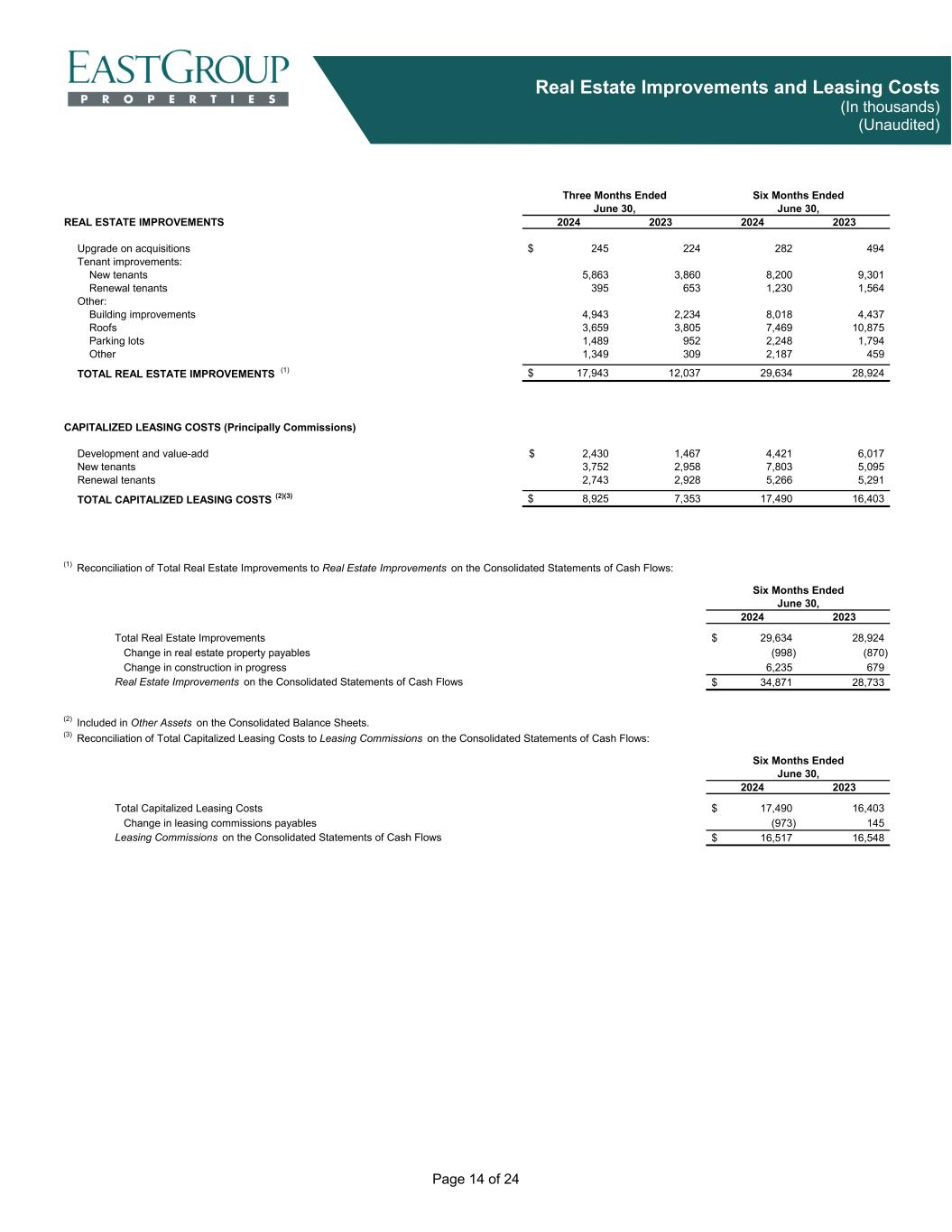 Page 14 of 24 Real Estate Improvements and Leasing Costs (In thousands) (Unaudited) REAL ESTATE IMPROVEMENTS 2024 2023 2024 2023 Upgrade on acquisitions 245$ 224 282 494 Tenant improvements: New tenants 5,863 3,860 8,200 9,301 Renewal tenants 395 653 1,230 1,564 Other: Building improvements 4,943 2,234 8,018 4,437 Roofs 3,659 3,805 7,469 10,875 Parking lots 1,489 952 2,248 1,794 Other 1,349 309 2,187 459 TOTAL REAL ESTATE IMPROVEMENTS (1) 17,943$ 12,037 29,634 28,924 CAPITALIZED LEASING COSTS (Principally Commissions) Development and value-add 2,430$ 1,467 4,421 6,017 New tenants 3,752 2,958 7,803 5,095 Renewal tenants 2,743 2,928 5,266 5,291 TOTAL CAPITALIZED LEASING COSTS (2)(3) 8,925$ 7,353 17,490 16,403 (1) Reconciliation of Total Real Estate Improvements to Real Estate Improvements on the Consolidated Statements of Cash Flows: 2024 2023 Total Real Estate Improvements 29,634$ 28,924 Change in real estate property payables (998) (870) Change in construction in progress 6,235 679 34,871$ 28,733 (2) Included in Other Assets on the Consolidated Balance Sheets. (3) Reconciliation of Total Capitalized Leasing Costs to Leasing Commissions on the Consolidated Statements of Cash Flows: 2024 2023 Total Capitalized Leasing Costs 17,490$ 16,403 Change in leasing commissions payables (973) 145 16,517$ 16,548 Six Months Ended June 30, Leasing Commissions on the Consolidated Statements of Cash Flows June 30, Real Estate Improvements on the Consolidated Statements of Cash Flows Six Months Ended June 30, Six Months EndedThree Months Ended June 30,