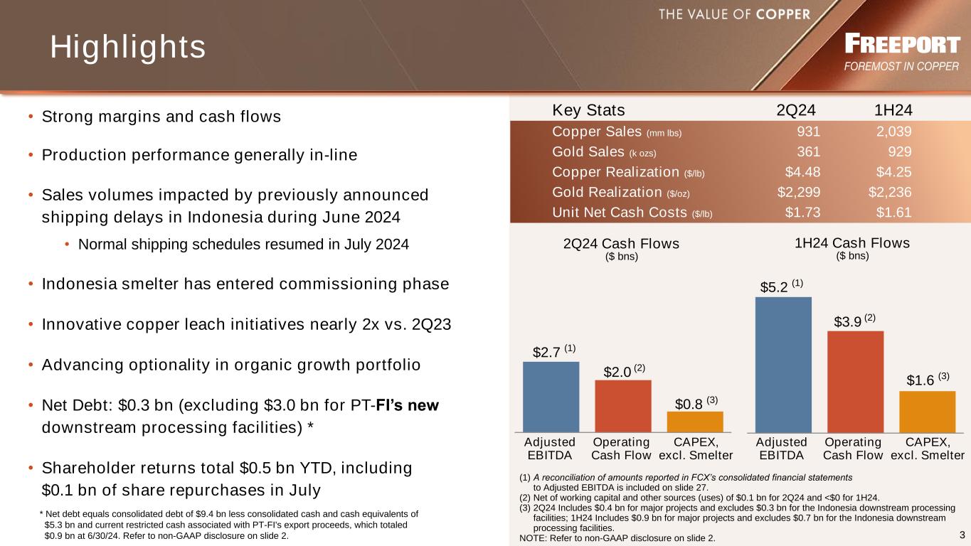 2 This presentation contains forward-looking statements in which FCX discusses its potential future performance, operations and projects. Forward-looking statements are all statements other than statements of historical facts, such as plans, projections, or expectations relating to business outlook, strategy, goals or targets; global market conditions; ore grades and milling rates; production and sales volumes; unit net cash costs (credits) and operating costs; capital expenditures; operating plans (including mine sequencing); cash flows; liquidity; PT Freeport’s (PT-FI) commissioning and ramp up of its new smelter and completion and full production at the precious metals refinery (PMR) (collectively, the new downstream processing facilities); potential extension of PT-FI’s IUPK beyond 2041; export licenses; export duties; export volumes; timing of shipments of inventoried production; FCX’s commitment to deliver responsibly produced copper and molybdenum, including plans to implement, validate and maintain validation of its operating sites under specific frameworks; execution of FCX’s energy and climate strategies and the underlying assumptions and estimated impacts on FCX’s business and stakeholders related thereto; achievement of 2030 climate targets and 2050 net zero aspiration; improvements in operating procedures and technology innovations and applications; exploration efforts and results; development and production activities, rates and costs; future organic growth opportunities; tax rates; the impact of copper, gold and molybdenum price changes; the impact of deferred intercompany profits on earnings; mineral reserve and mineral resource estimates; final resolution of settlements associated with ongoing legal and environmental proceedings; debt repurchases; and the ongoing implementation of FCX’s financial policy and future returns to shareholders, including dividend payments (base or variable) and share repurchases. The words “anticipates,” “may,” “can,” “plans,” “believes,” “estimates,” “expects,” “projects,” “targets,” “intends,” “likely,” “will,” “should,” “could,” “to be,” “potential,” “assumptions,” “guidance,” “aspirations,” “future,” “commitments,” “pursues,” “initiatives,” “objectives,” “opportunities,” “strategy” and any similar expressions are intended to identify those assertions as forward-looking statements. The declaration and payment of dividends (base or variable), and timing and amount of any share repurchases are at the discretion of the Board of Directors (Board) and management, respectively, and are subject to a number of factors, including not exceeding FCX’s net debt target, capital availability, FCX’s financial results, cash requirements, global economic conditions, changes in laws, contractual restrictions and other factors deemed relevant by the Board or management, as applicable. The share repurchase program may be modified, increased, suspended or terminated at any time at the Board’s discretion. FCX cautions readers that forward-looking statements are not guarantees of future performance and actual results may differ materially from those anticipated, expected, projected or assumed in the forward-looking statements. Important factors that can cause FCX’s actual results to differ materially from those anticipated in the forward-looking statements include, but are not limited to, supply of and demand for, and prices of the commodities FCX produces, primarily copper; PT-FI’s ability to continue to export and sell copper concentrates and anode slimes through full ramp-up of its new downstream processing facilities; changes in export duties; achieving full ramp-up of new downstream processing facilities; completion and full production at the PMR; production rates; timing of shipments; price and availability of consumables and components FCX purchases as well as constraints on supply and logistics, and transportation services; changes in FCX’s cash requirements, financial position, financing or investment plans; changes in general market, economic, geopolitical, regulatory or industry conditions; reductions in liquidity and access to capital; changes in tax laws and regulations; political and social risks, including the potential effects of violence in Indonesia, civil unrest in Peru, and relations with local communities and Indigenous Peoples; operational risks inherent in mining, with higher inherent risks in underground mining; mine sequencing; changes in mine plans or operational modifications, delays, deferrals or cancellations, including the ability to smelt and refine; results of technical, economic or feasibility studies; potential inventory adjustments; potential impairment of long-lived mining assets; satisfaction of requirements in accordance with PT-FI’s IUPK to extend mining rights from 2031 through 2041; process relating to the extension of PT-FI’s IUPK beyond 2041; cybersecurity risks; any major public health crisis; labor relations, including labor-related work stoppages and increased costs; compliance with applicable environmental, health and safety laws and regulations; weather- and climate-related risks; environmental risks, including availability of secure water supplies; litigation results; tailings management; FCX’s ability to comply with its responsible production commitments under specific frameworks and any changes to such frameworks and other factors described in more detail under the heading “Risk Factors” in FCX’s Annual Report on Form 10-K for the year ended December 31, 2023, filed with the U.S. Securities and Exchange Commission. Investors are cautioned that many of the assumptions upon which FCX’s forward-looking statements are based are likely to change after the date the forward-looking statements are made, including for example commodity prices, which FCX cannot control, and productio