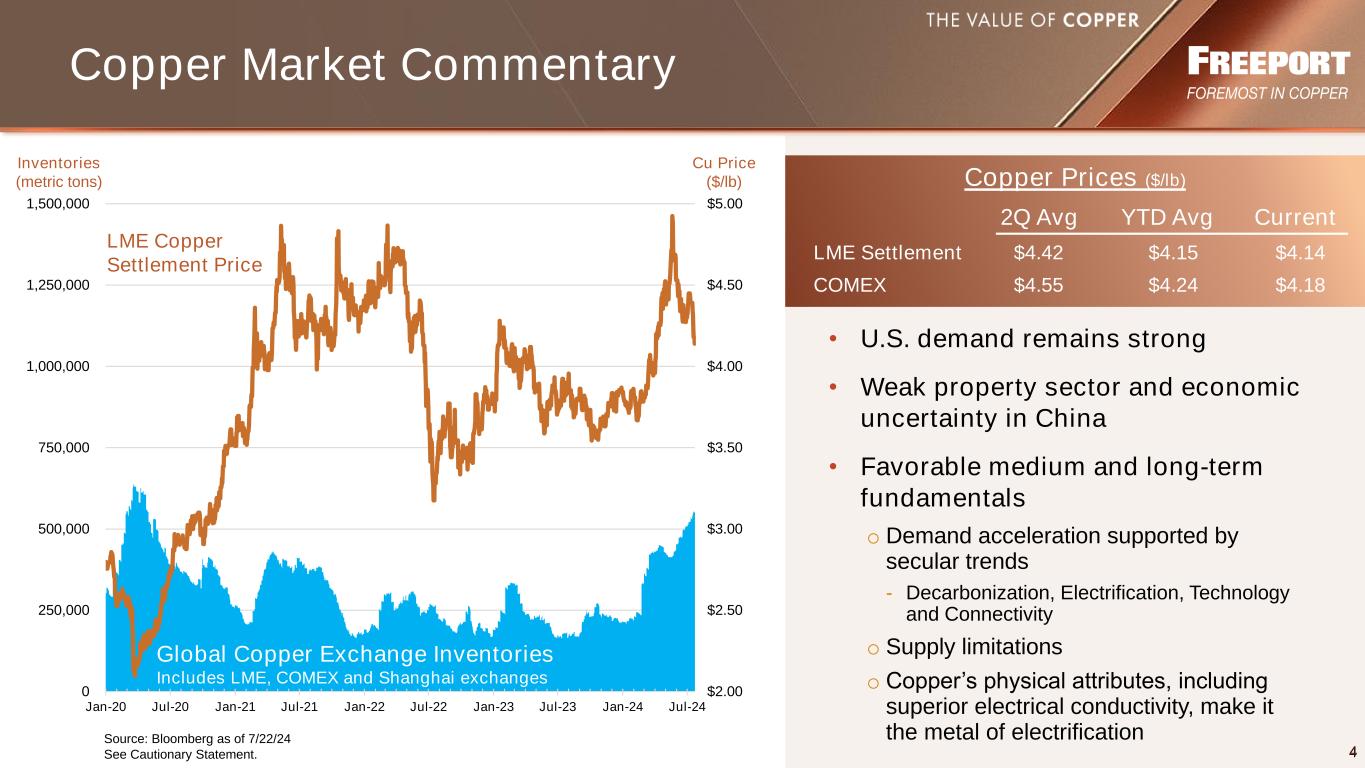3 Highlights • Strong margins and cash flows • Production performance generally in-line • Sales volumes impacted by previously announced shipping delays in Indonesia during June 2024 • Normal shipping schedules resumed in July 2024 • Indonesia smelter has entered commissioning phase • Innovative copper leach initiatives nearly 2x vs. 2Q23 • Advancing optionality in organic growth portfolio • Net Debt: $0.3 bn (excluding $3.0 bn for PT-FI’s new downstream processing facilities) * • Shareholder returns total $0.5 bn YTD, including $0.1 bn of share repurchases in July Key Stats 2Q24 1H24 Copper Sales (mm lbs) 931 2,039 Gold Sales (k ozs) 361 929 Copper Realization ($/lb) $4.48 $4.25 Gold Realization ($/oz) $2,299 $2,236 Unit Net Cash Costs ($/lb) $1.73 $1.61 Operating Cash Flow CAPEX, excl. Smelter $1.6 (3) $3.9 (2) 1H24 Cash Flows ($ bns) (1) A reconciliation of amounts reported in FCX’s consolidated financial statements to Adjusted EBITDA is included on slide 27. (2) Net of working capital and other sources (uses) of $0.1 bn for 2Q24 and <$0 for 1H24. (3) 2Q24 Includes $0.4 bn for major projects and excludes $0.3 bn for the Indonesia downstream processing facilities; 1H24 Includes $0.9 bn for major projects and excludes $0.7 bn for the Indonesia downstream processing facilities. NOTE: Refer to non-GAAP disclosure on slide 2. $5.2 (1) Adjusted EBITDA $0.8 (3) $2.0 (2) 2Q24 Cash Flows ($ bns) $2.7 (1) Operating Cash Flow CAPEX, excl. Smelter Adjusted EBITDA * Net debt equals consolidated debt of $9.4 bn less consolidated cash and cash equivalents of $5.3 bn and current restricted cash associated with PT-FI's export proceeds, which totaled $0.9 bn at 6/30/24. Refer to non-GAAP disclosure on slide 2.